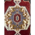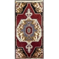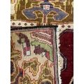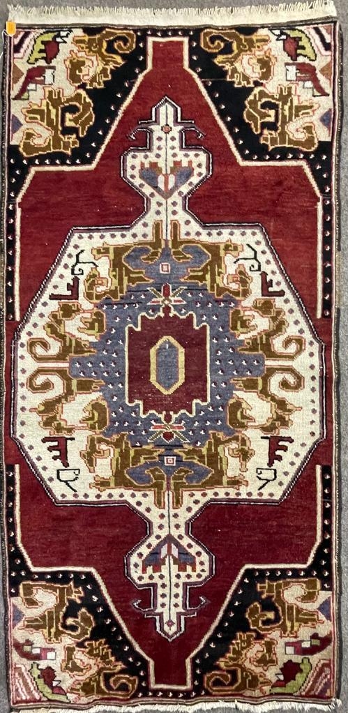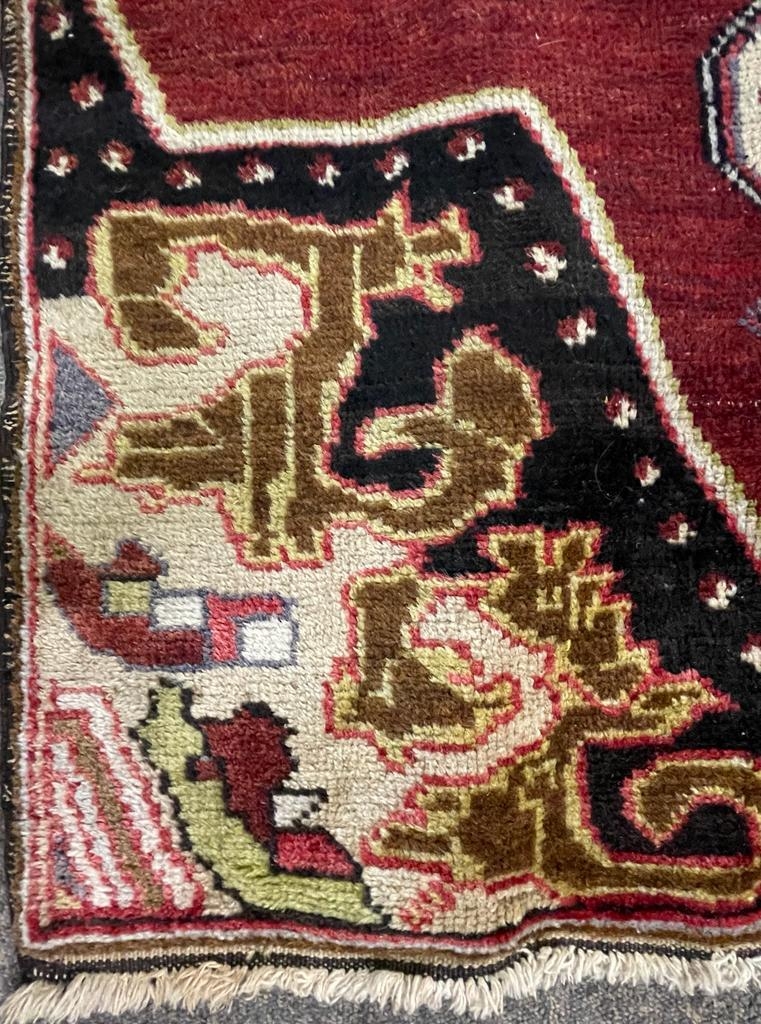 A vintage 20th century 1930s / 40s Turkish Altakula hand knotted floor carpet rug having a geometric shaped central medallion in blue, red & yellow tones enclosed in an outer frame with black ground and polychrome shaped decorations. Measures approx. 195 x 95cm.