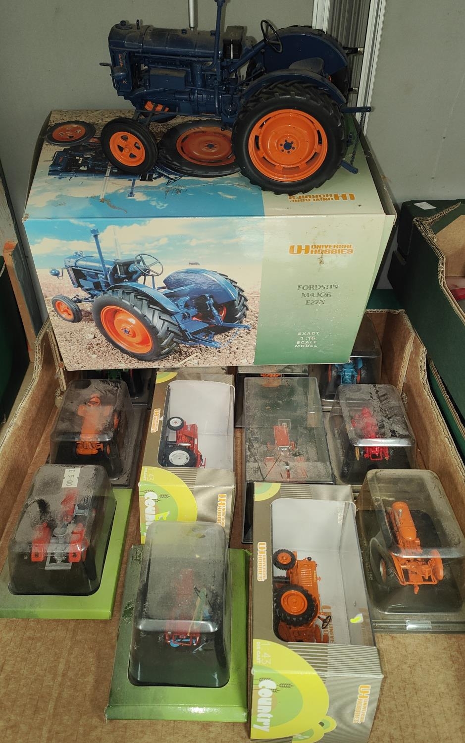 A Universal Hobbies Fordson Major E27N 1:16 scale model with original box, two smaller Universal Hobbies tractors and a selection of 10 other smaller scale tractors