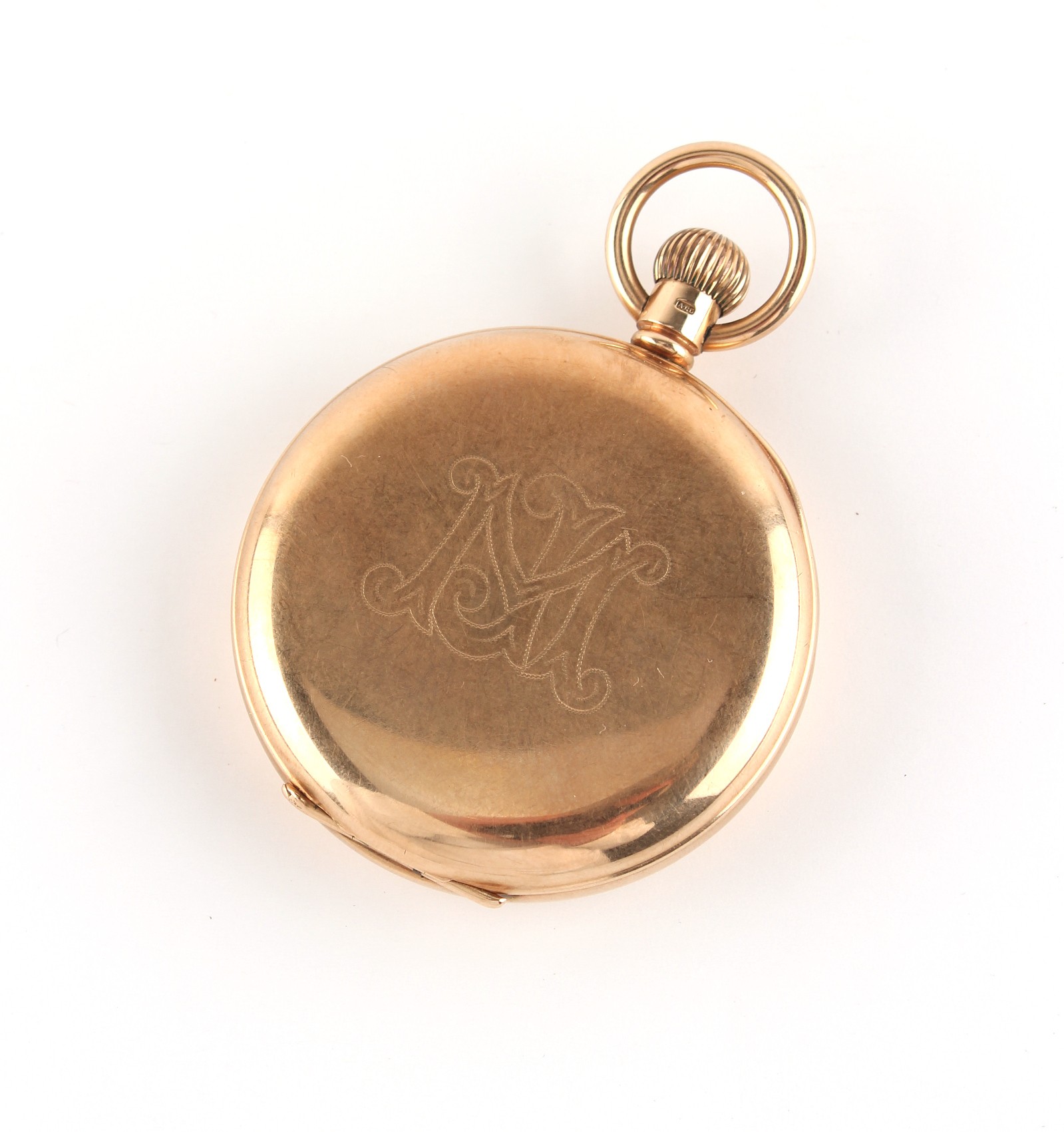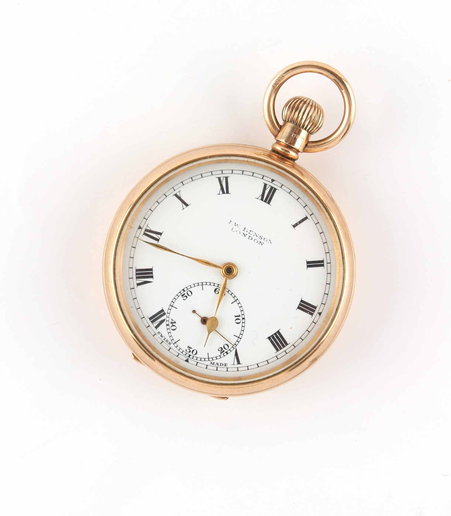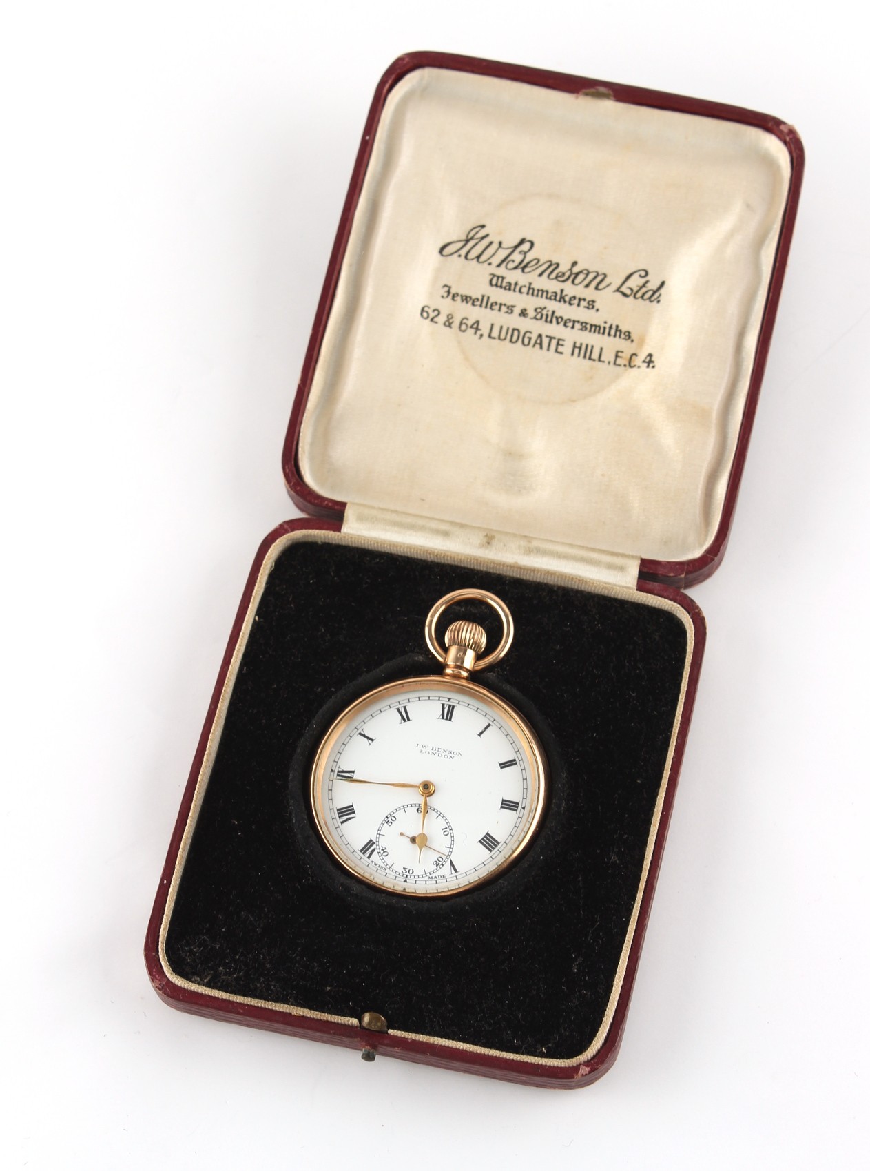 Property of a deceased estate - a 9ct gold open faced pocket watch, keyless wind, with Swiss 15-jewel movement, hallmarked Birmingham 1928, the dust cover also 9ct gold, approximately 86.4 grams, 47mm diameter, appears to be working but no guarantees are given, retailed by J.W. Benson, in original burgundy morocco box.
