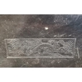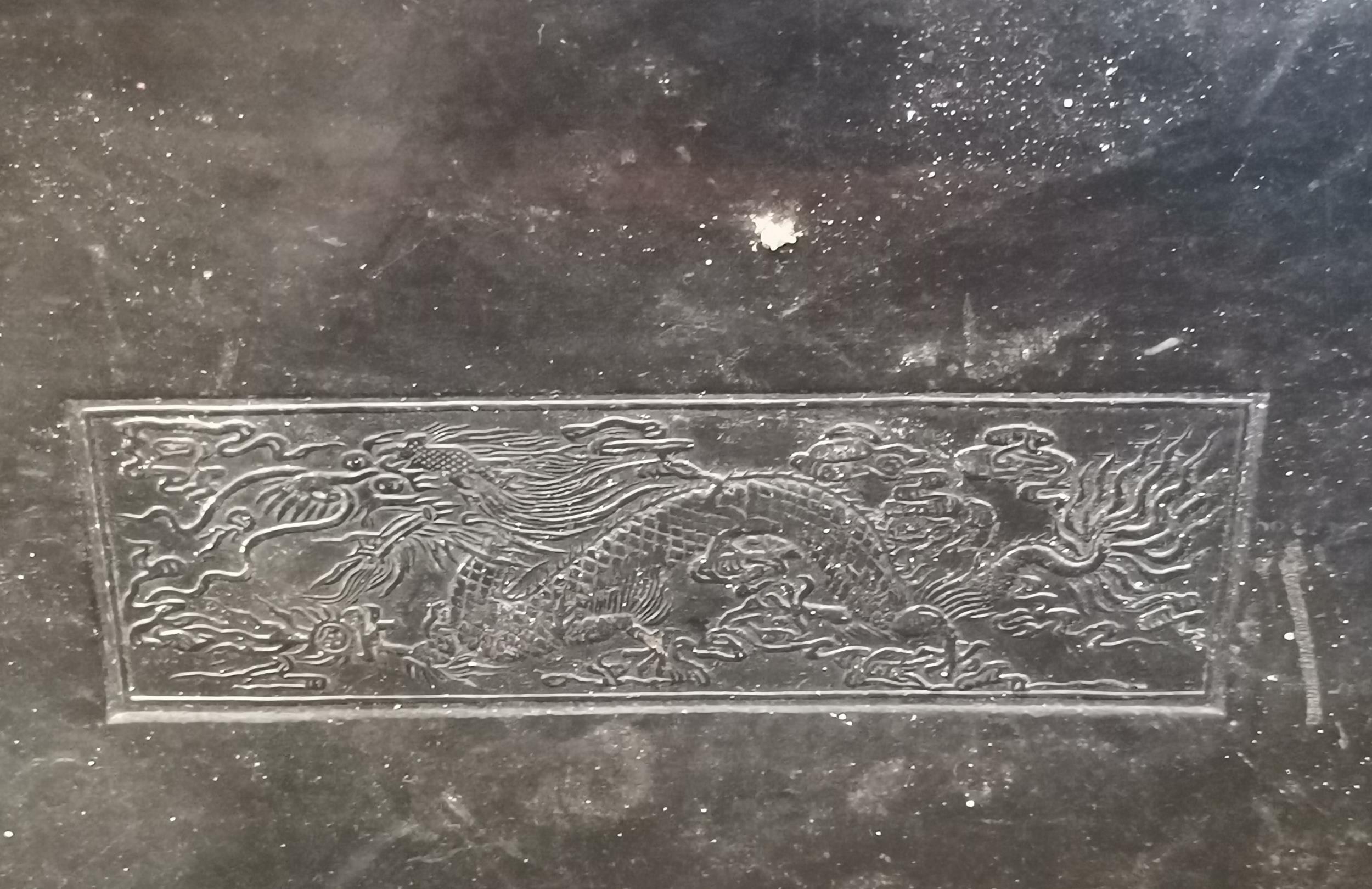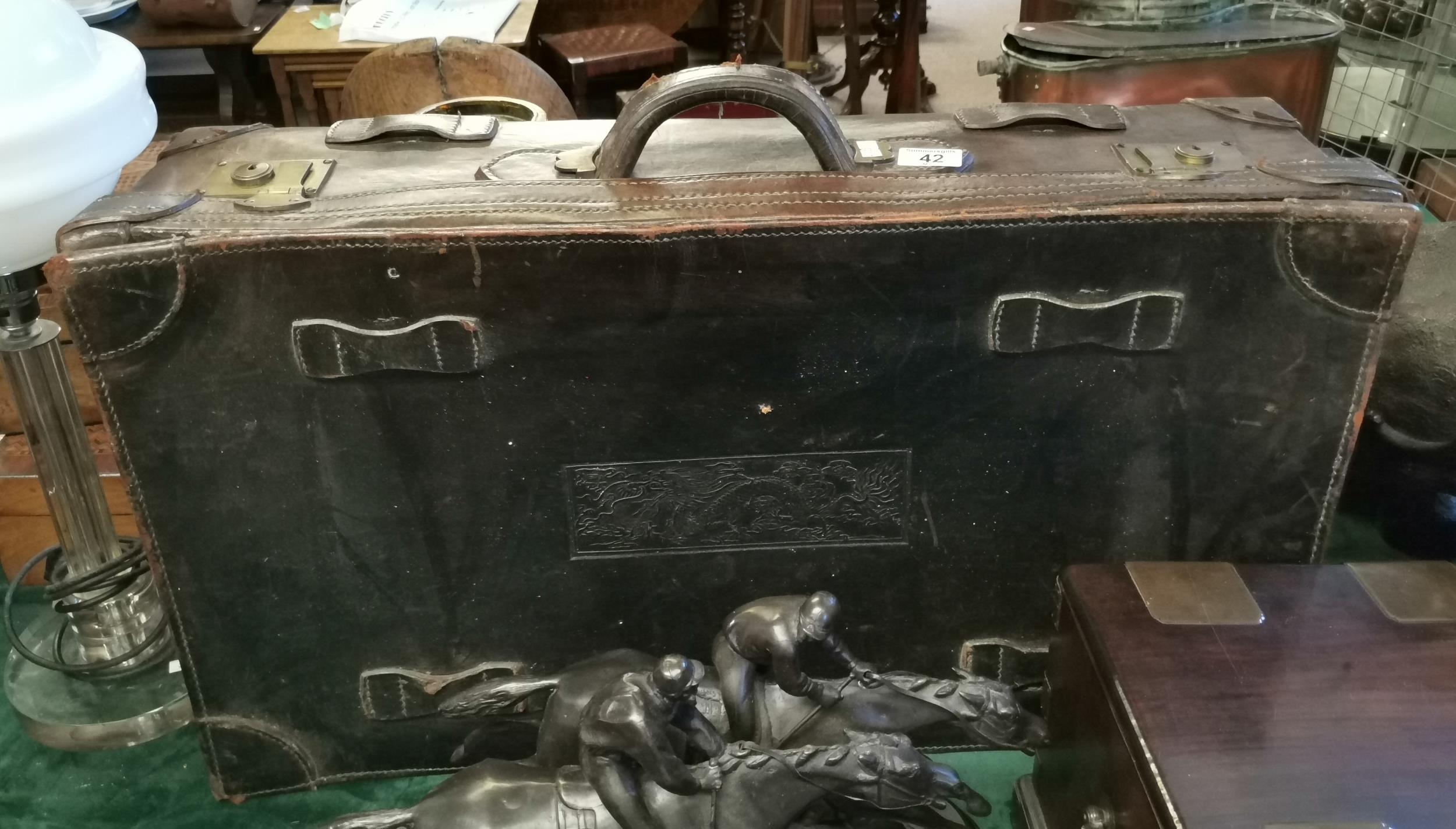 A large vintage leather suitcase, possibly Chinese, with expanding top, the cover embossed with a rectangular panel decorated with a four-toed dragon chasing a flaming pearl. Approx. 42cm high, 76cm wide