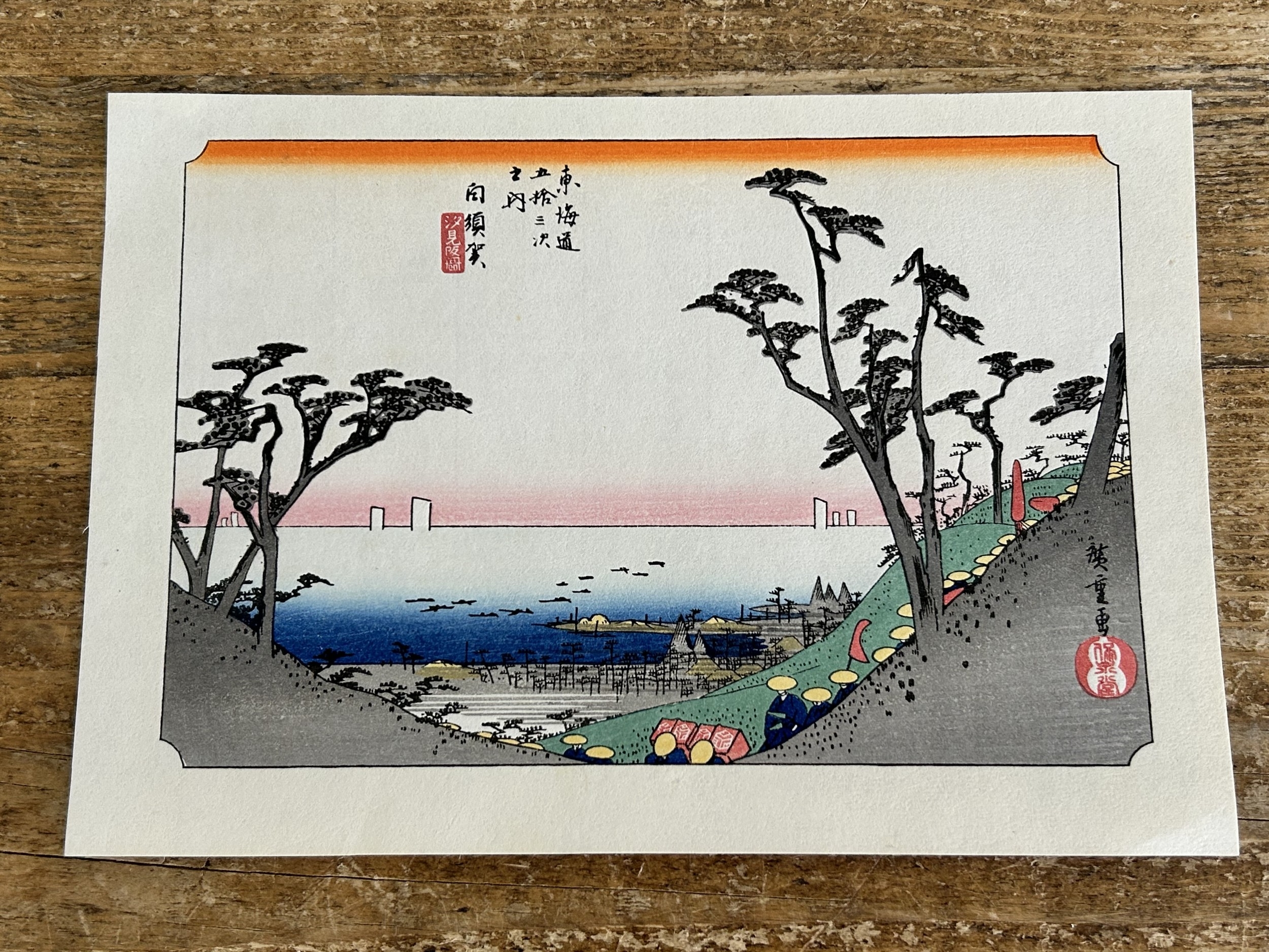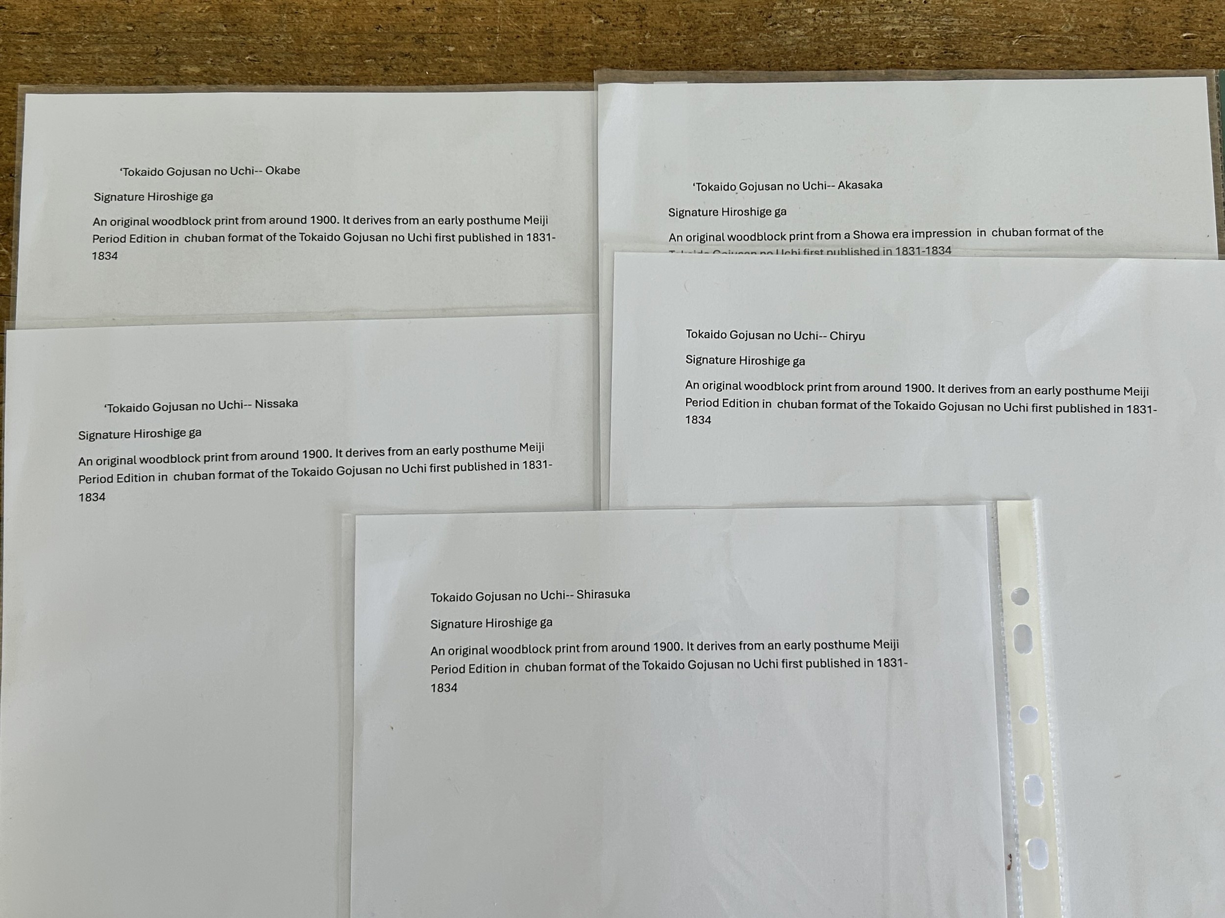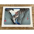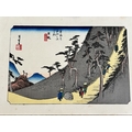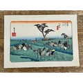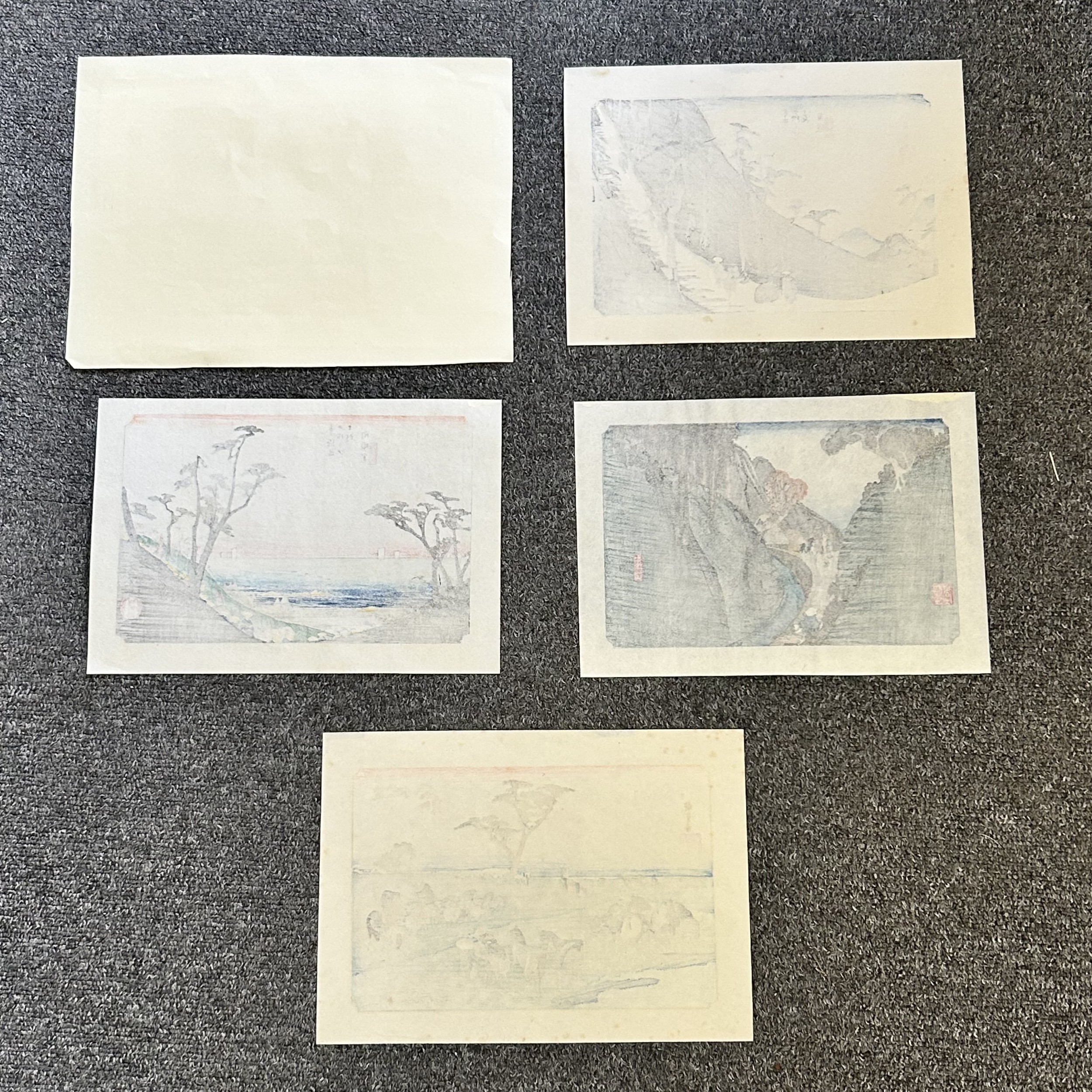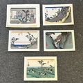 Five antique Japanese woodblock prints believed to be by Utagawa Hiroshige (1797-1858), these apparently dating from circa 1900, each depicting classical Japanese scenes, approx. 8 3/4" x 5 3/4"