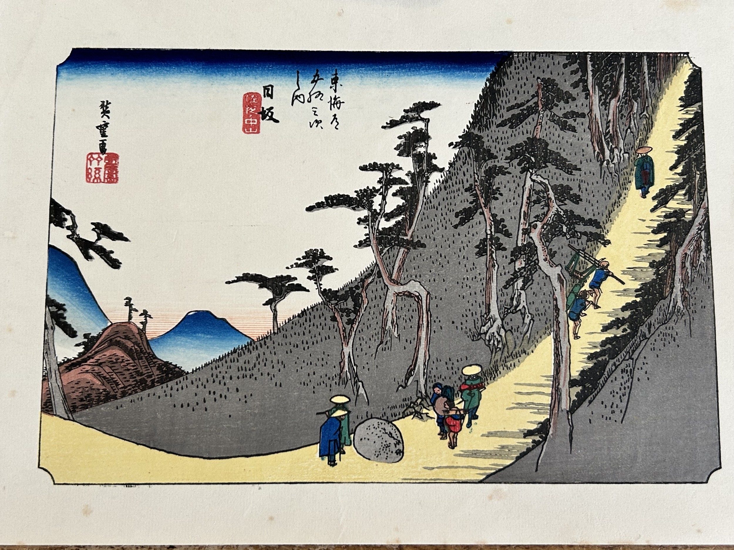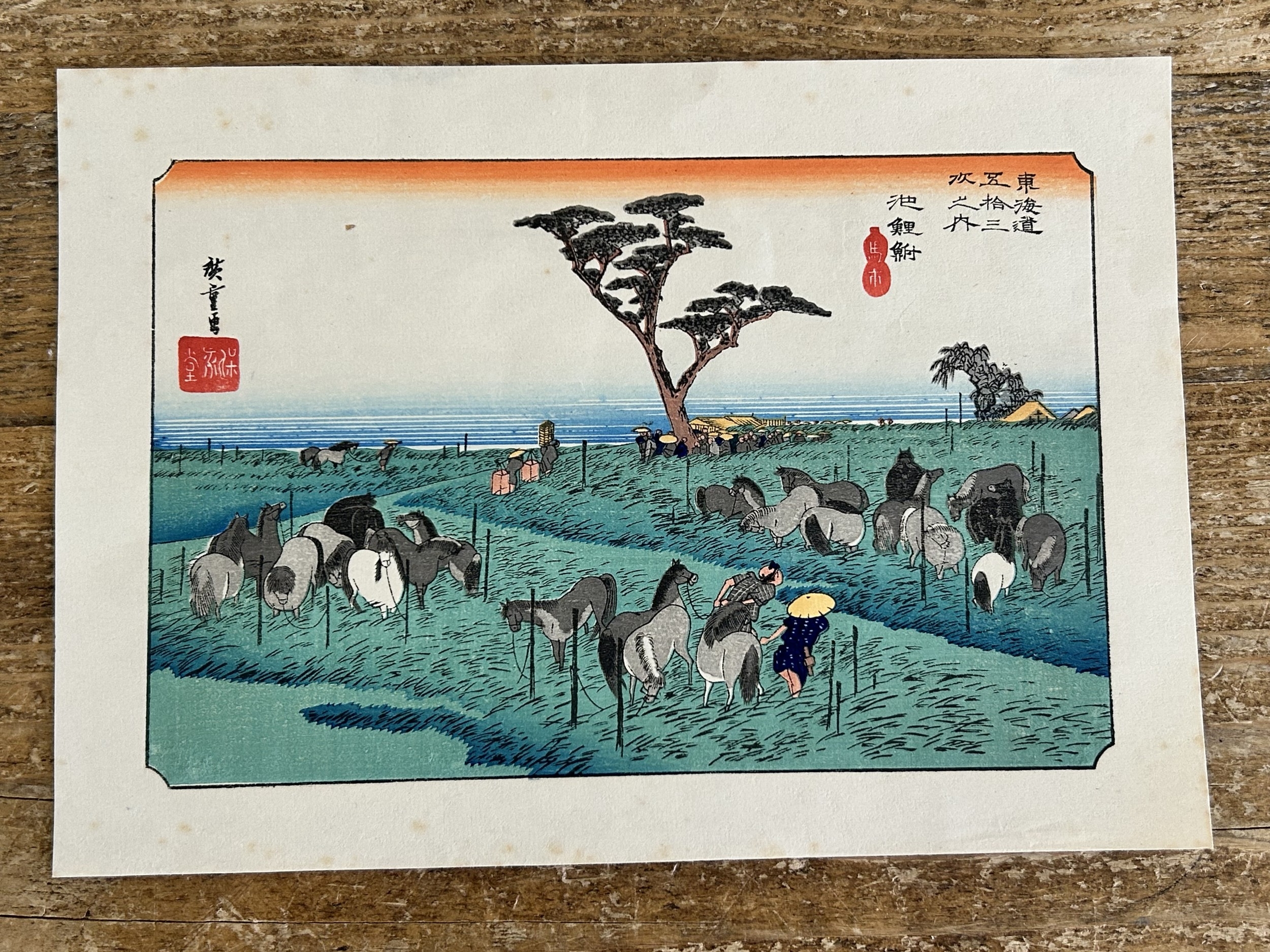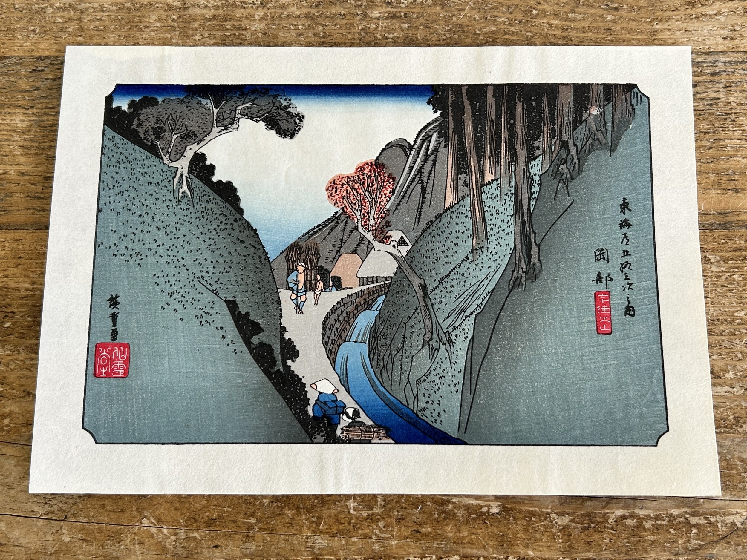Five antique Japanese woodblock prints believed to be by Utagawa Hiroshige (1797-1858), these apparently dating from circa 1900, each depicting classical Japanese scenes, approx. 8 3/4" x 5 3/4"