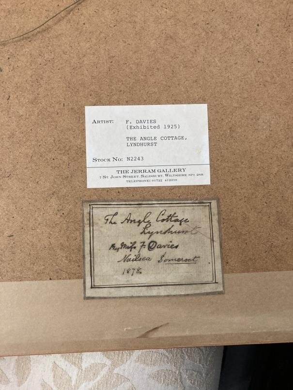 Miss F. Davies. English School: 1878 watercolour The Angle Cottage, Lyndhurst, monogrammed F.D bottom right, label to reverse, framed and glazed. 11ins. x 7½ins.