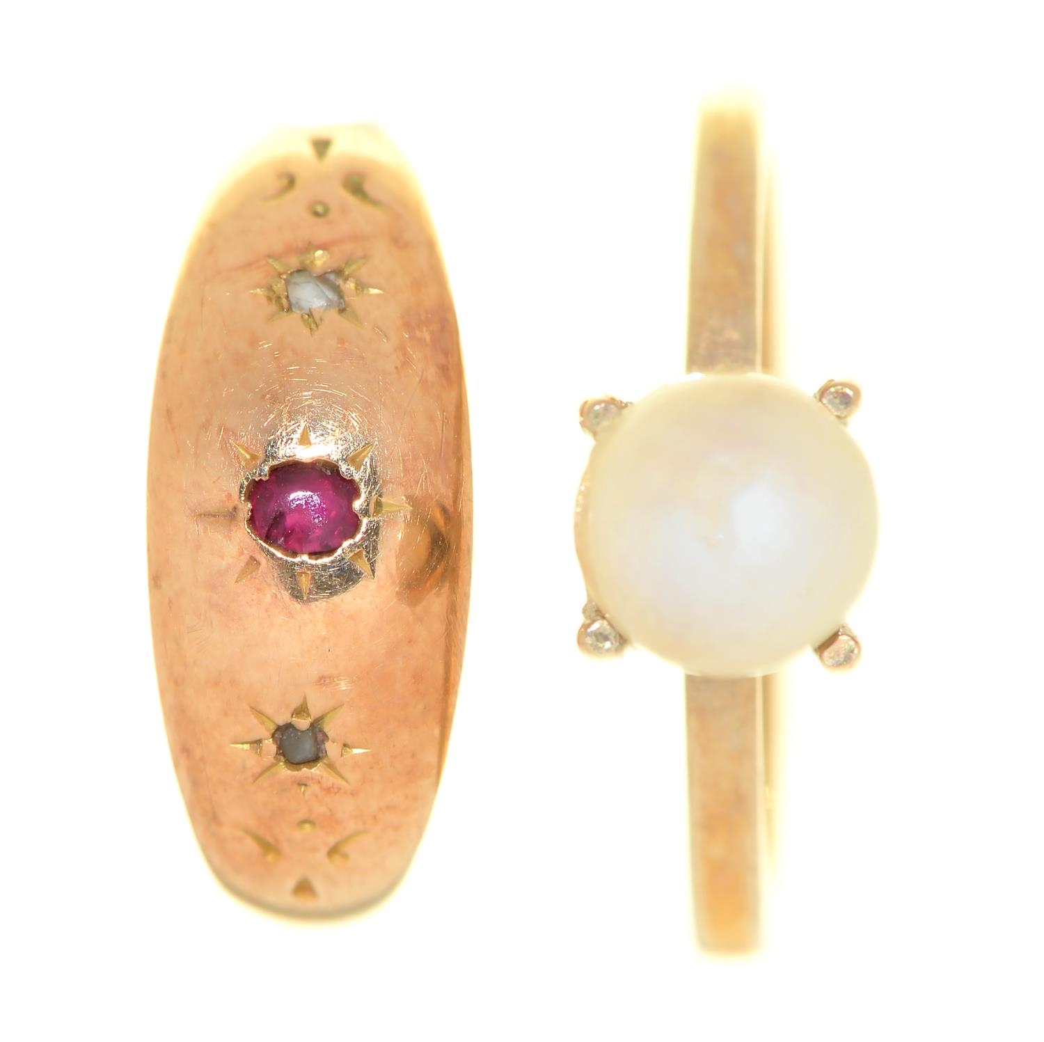 A ruby and diamond ring, gipsy set, in gold, unmarked and a cultured pearl ring in 9ct gold, 1.8 and 2.3g respectively, size L (2)