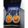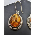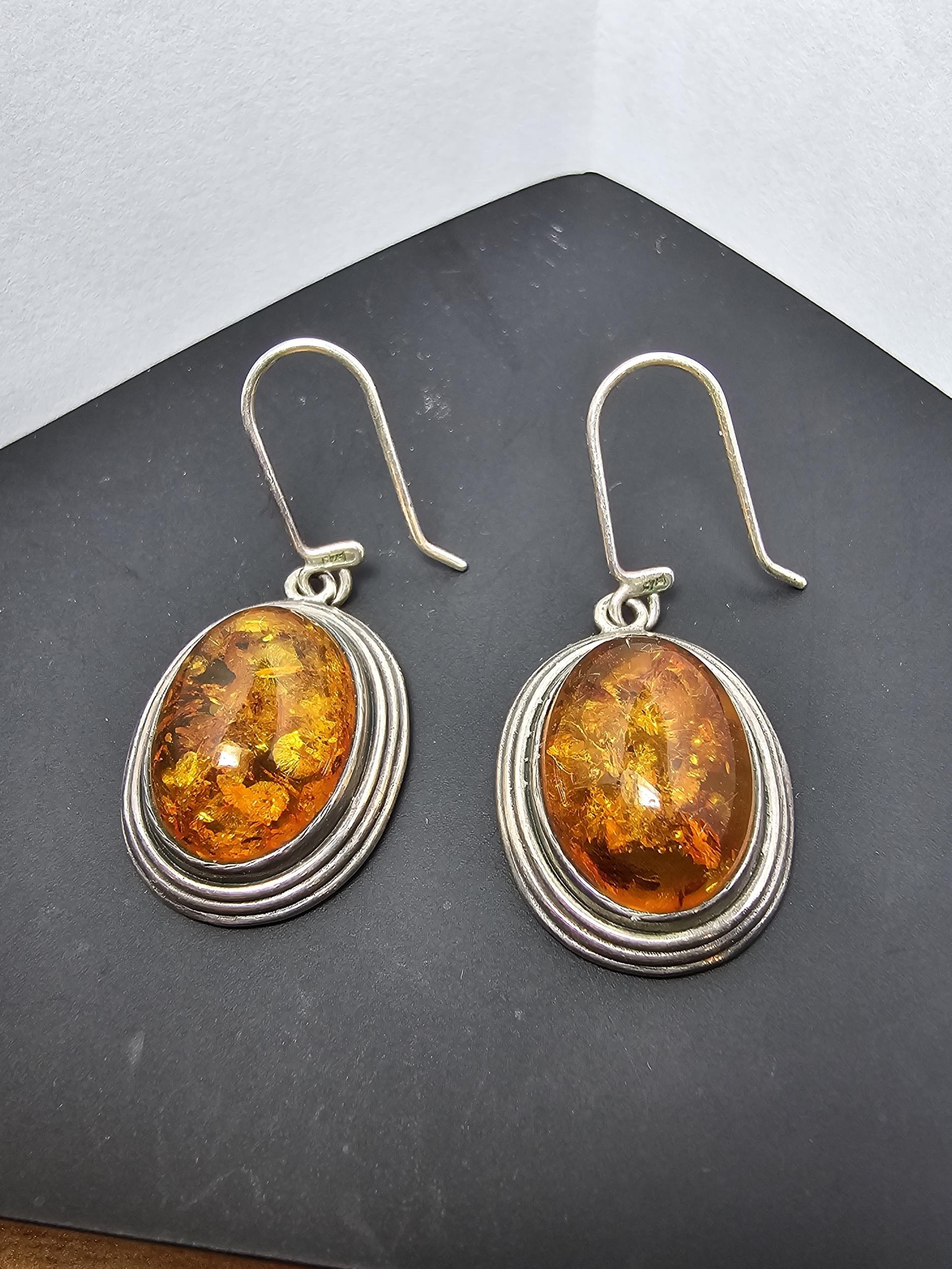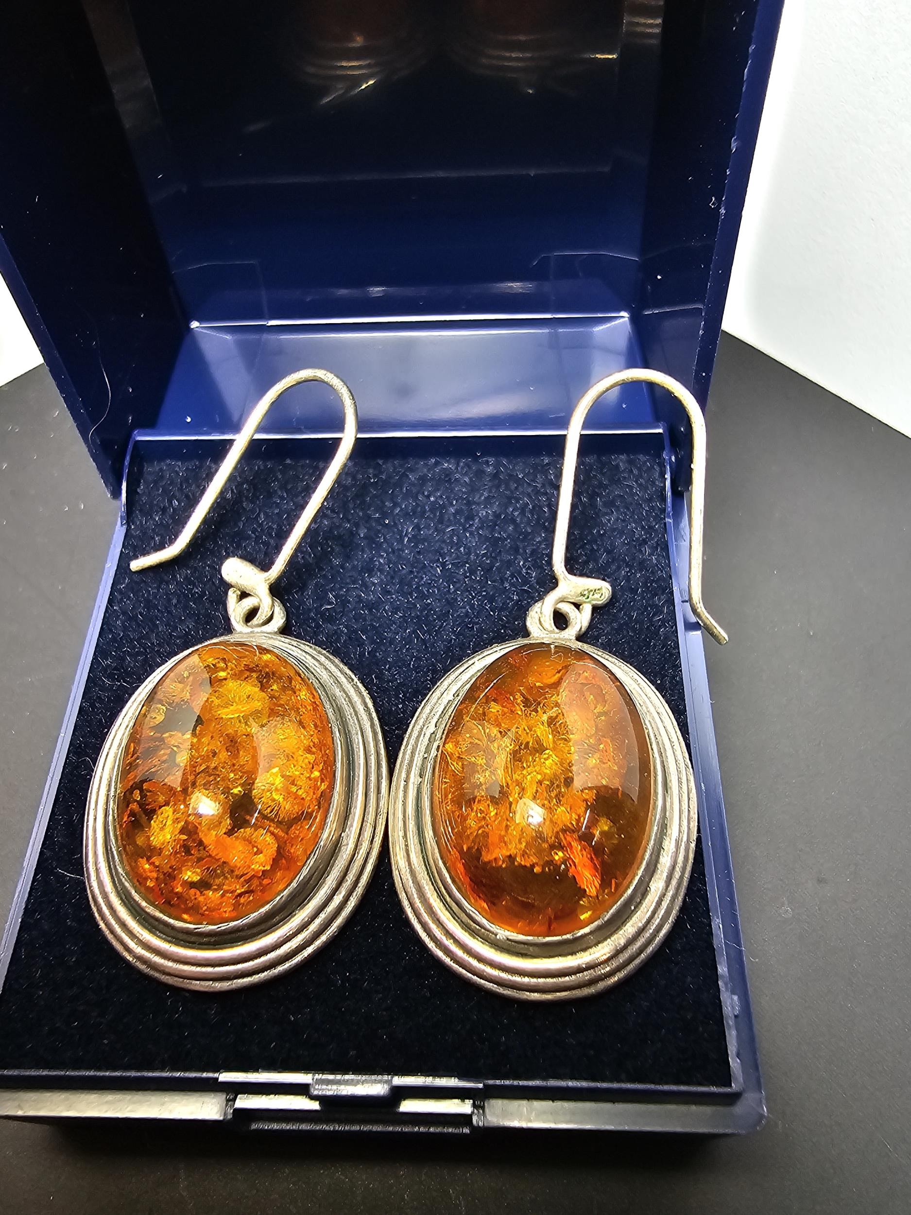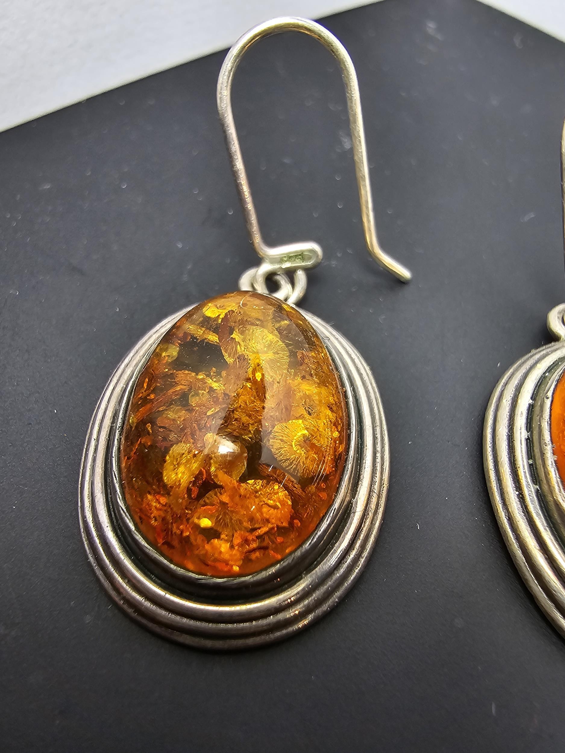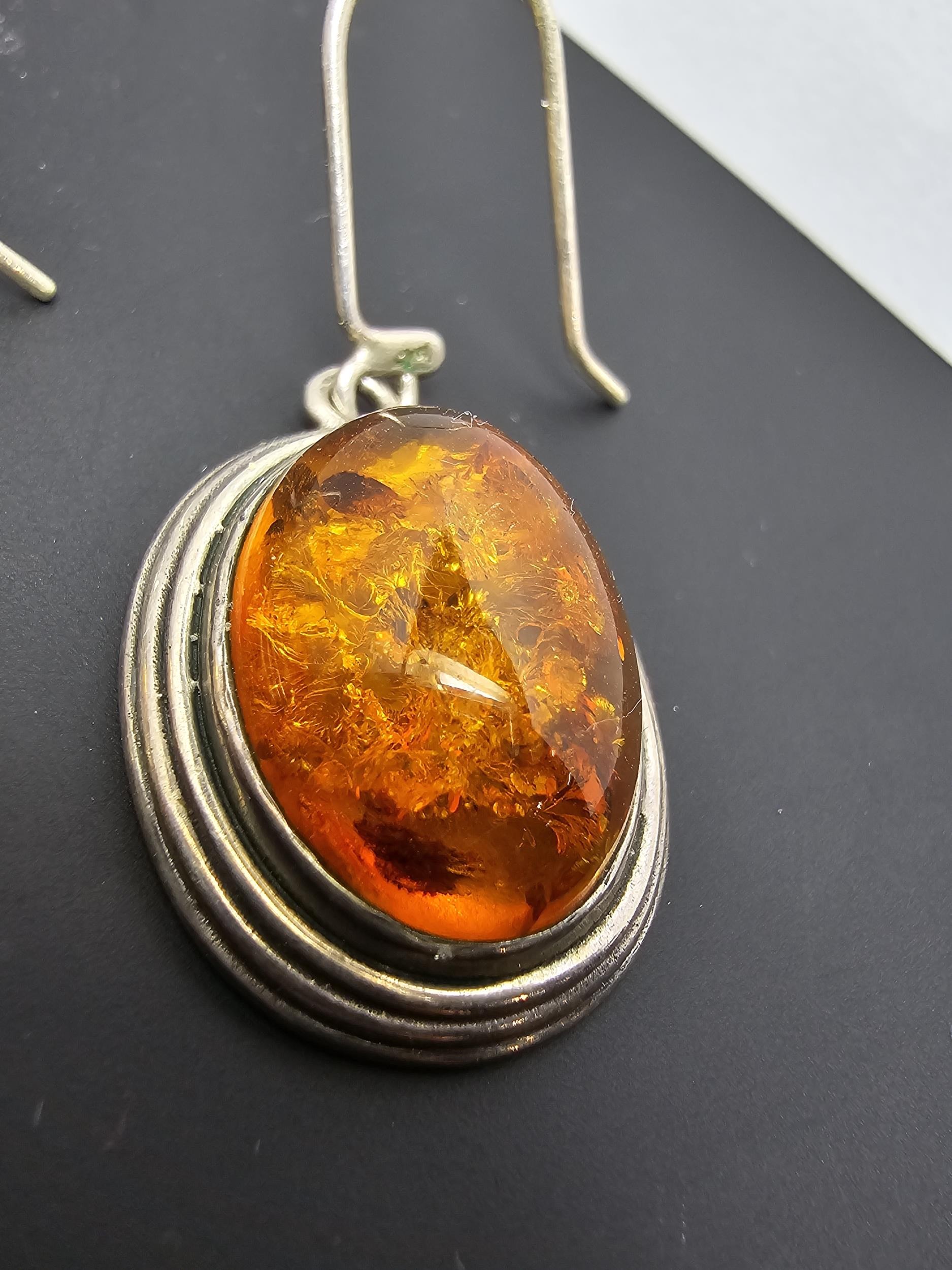 A large good quality 925 silver pair of amber earrings inset wit large natural Baltic amber cabochon stones featuring a vibrant orange colour with inclusions, in excellent clean condition and boxed. Earrings have a height of 25mm, width of 20mm.
