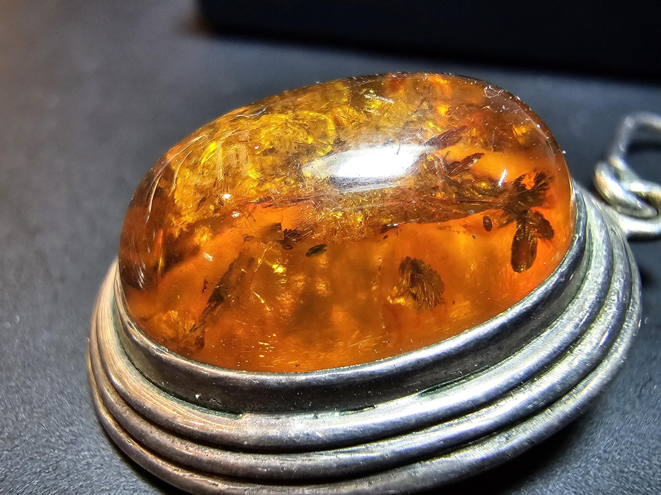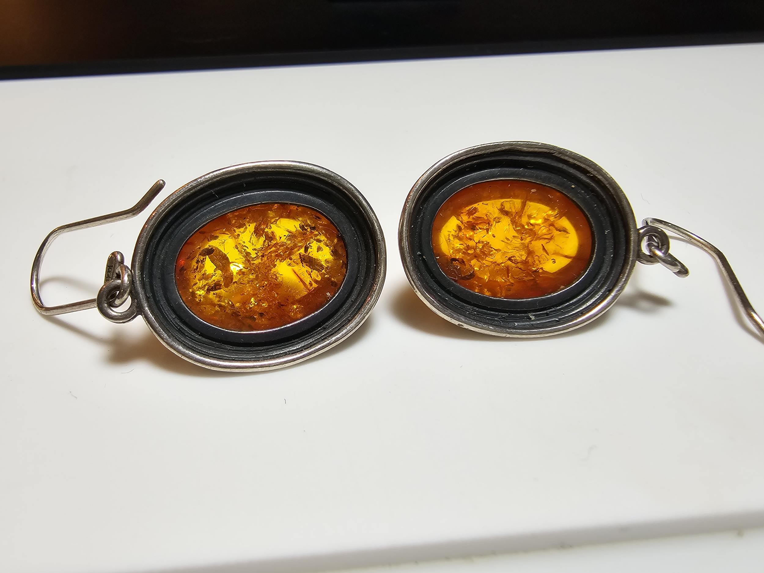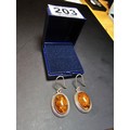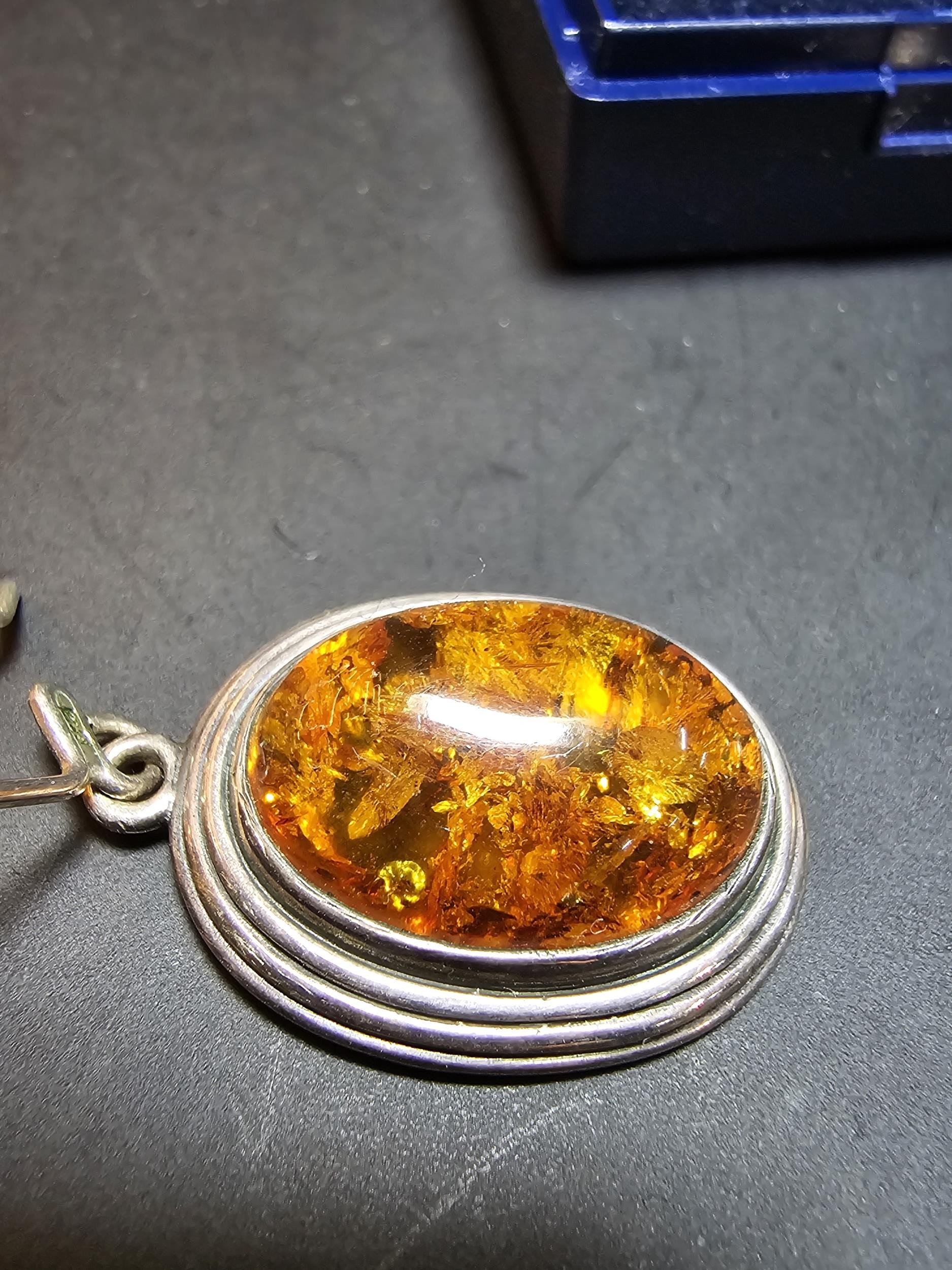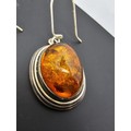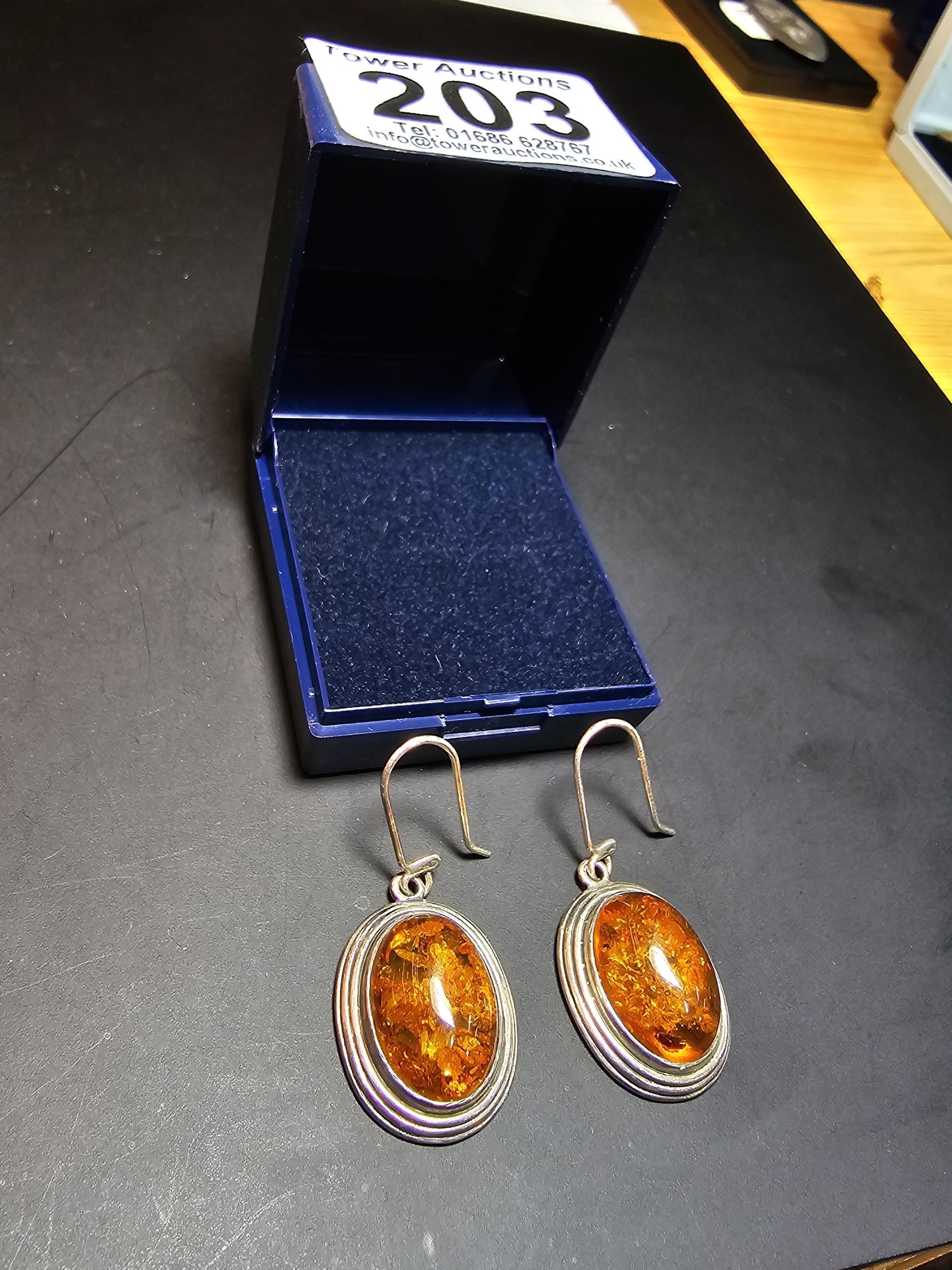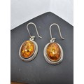 A large good quality 925 silver pair of amber earrings inset wit large natural Baltic amber cabochon stones featuring a vibrant orange colour with inclusions, in excellent clean condition and boxed. Earrings have a height of 25mm, width of 20mm.