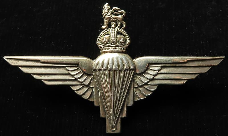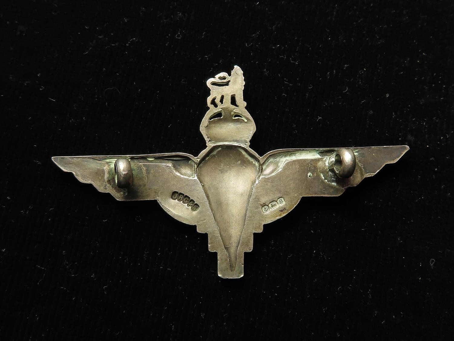 Cap Badge - Parachute Regt officers cap badge, silver hallmarked for 1942, maker marked 'JRG&S'.