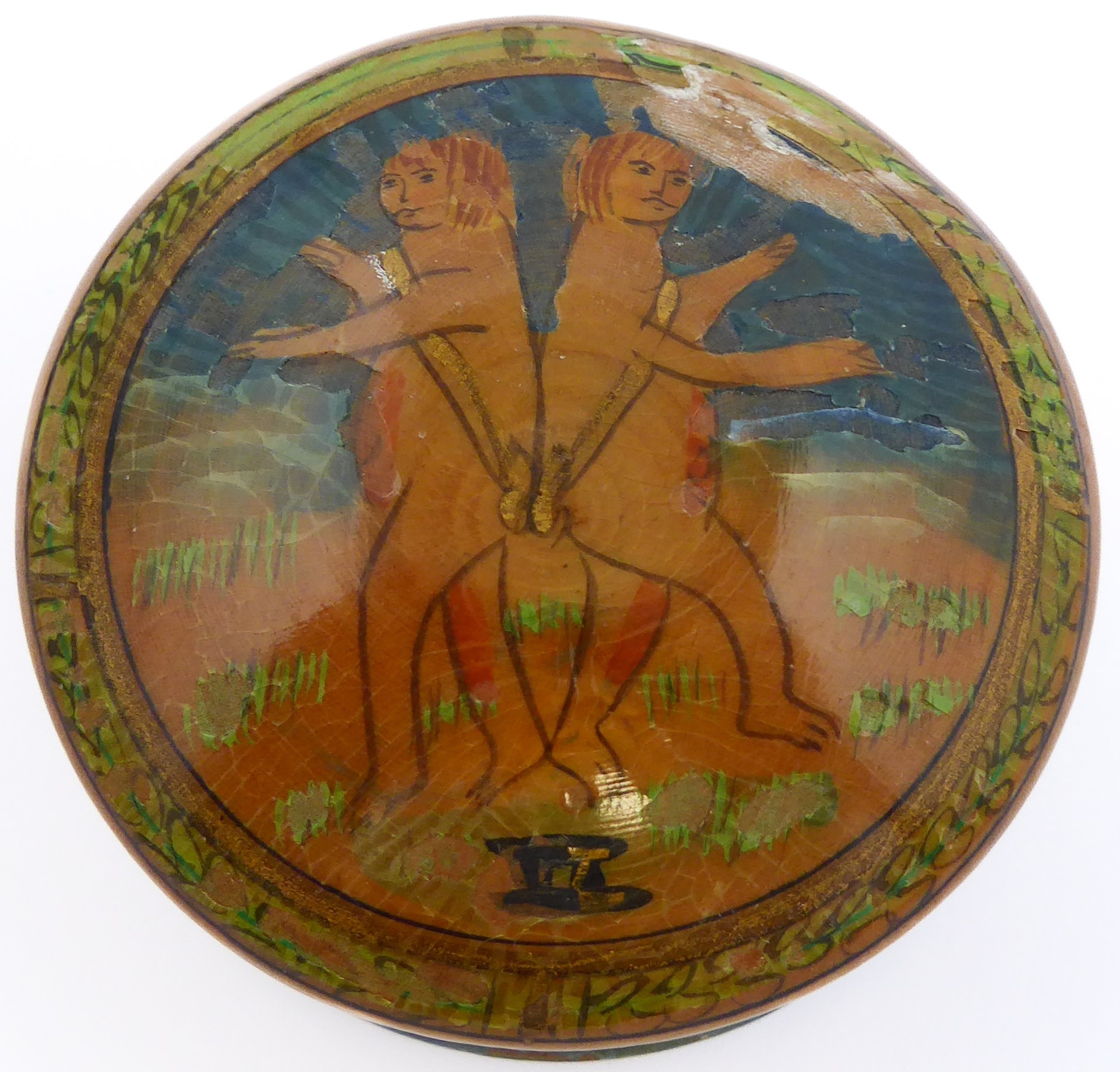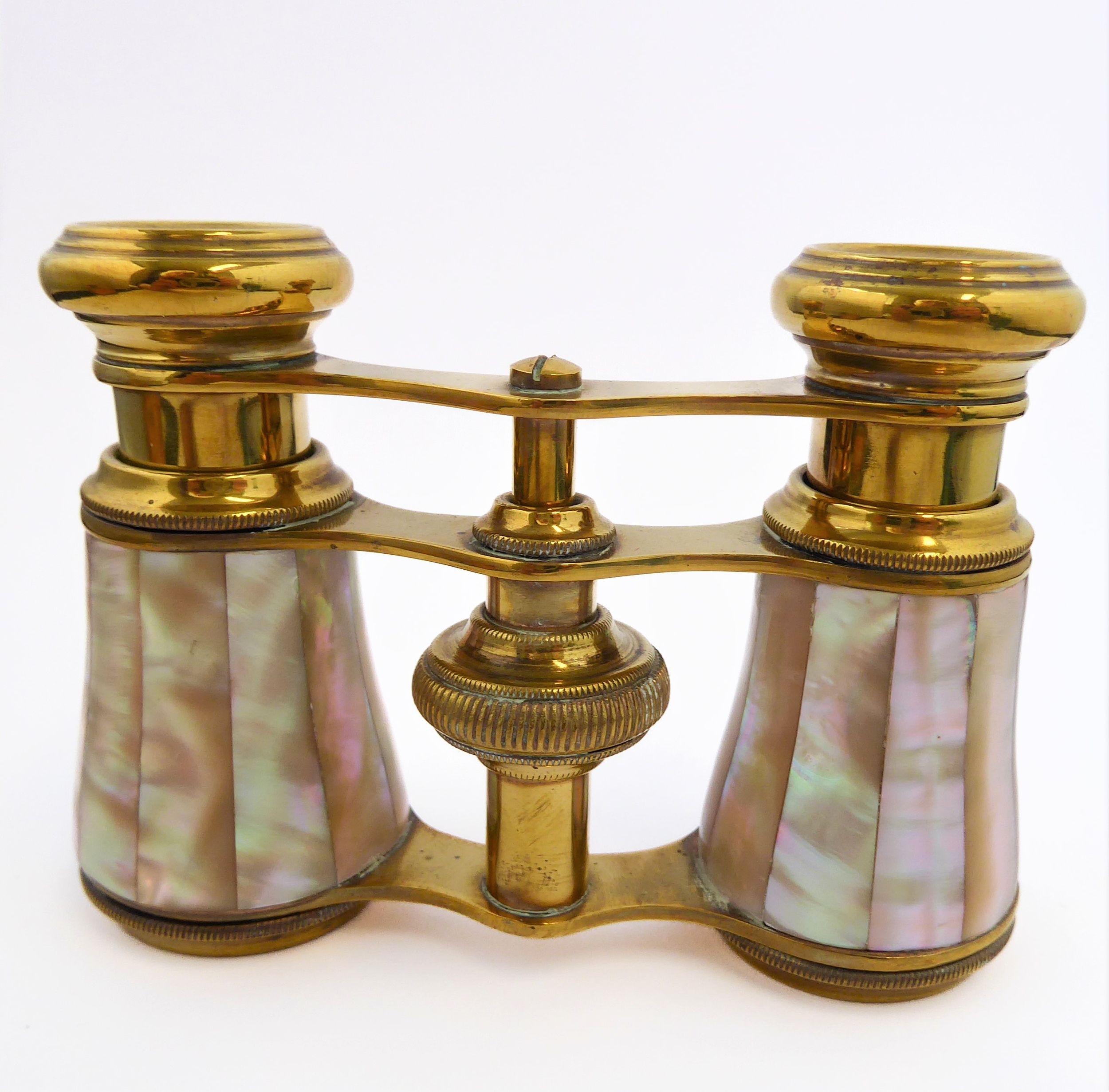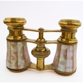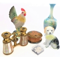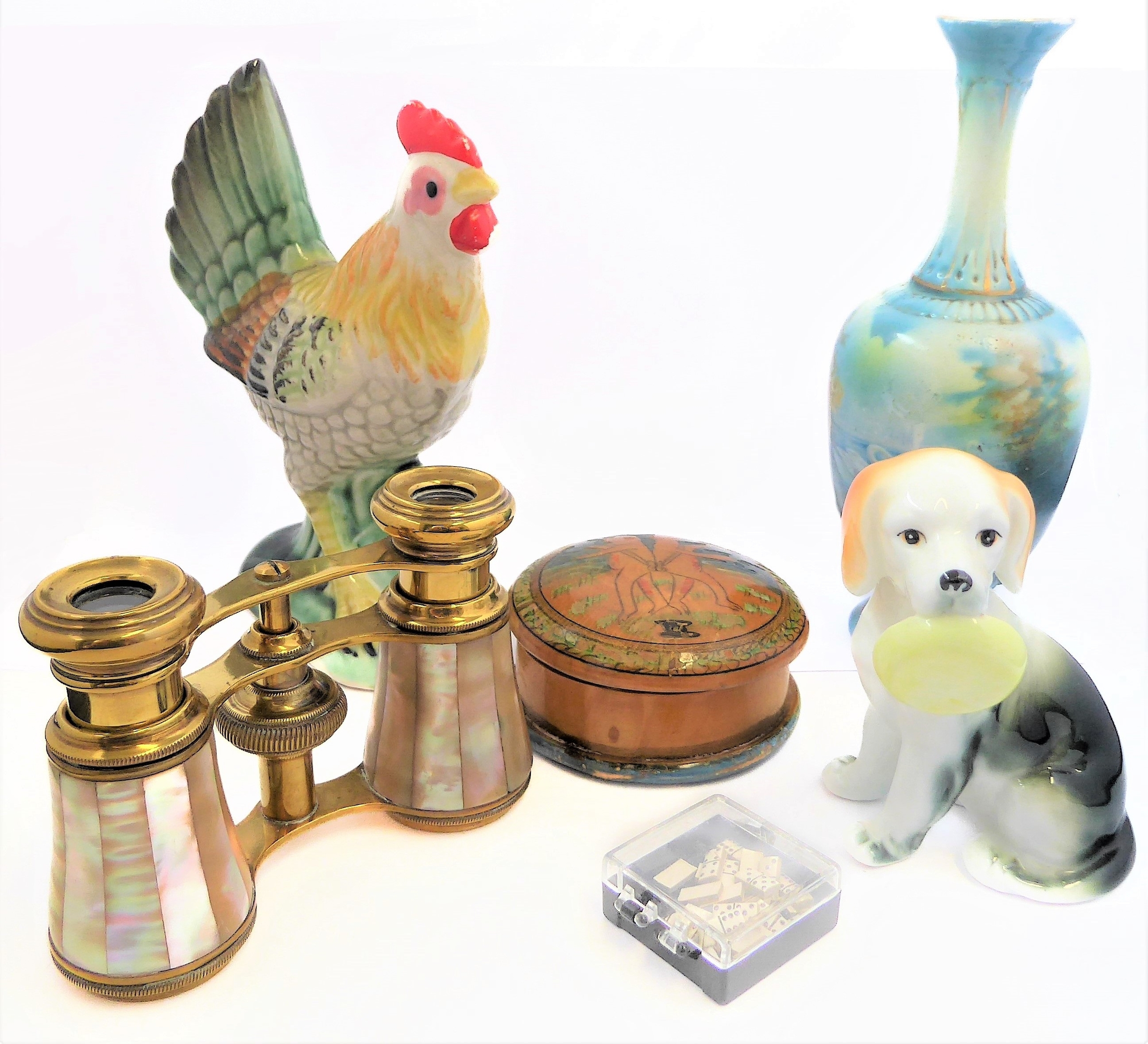 A mixed lot of six collectibles comprising a decorated treen box and cover, a pair of early 20th century finely gilded and mother of pearl mounted opera glasses, a set of miniature dominoes and three ceramic pieces.