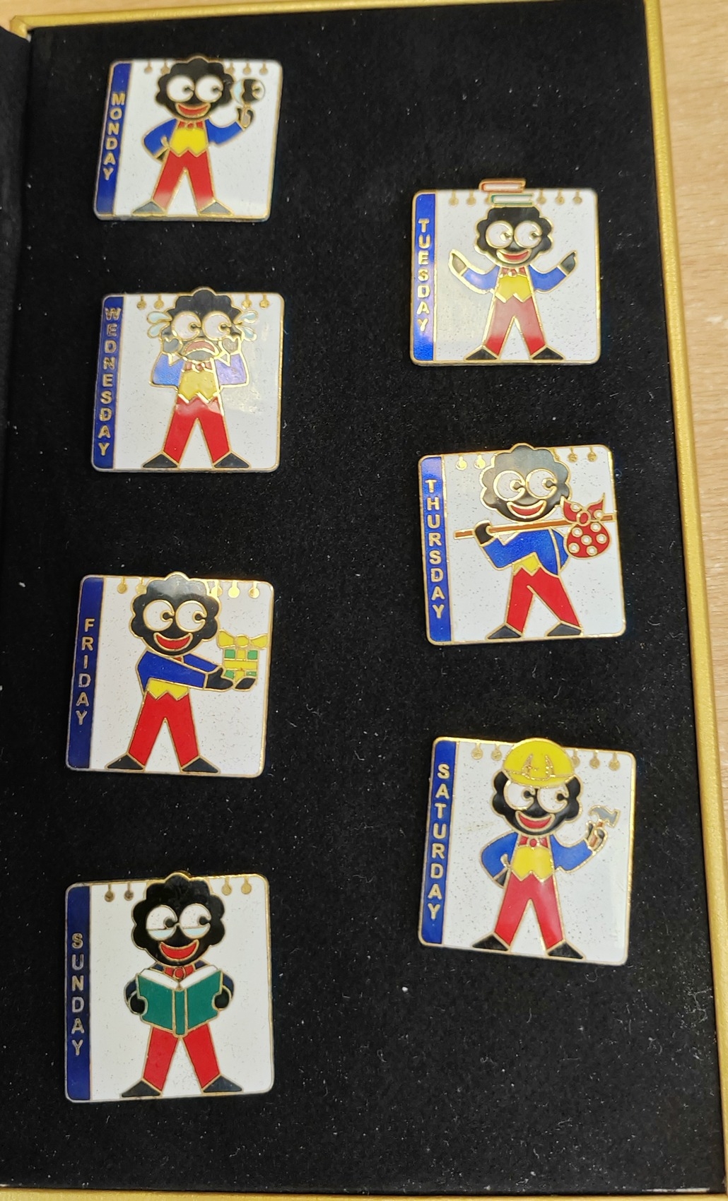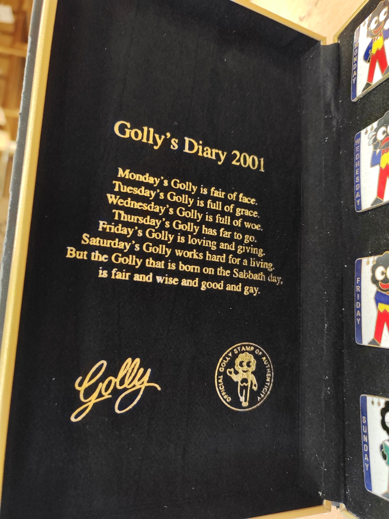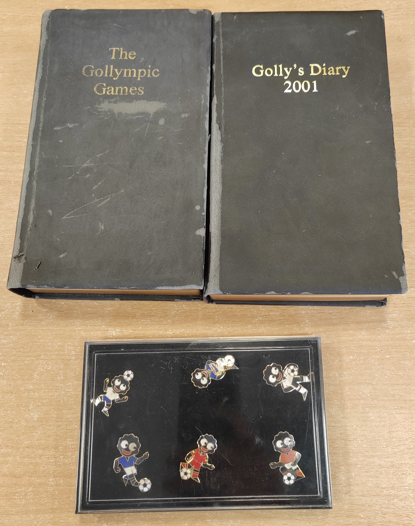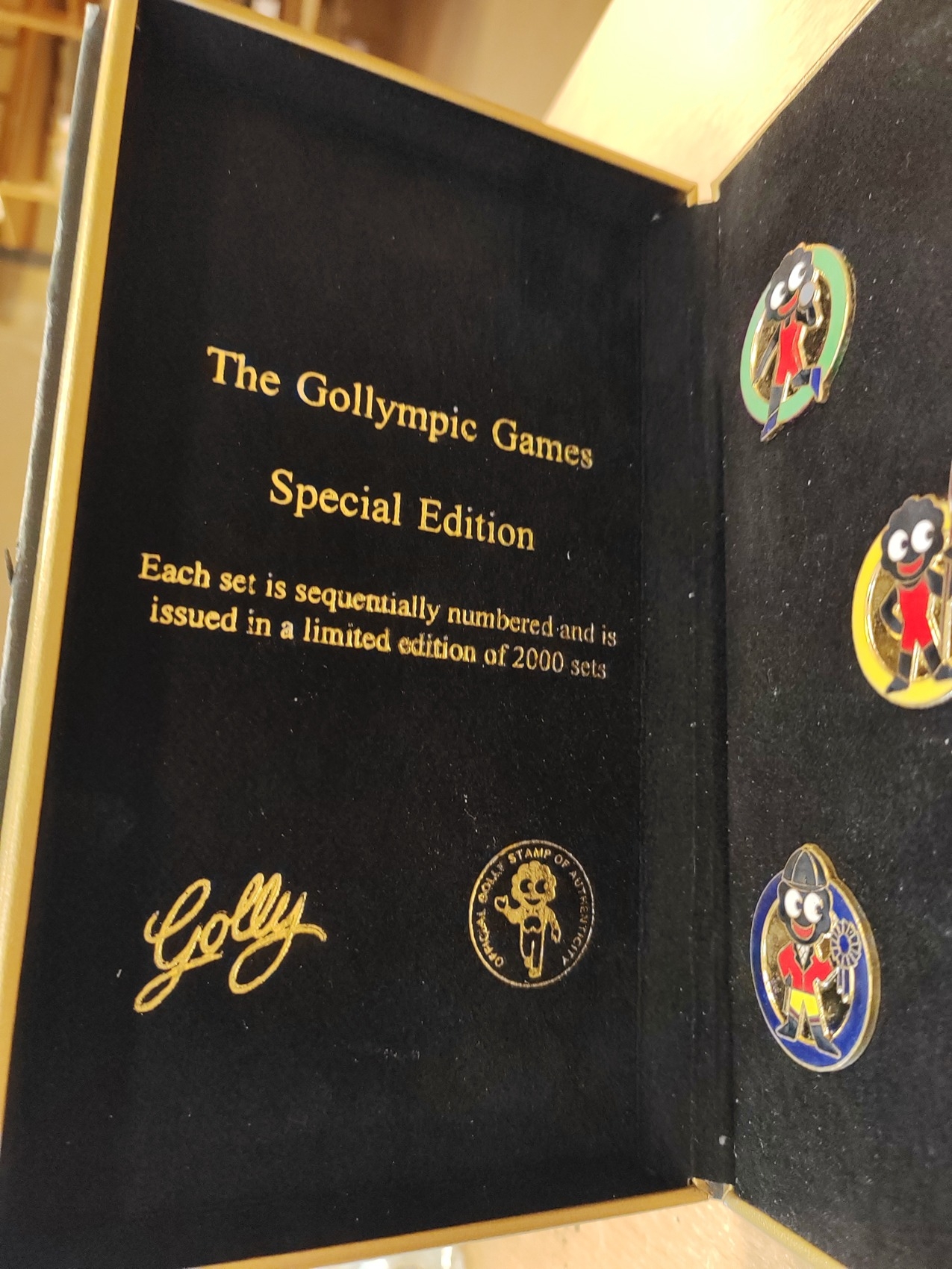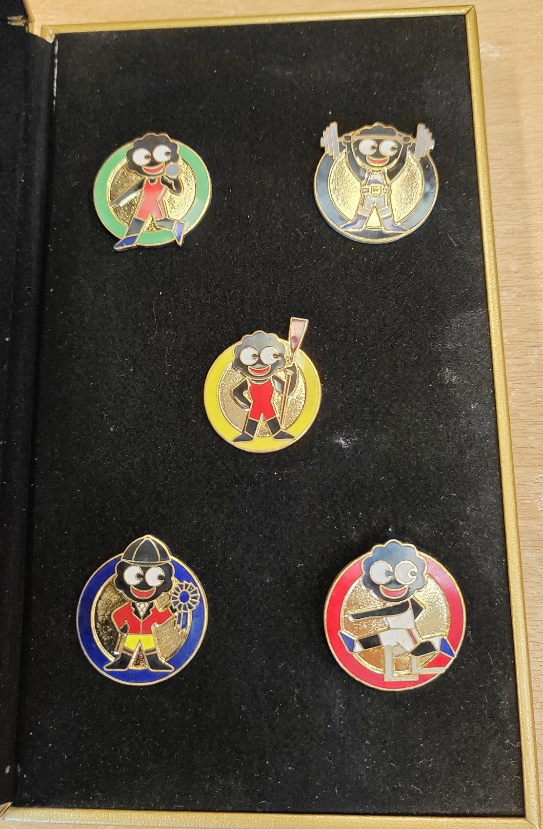 Golly by Robertson's badge sets, excellent in fair to good cases (peeling to outer material) with Robertson's The Gollympic Games 2000 set of five badges limited edition, Robertson's Golly's Diary 2001 set and European Cup Golly 2000 Special Edition Set. (T)