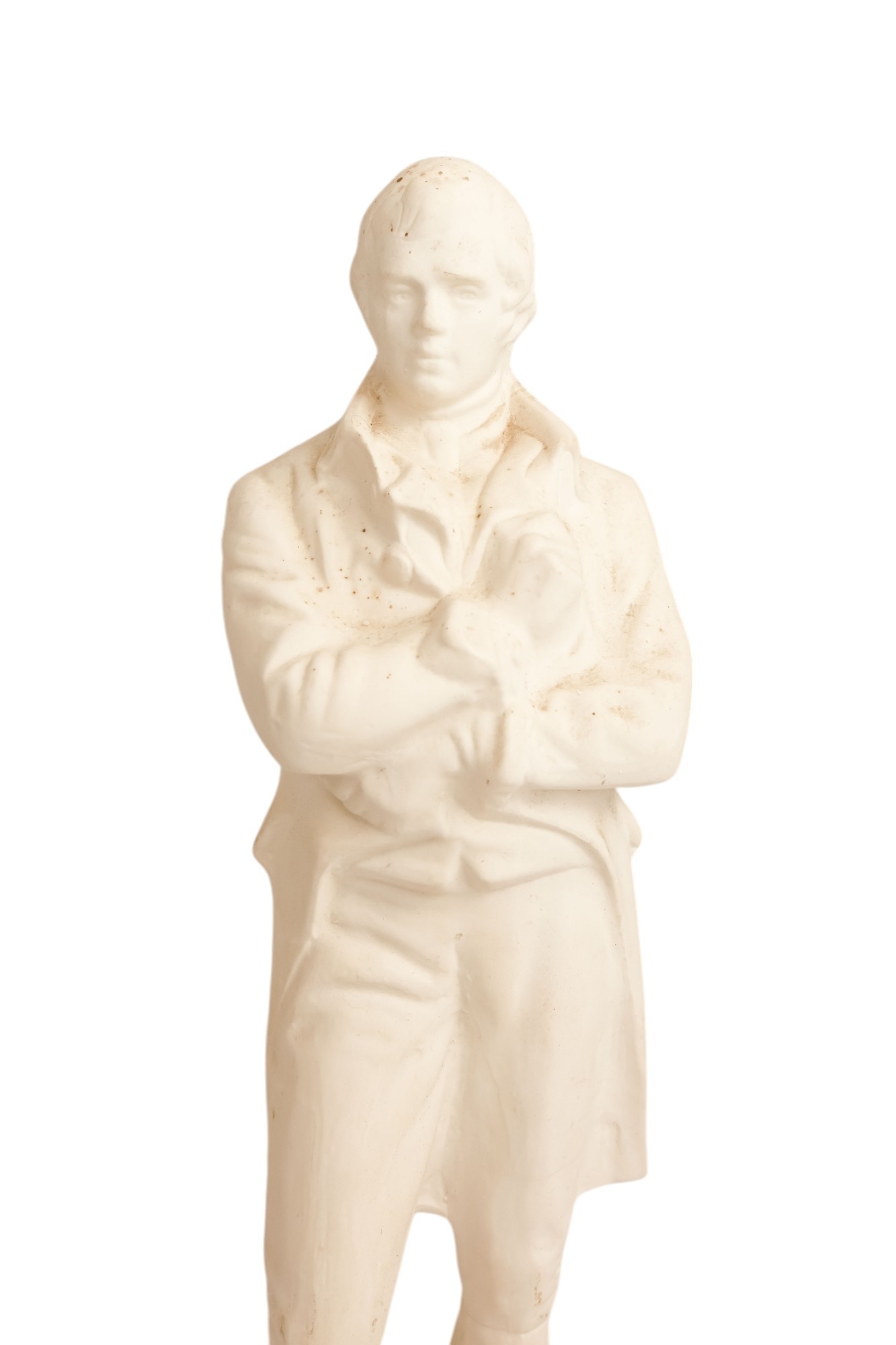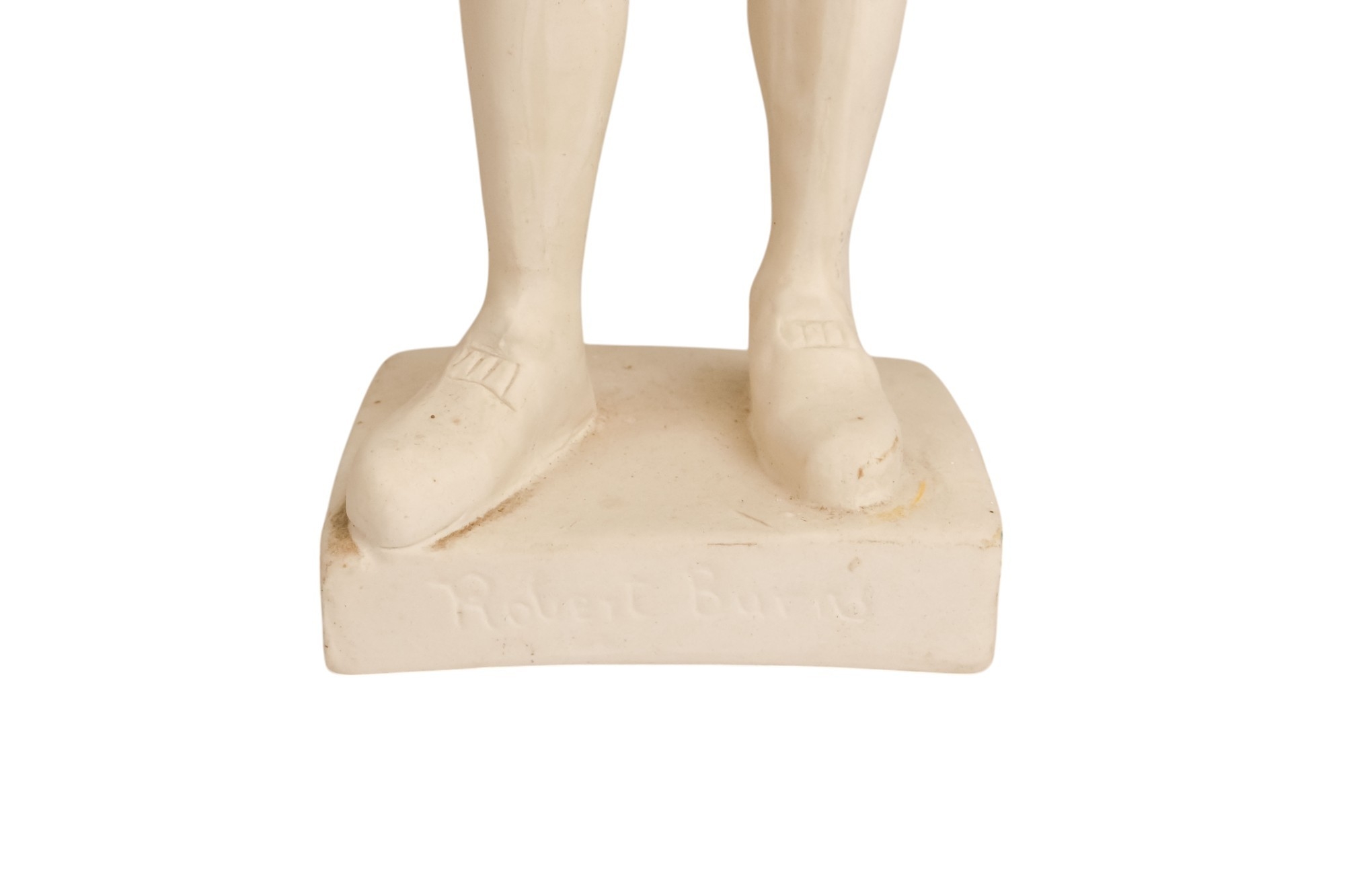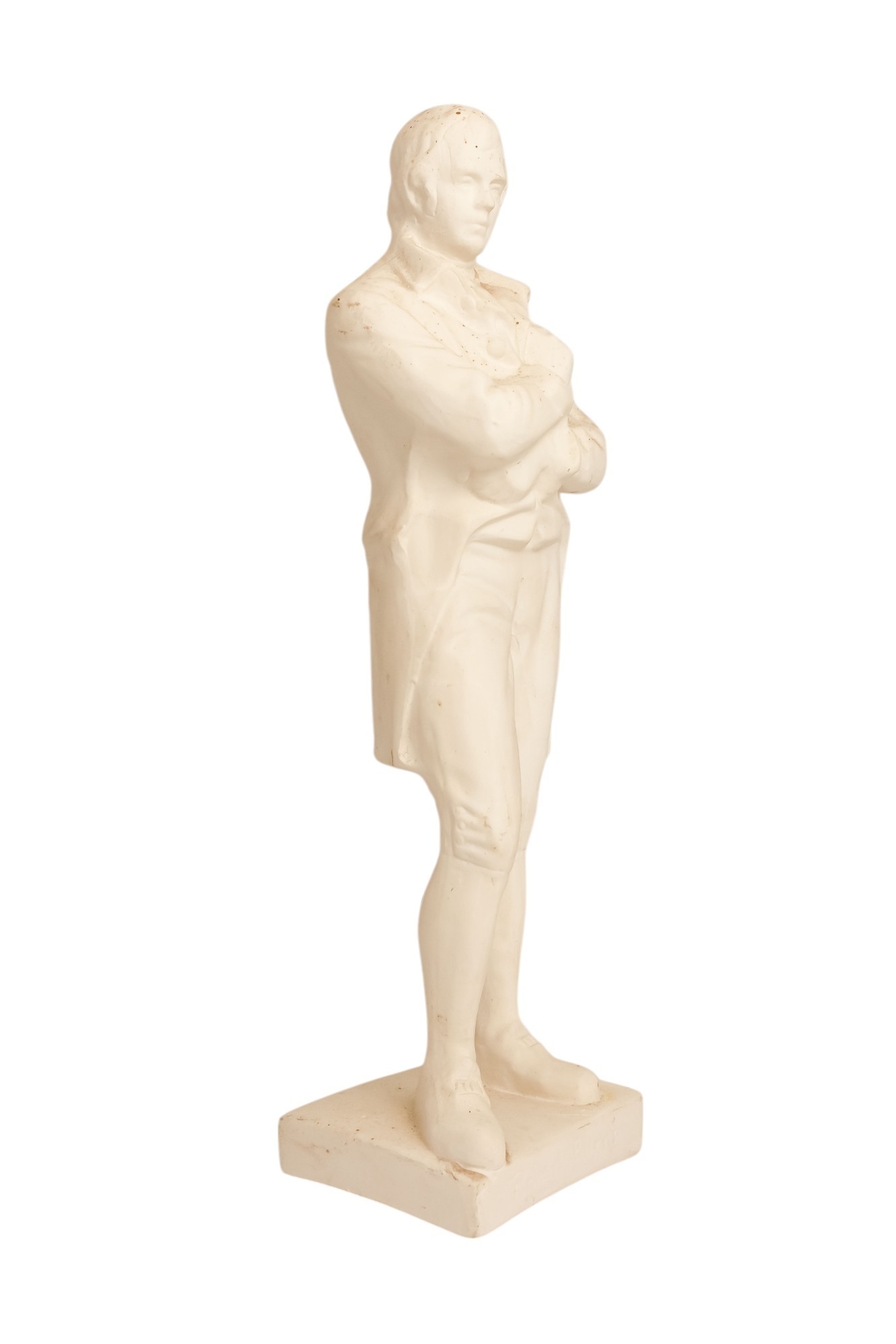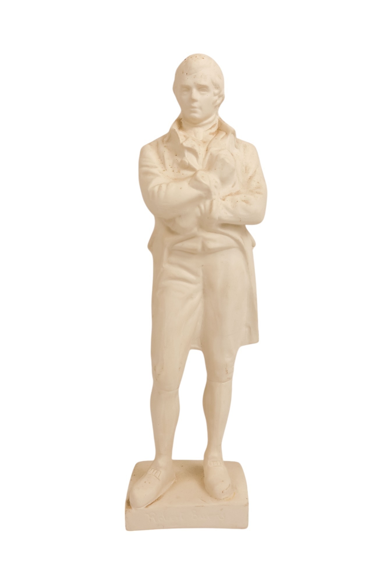 A 20th century plaster figure of Robert Burns - standing in a thoughtful pose mounted on a square base, 34cm high.