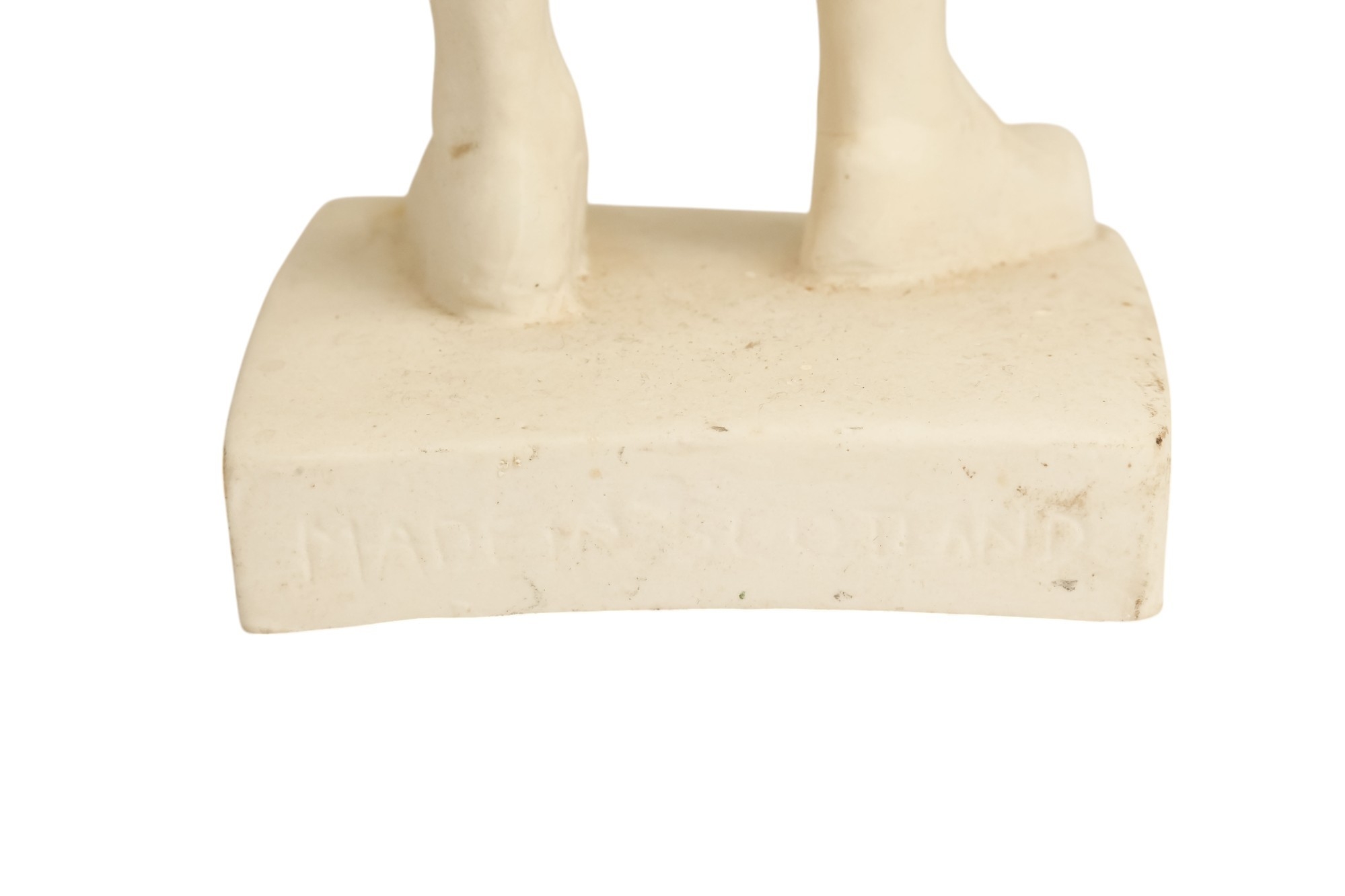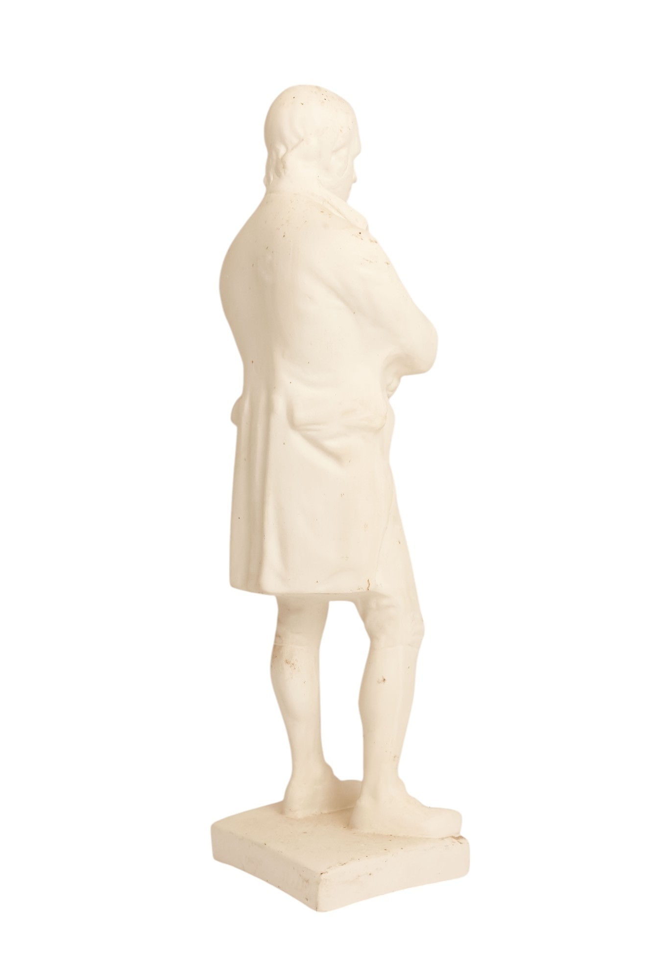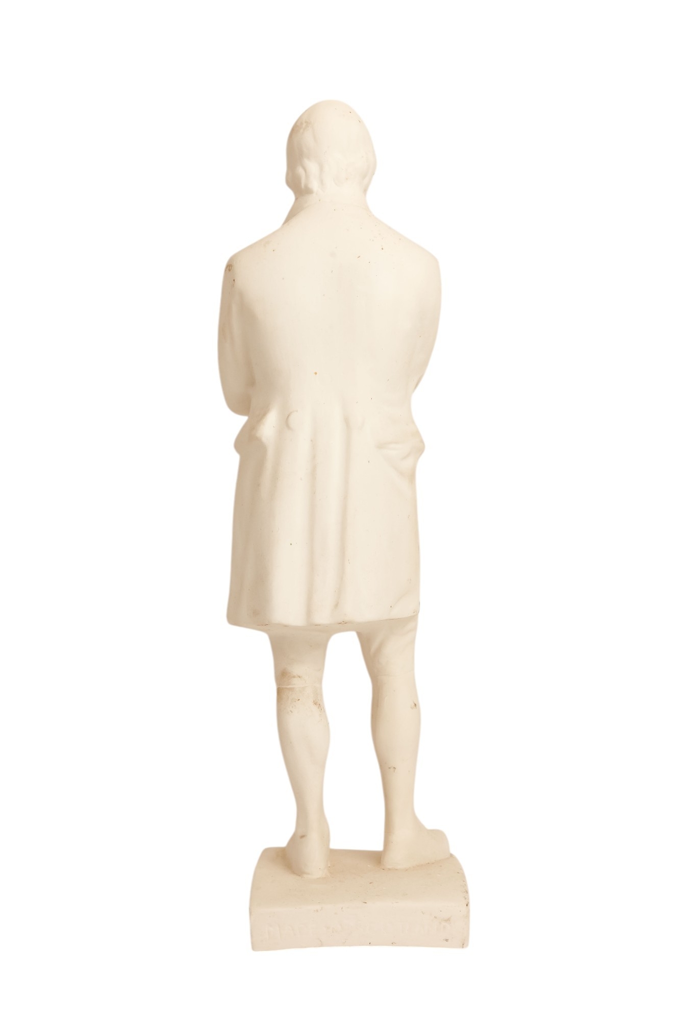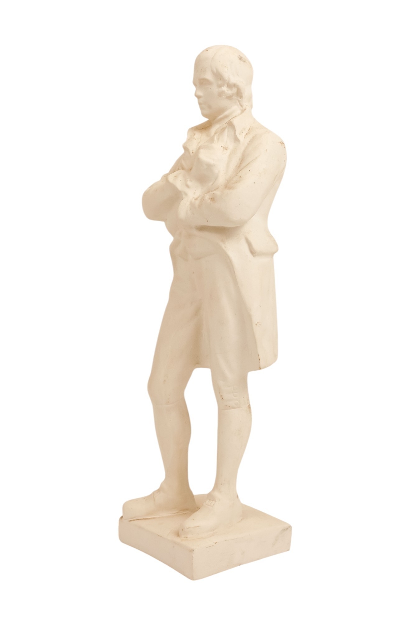 A 20th century plaster figure of Robert Burns - standing in a thoughtful pose mounted on a square base, 34cm high.