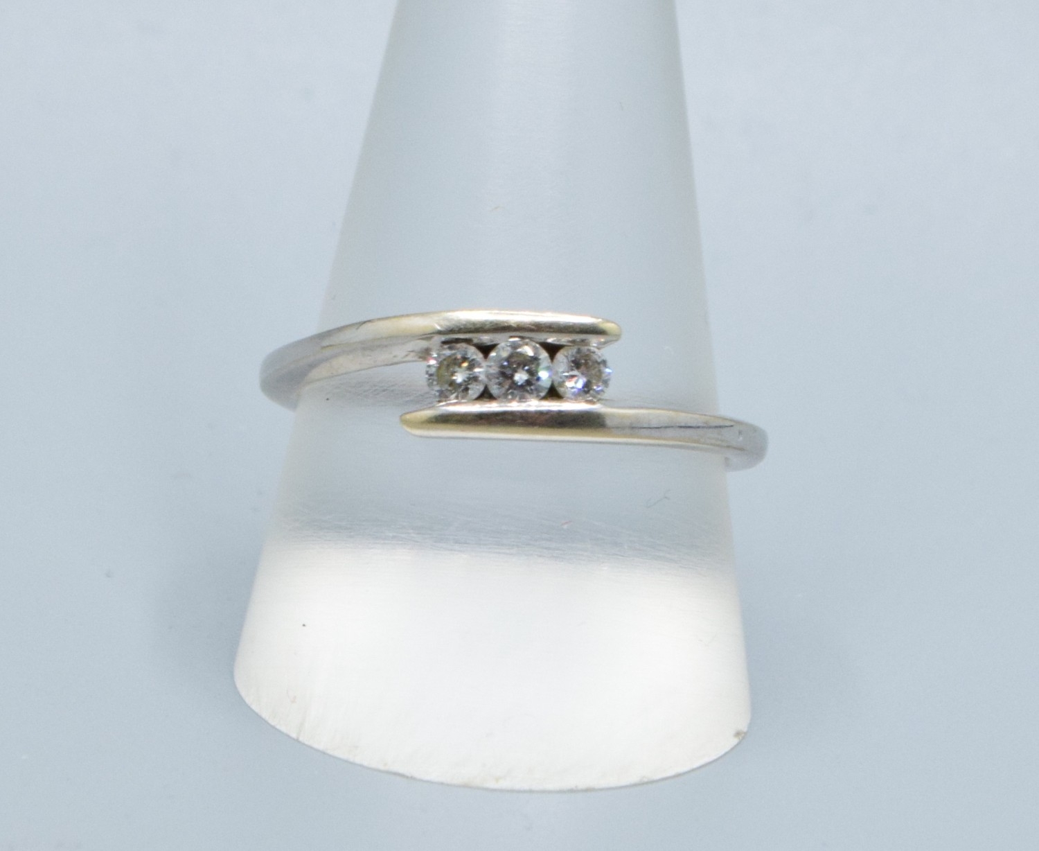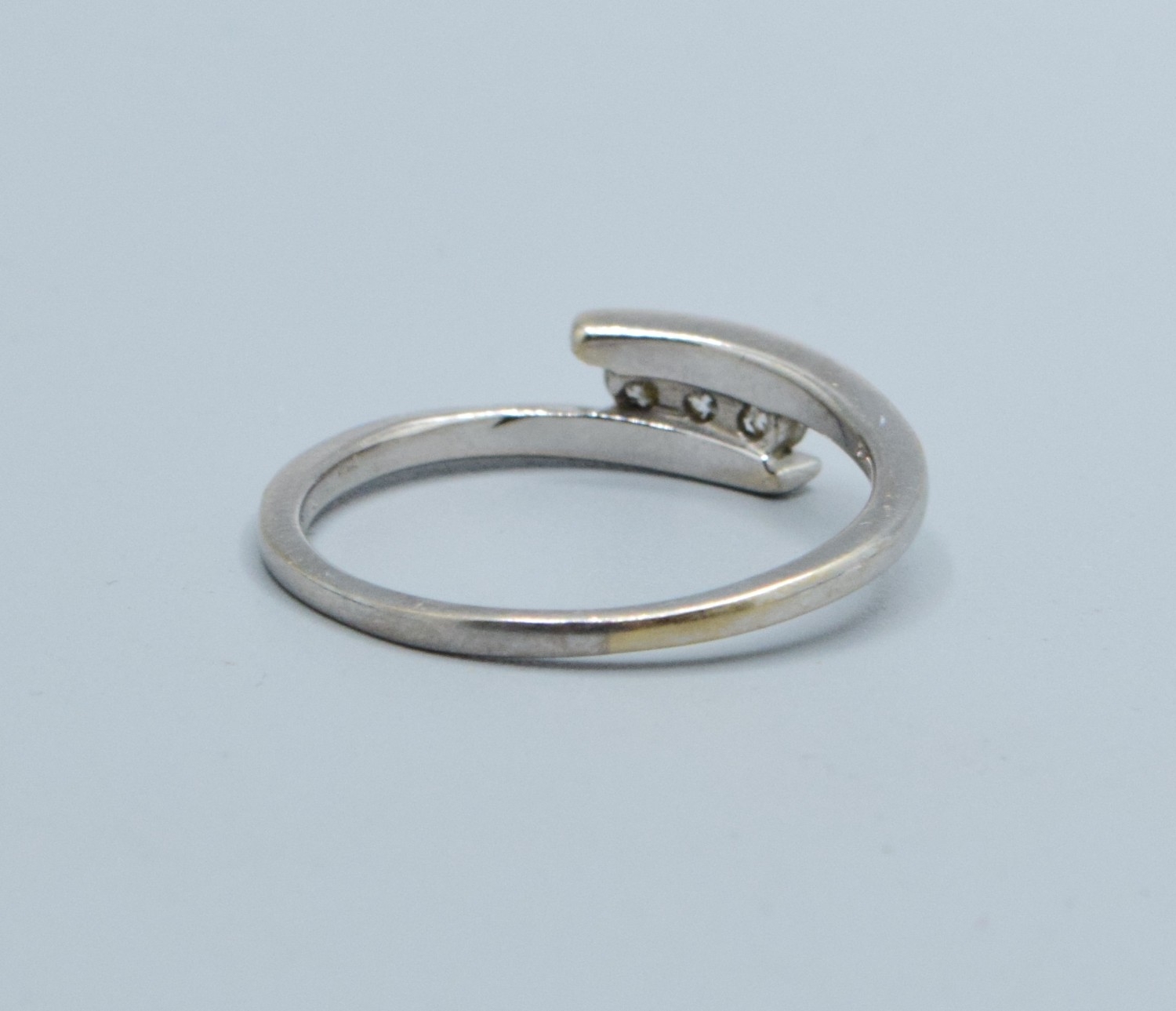 18ct gold white ladies 3 stone Diamond split twist design ring with a Diamond value of 0.25cts hallmarked in the ring size V, 3.9grams