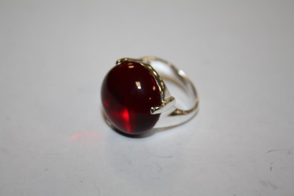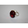 A SILVER LADIES DRESS RING SET WITH A RED POLISHED STONE, APPROX WEIGHT 10 G
