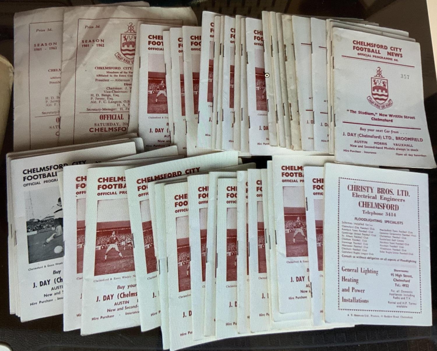 Non League Football Programmes: Box with many 60s Chelmsford and more plus a box of modern all clubs. C/W a wad of programmes collected by a ground hopper in the 70s and 80s. Quantity.