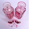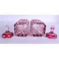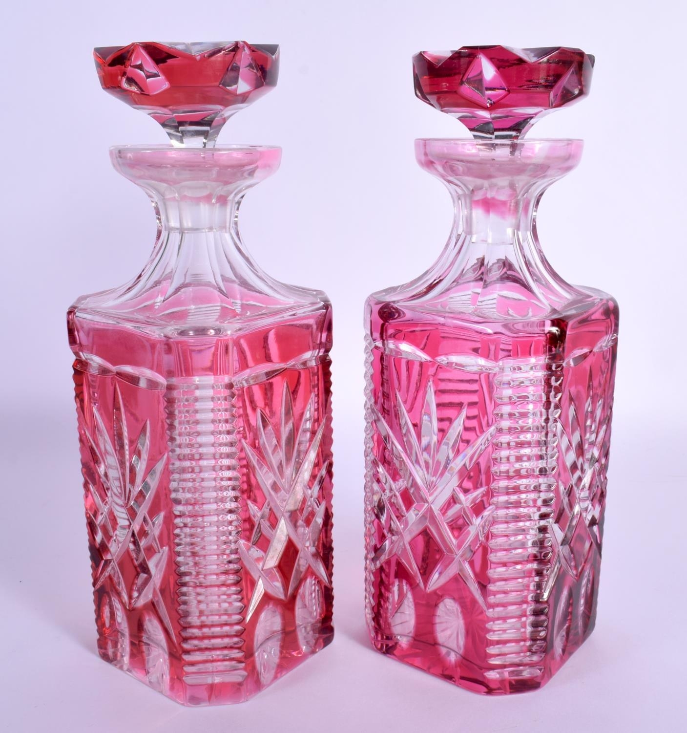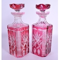 A PAIR OF BOHEMIAN RUBY FLASH DECANTERS AND STOPPERS with star curt decoration. 25 cm x 8 cm.