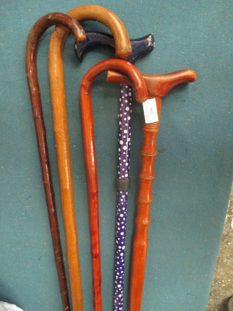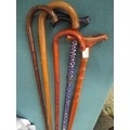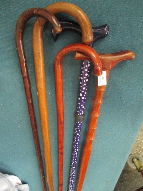 4 STURDY WALKING CANES AND A BLUE AND WHITE WALKING STICK
