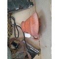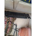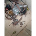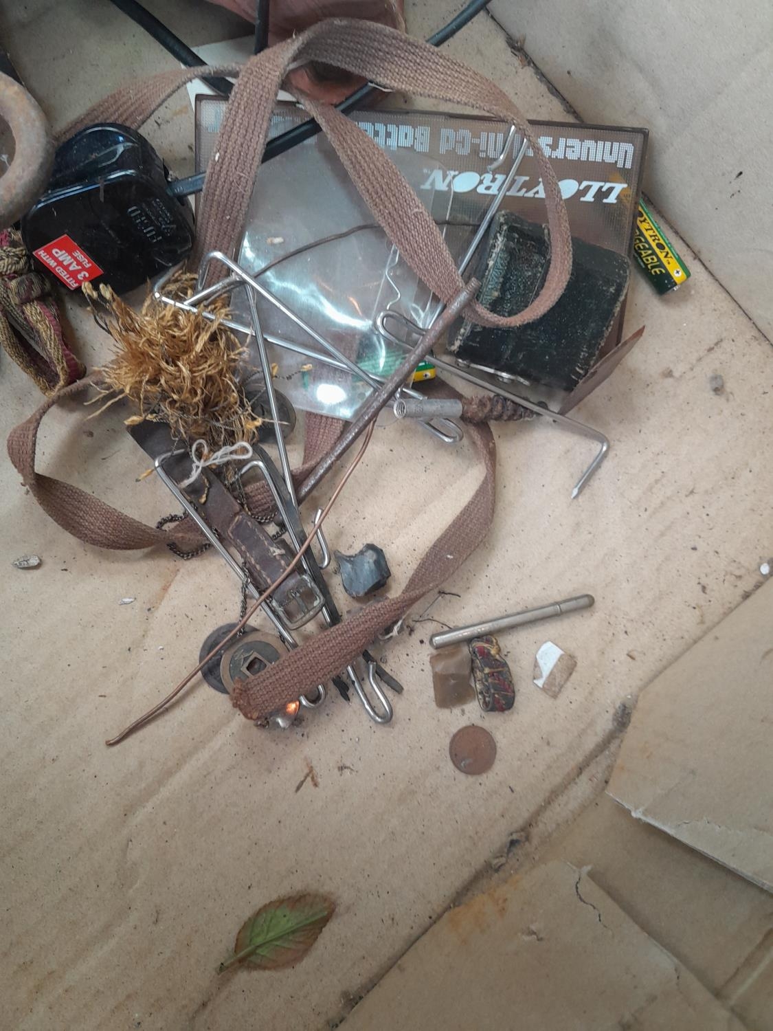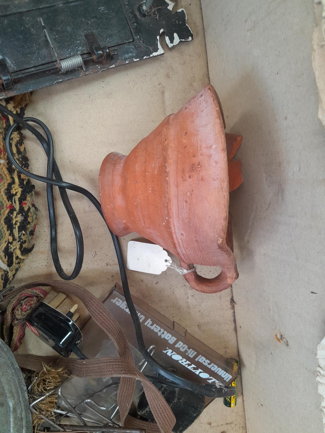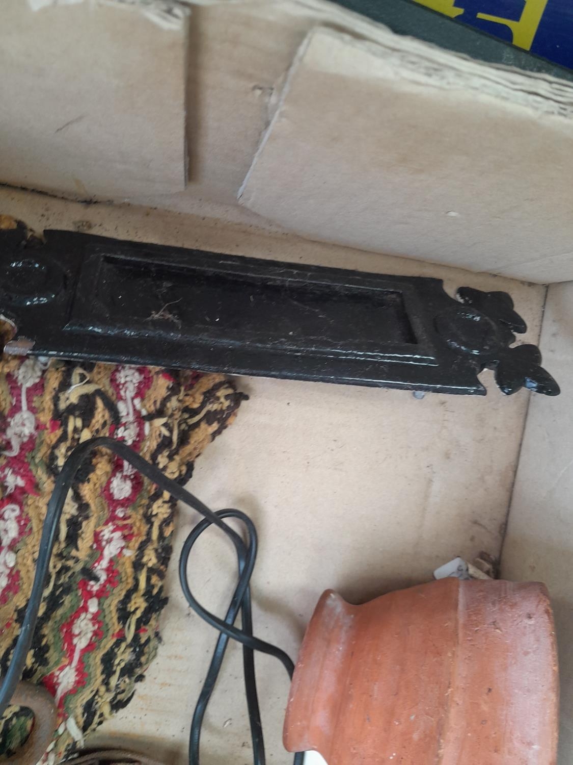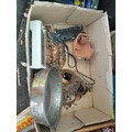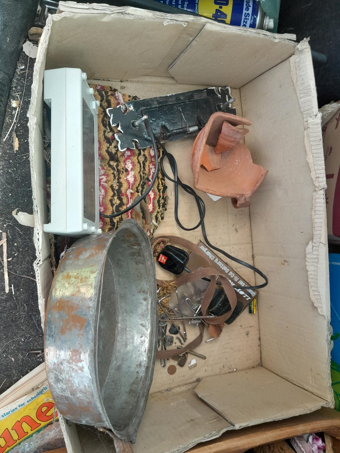 Box of oddments : antique broken earthenware bowl, vintage tinned copper two handled dish, letter box and travelling inkwell etc.