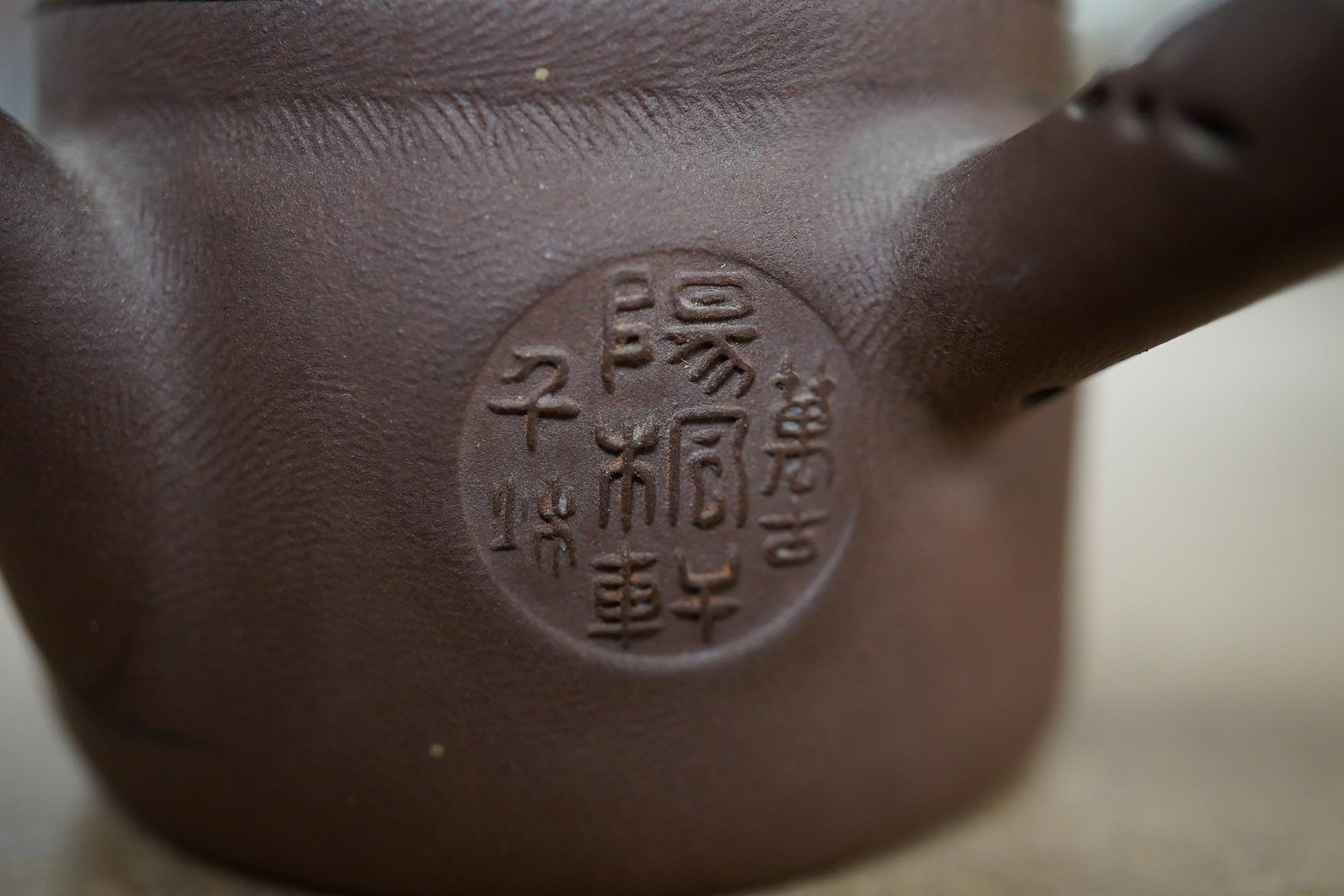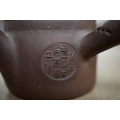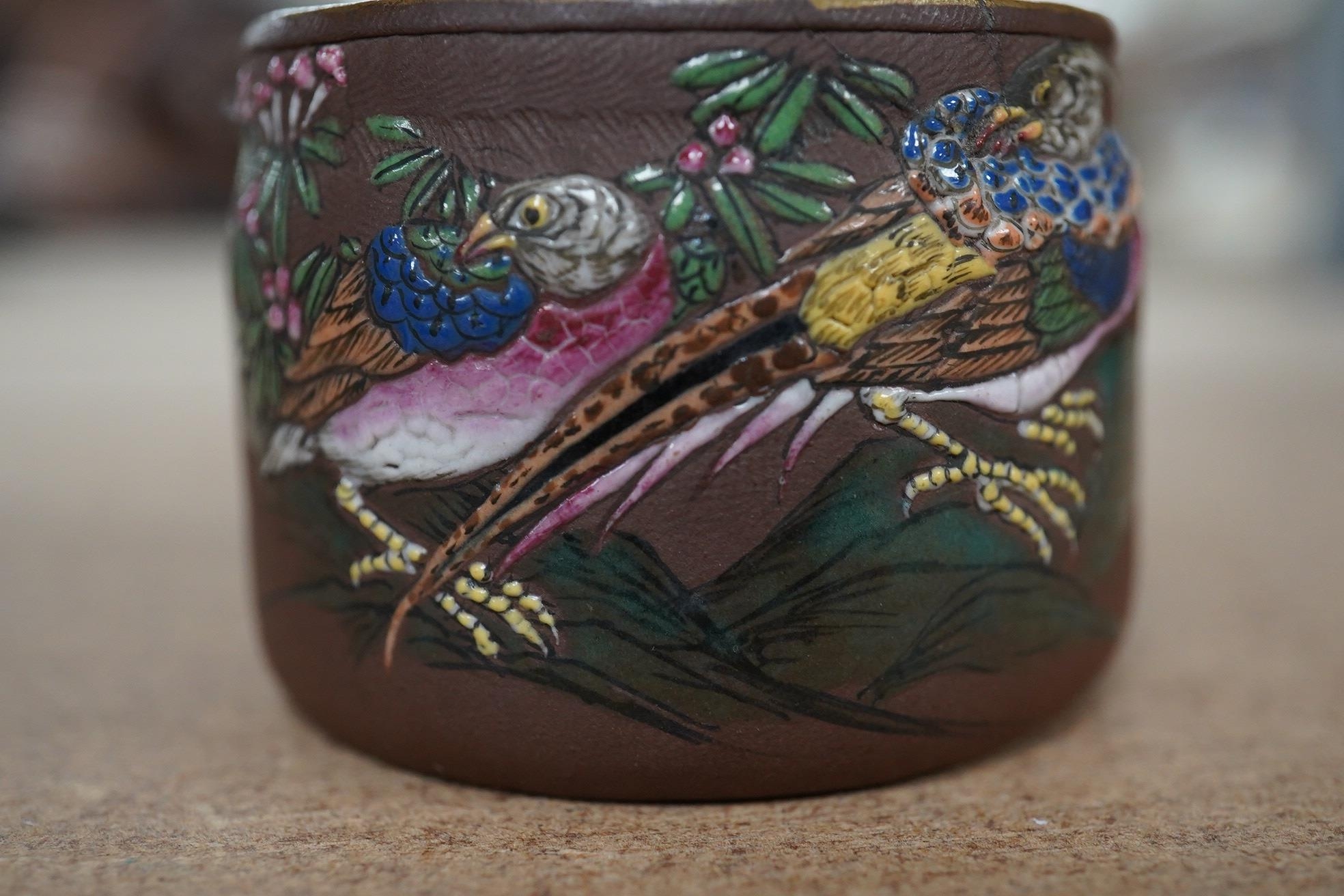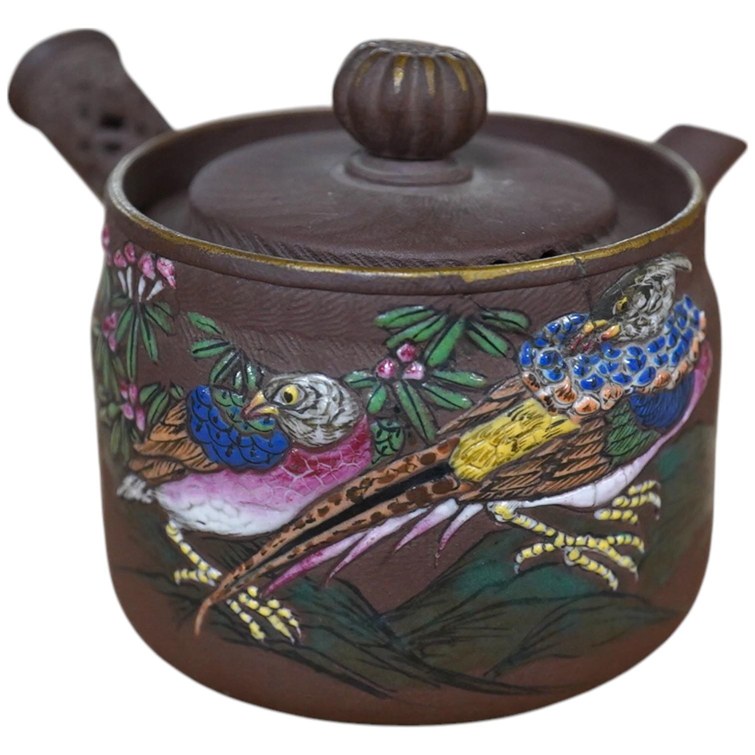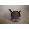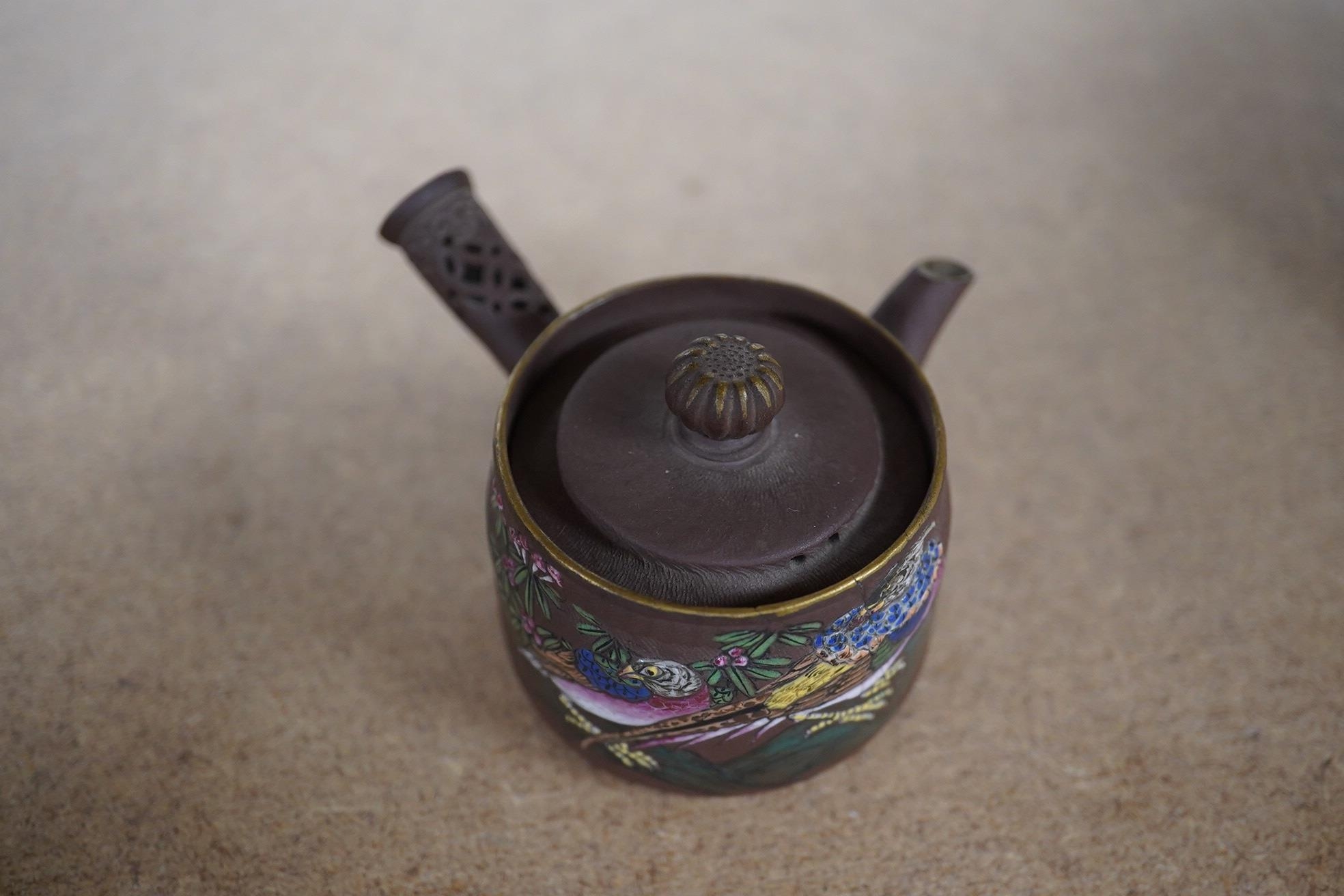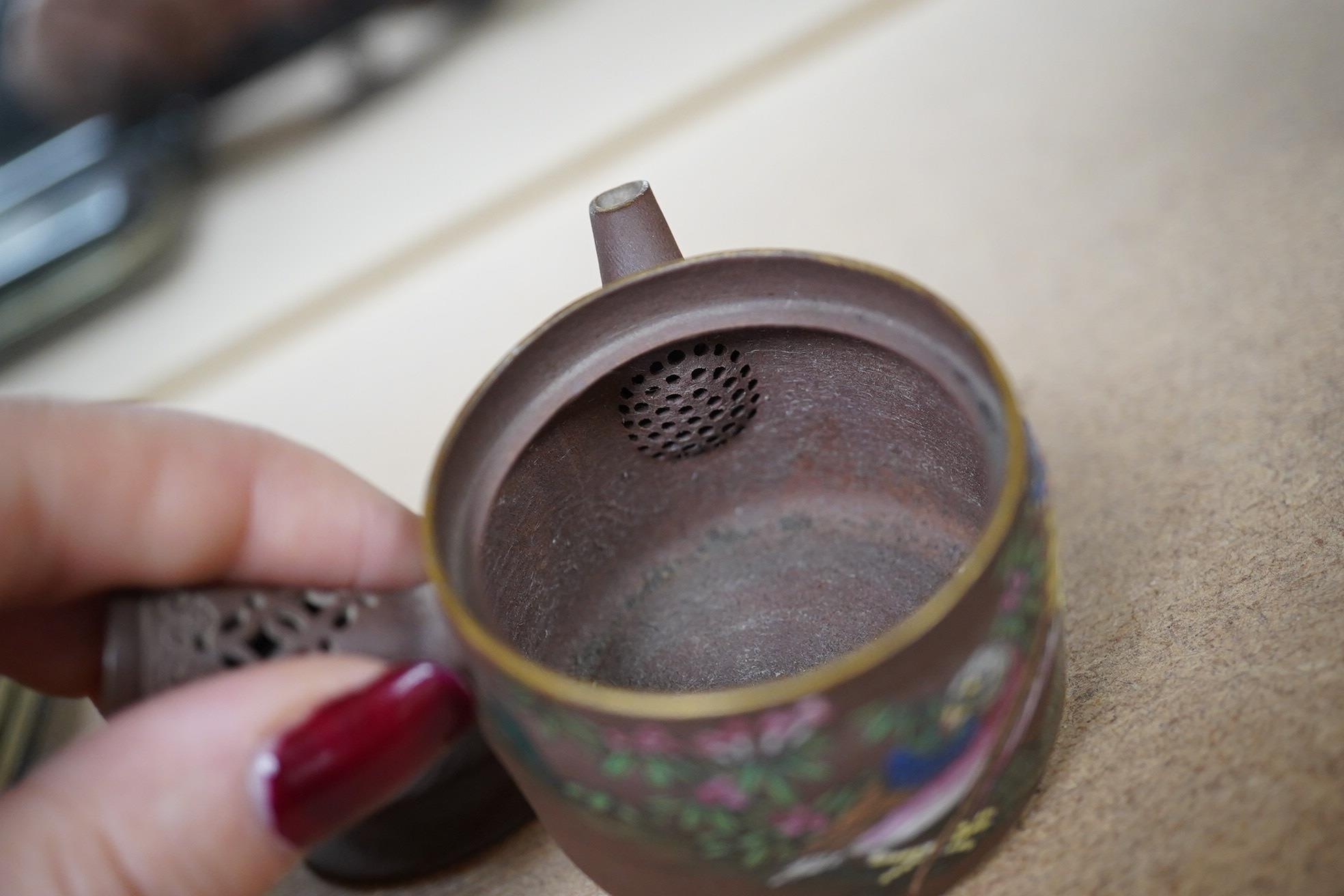 A 19th century Chinese enamelled Yixing miniature teapot, 7.5cm wide. Condition - good
