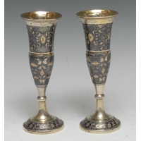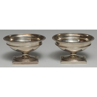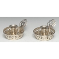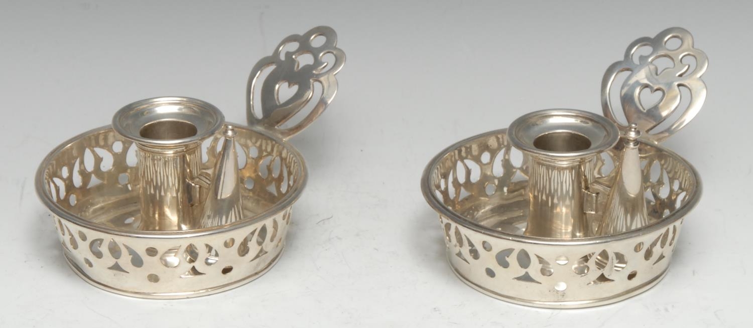 A pair of unusual William IV silver circular chambersticks, pierced sconces, borders and handles, 12cm diam, J Wrangham & William Moulson, London 1837, 16.5oz