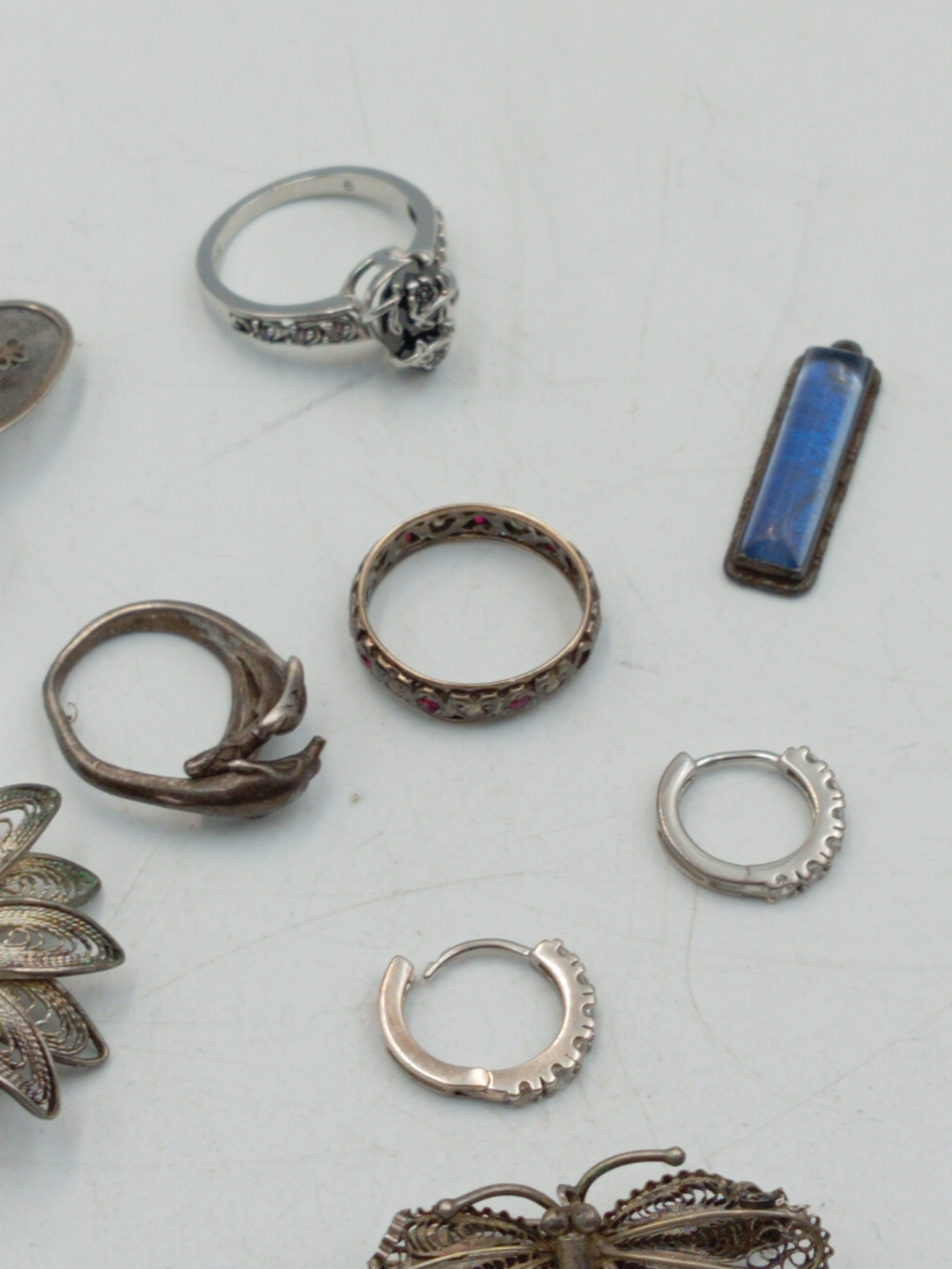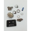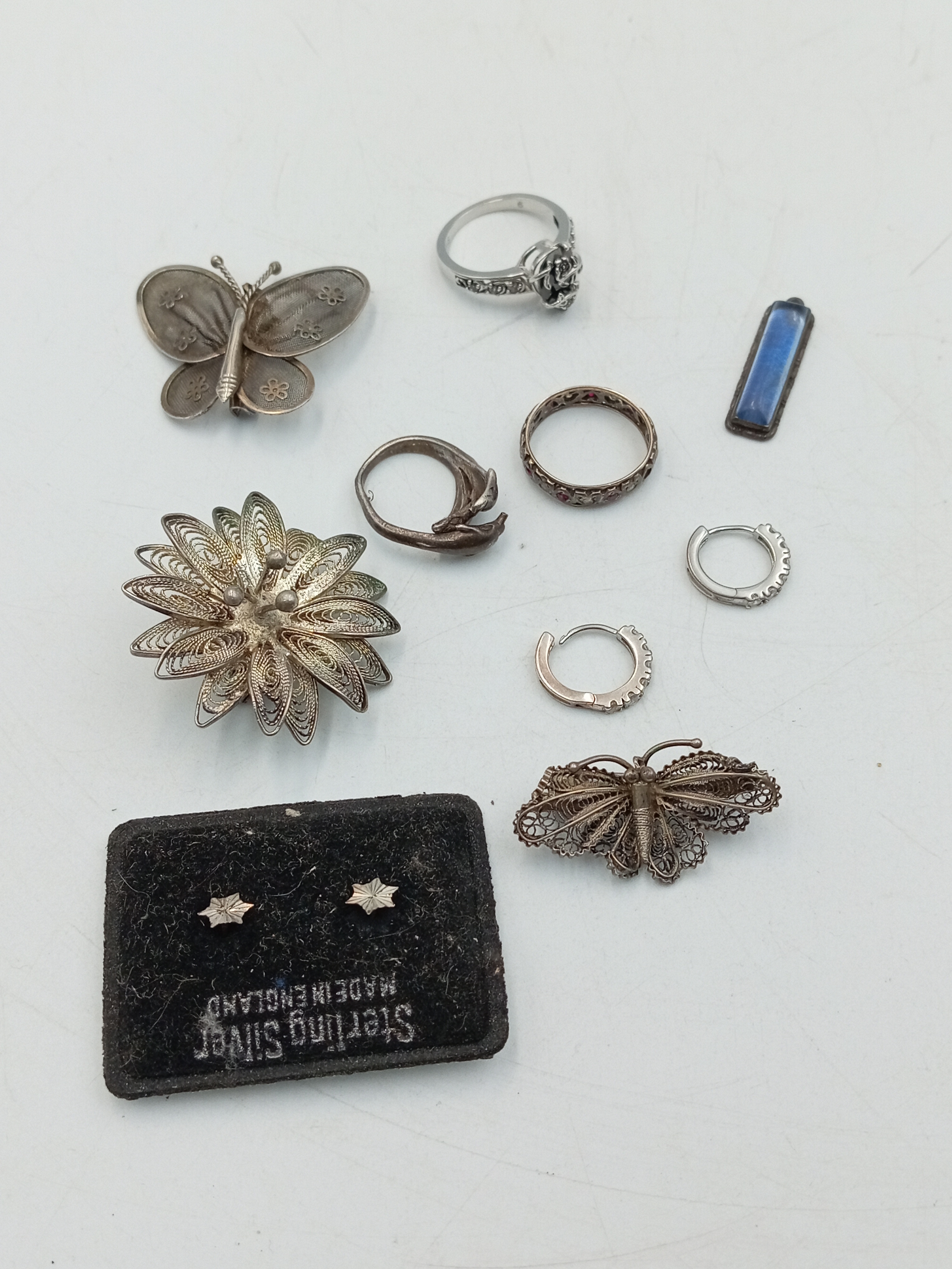 A small mixed lot of jewellery including a silver ring, Butterfly pendant, two pairs of earrings together with three filigree brooch and a ring stamped 9CT SIL