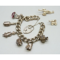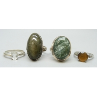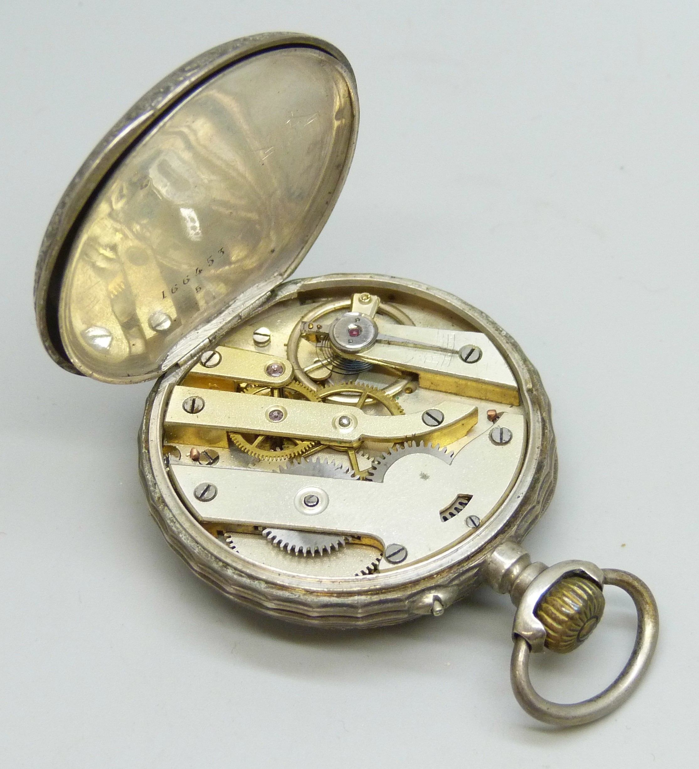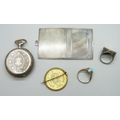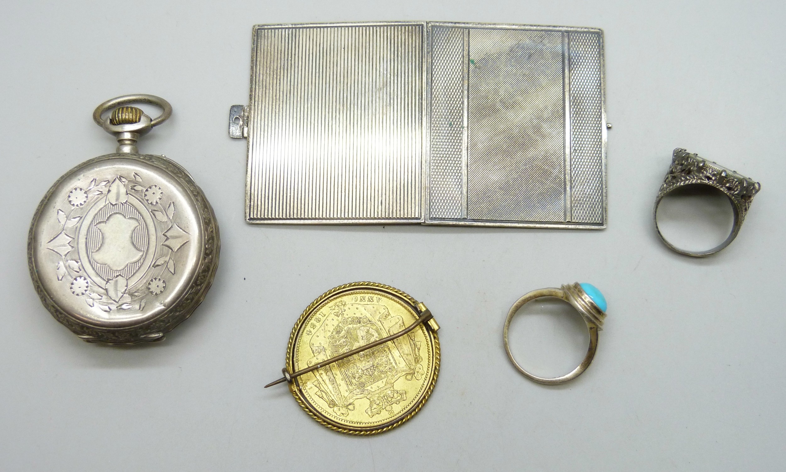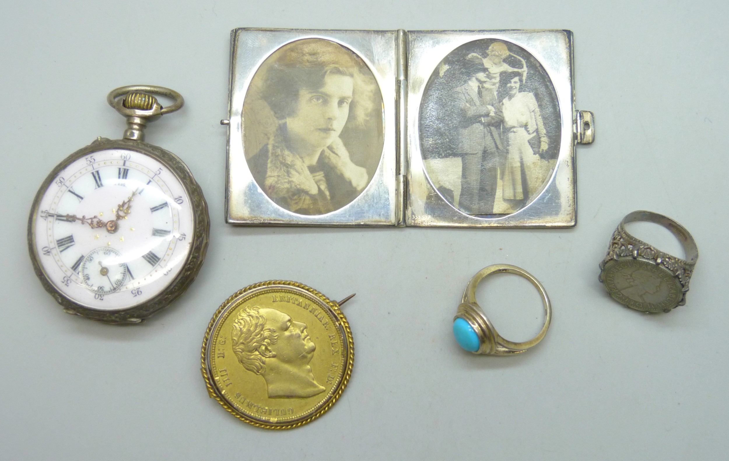 A pocket watch, a .935 silver miniature photograph frame, 33g, two silver rings, and a gilt coin brooch