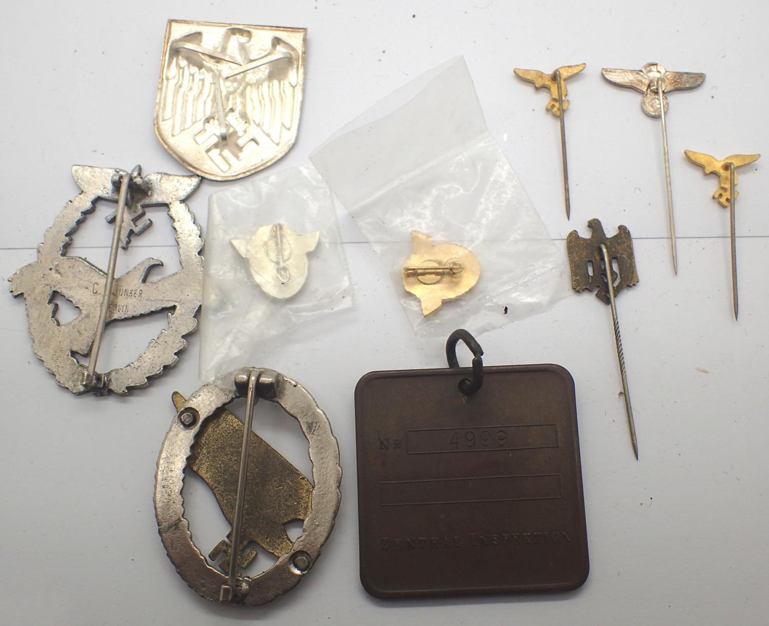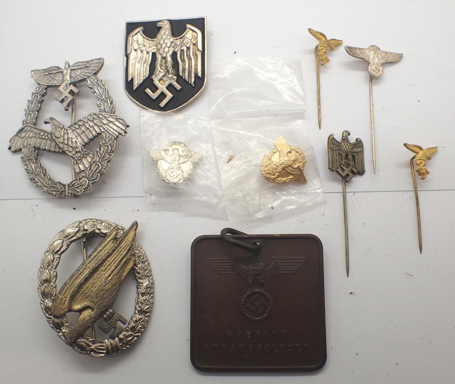 A selection of mixed German Third Reich replica badges including an NSFK Pilot badge and Parachutist award. P&P Group 1 (£14+VAT for the first lot and £1+VAT for subsequent lots)