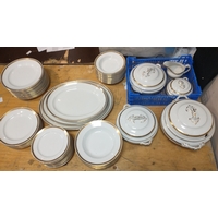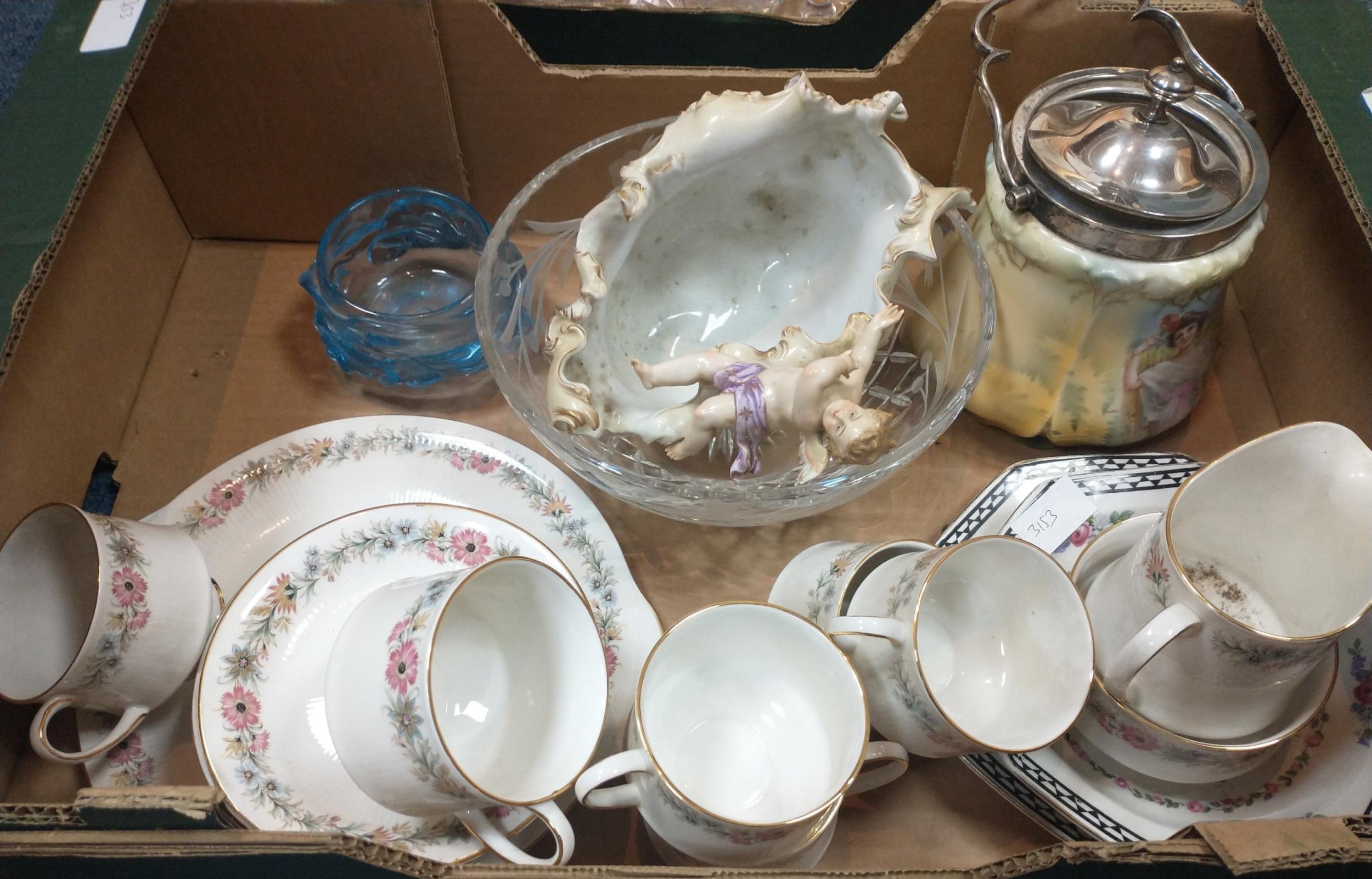 A twenty piece tea set of Belinda by PARAGON consisting of 6 each of cups, saucers and side plates plus milk jug and sugar bowl, plus a first quality EDINBURGH CRYSTAL fruit bowl (23cm dia), a decorative ceramic biscuit barrel 20cm high, an Austrian shell shaped bowl with a cherub (missing a wing and a chip from one edge) 23cm wide approx and 18cm high etc