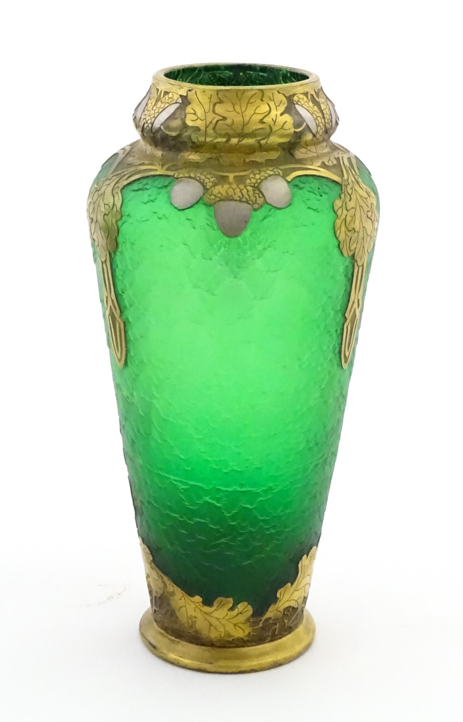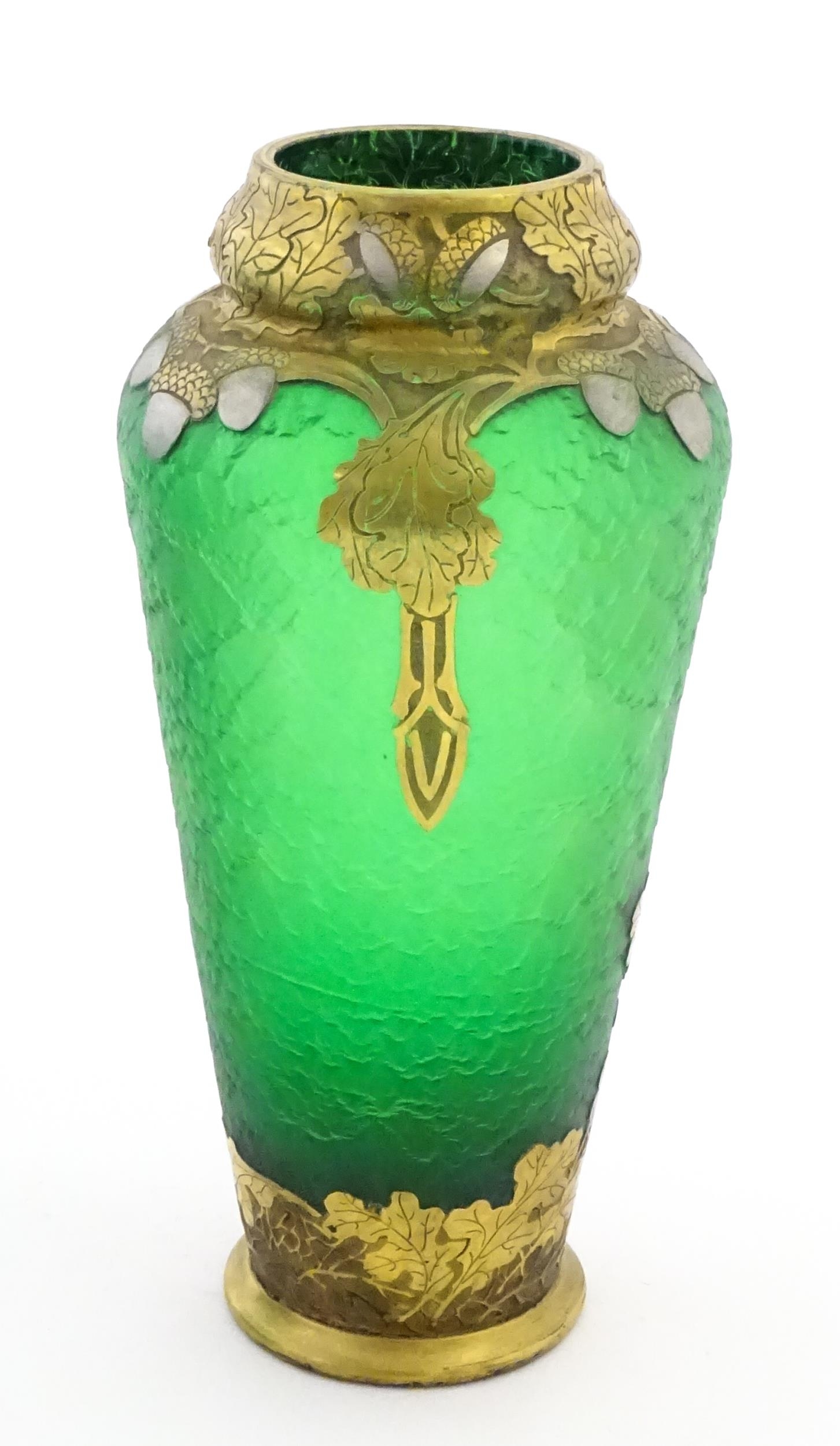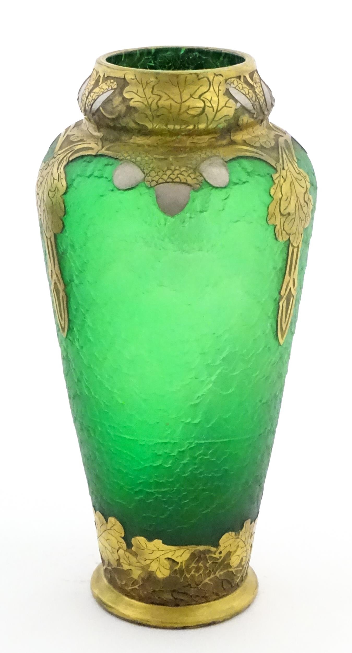 A French Legras & Cie Mont Joye style Art Nouveau green glass vase with gilt oak leaf and acorn detail. Approx. 8 3/4" high