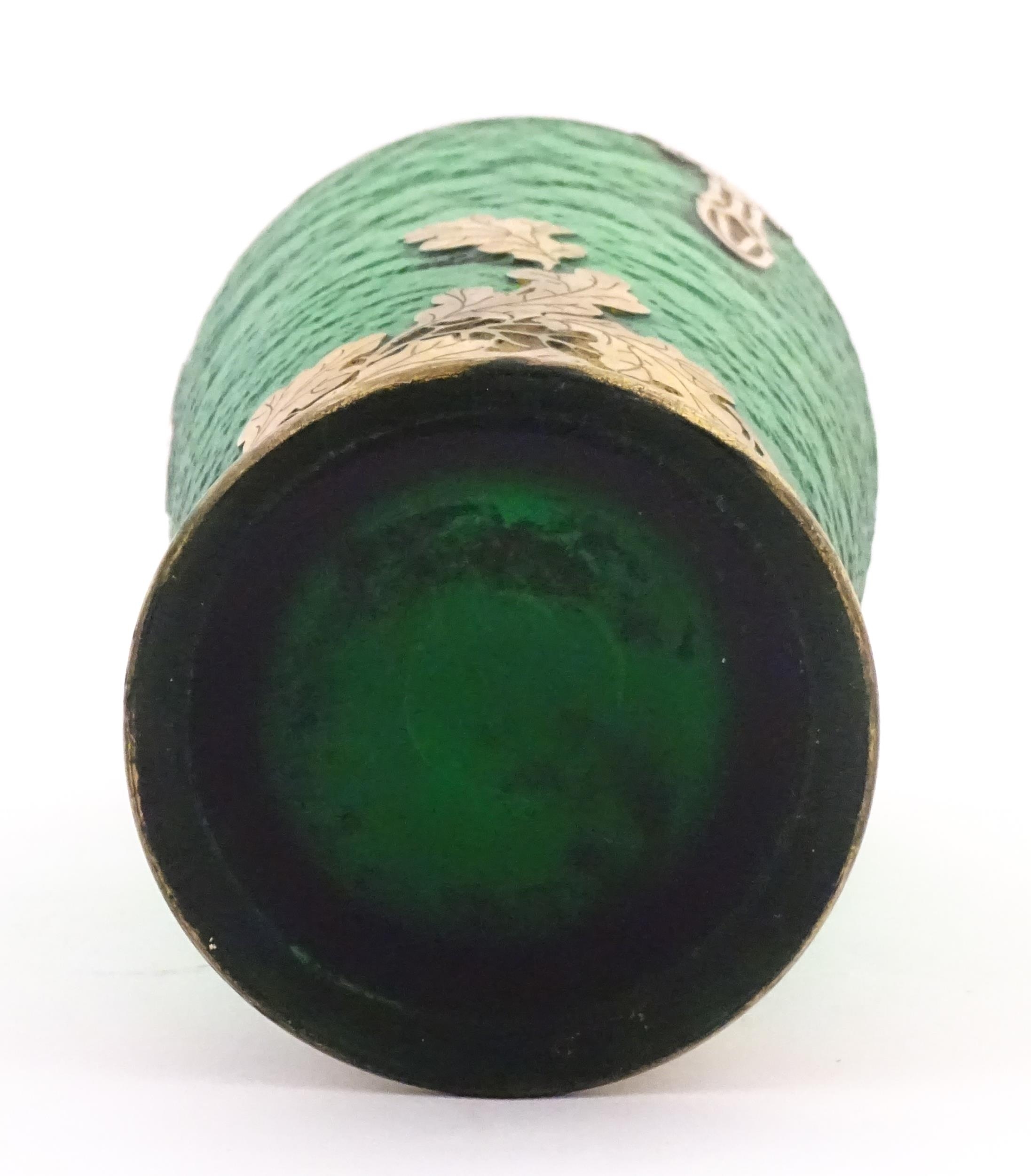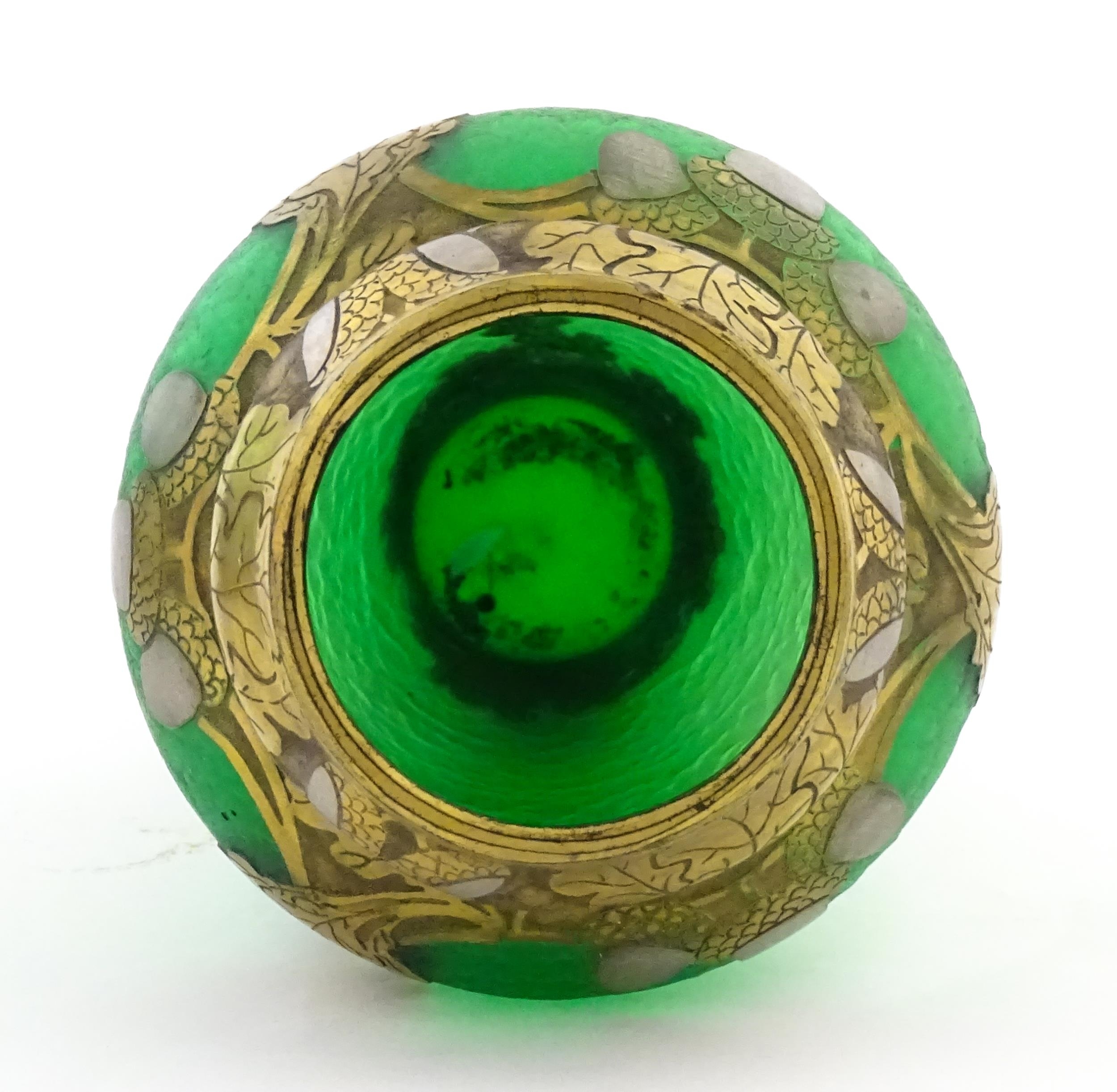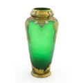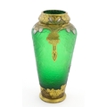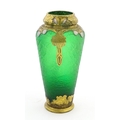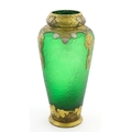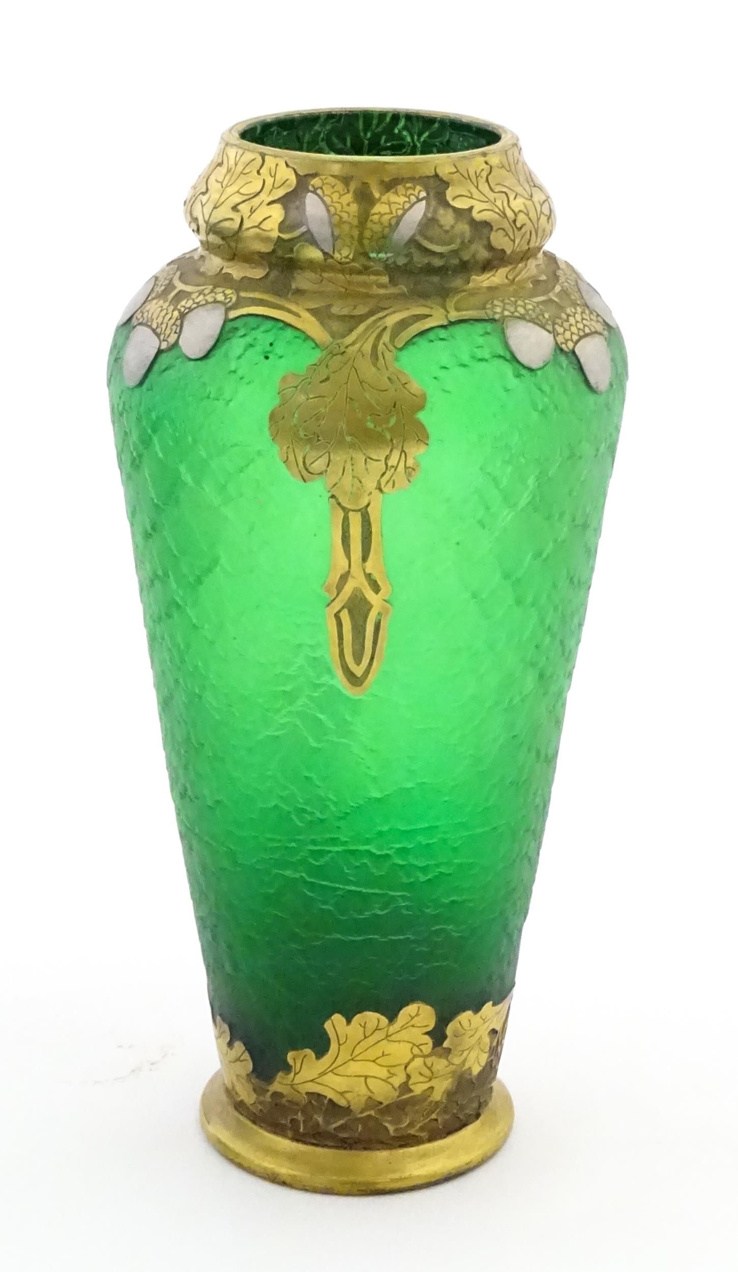 A French Legras & Cie Mont Joye style Art Nouveau green glass vase with gilt oak leaf and acorn detail. Approx. 8 3/4" high