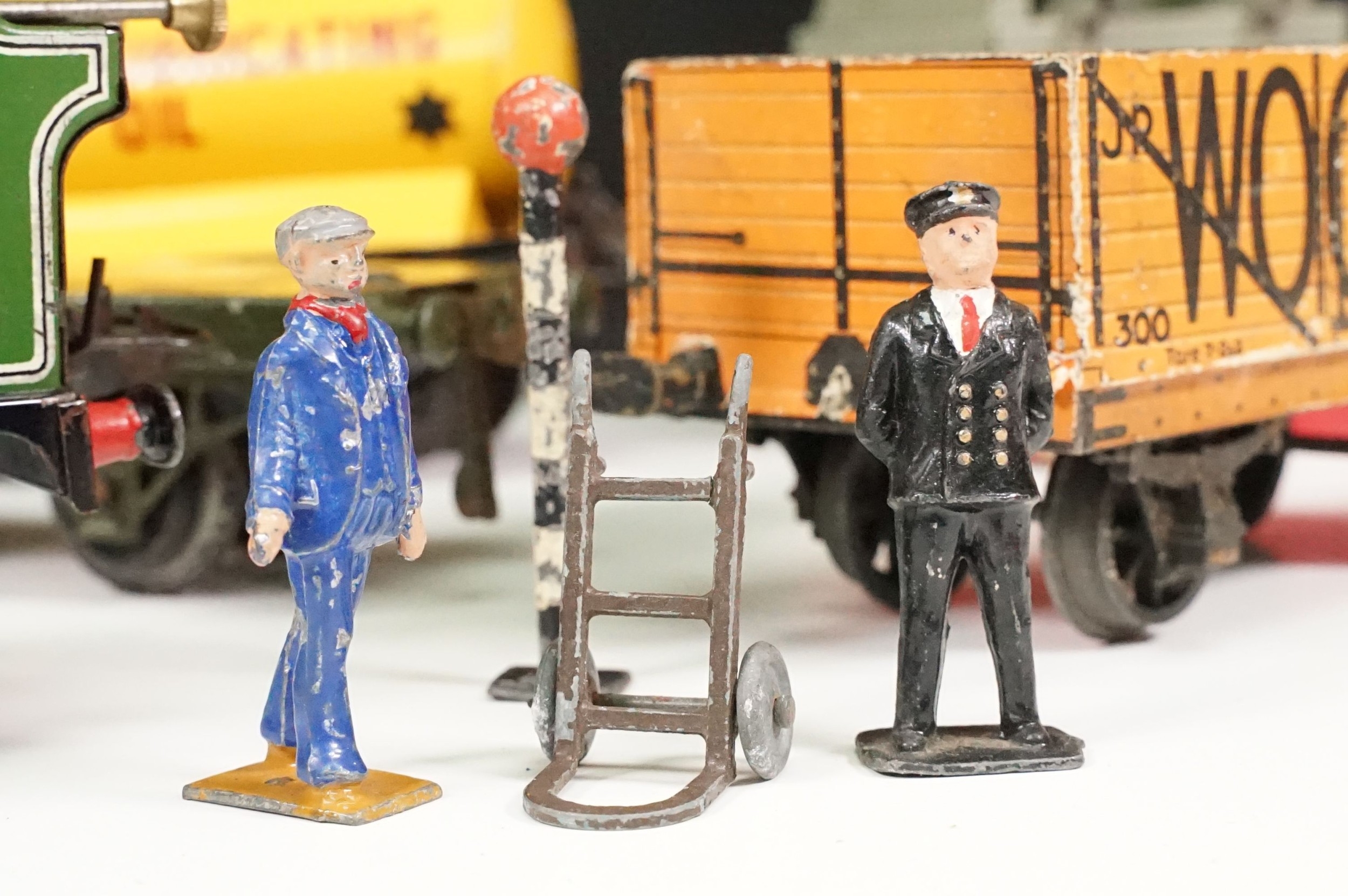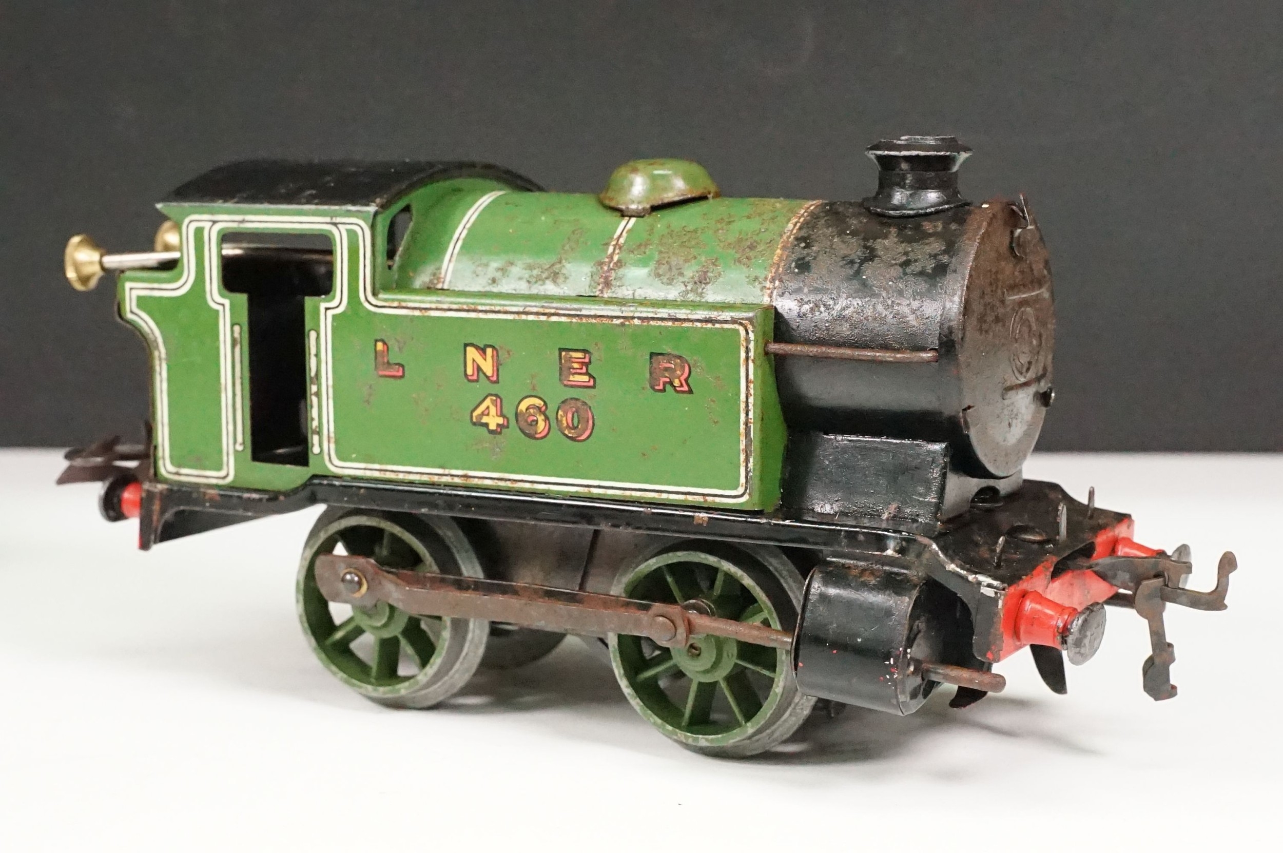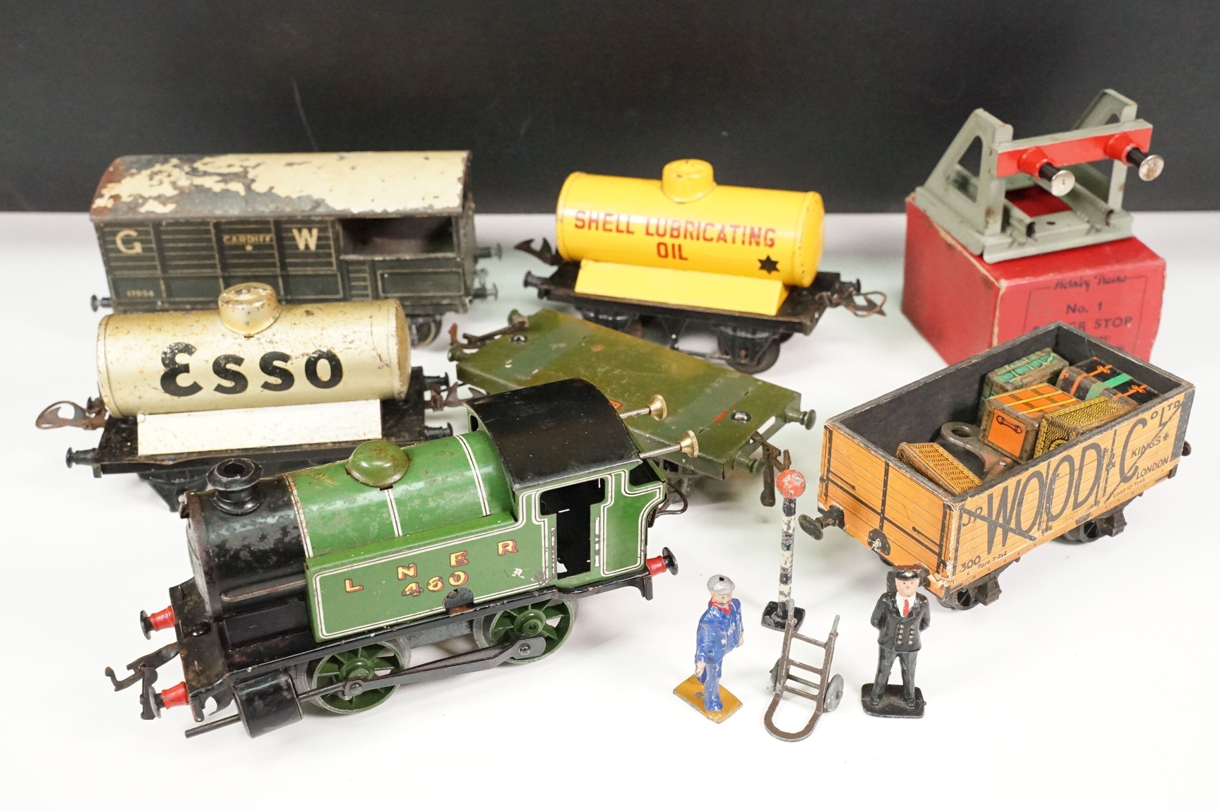 Hornby O gauge clockwork 0-4-0 Tank Locomotive LNER 460, plus quantity of 5 x Hornby O gauge items of rolling stock, quantity of Dinky metal figures and Hornby accessories and boxed Hornby No. 1 Buffer Stop