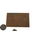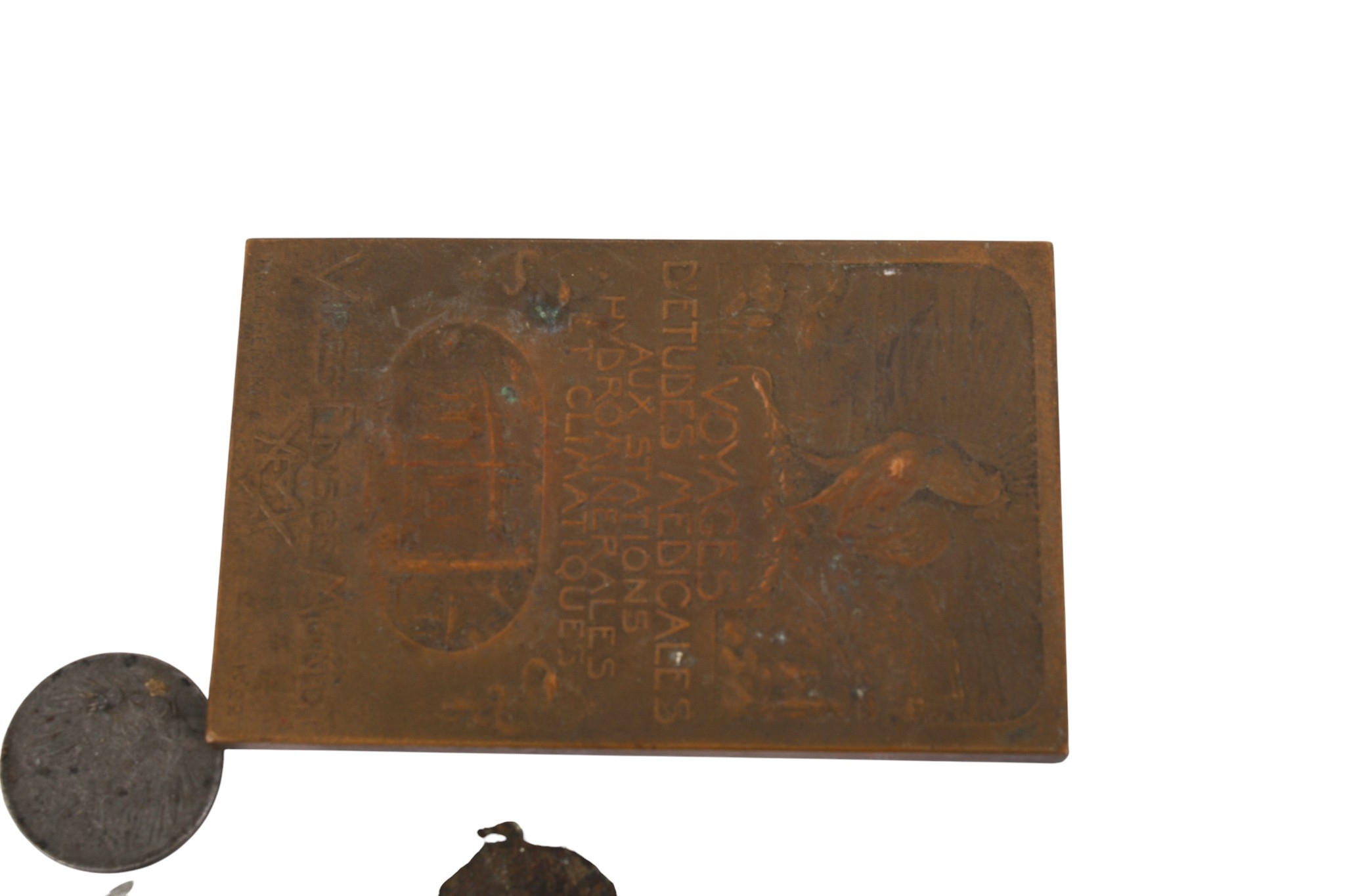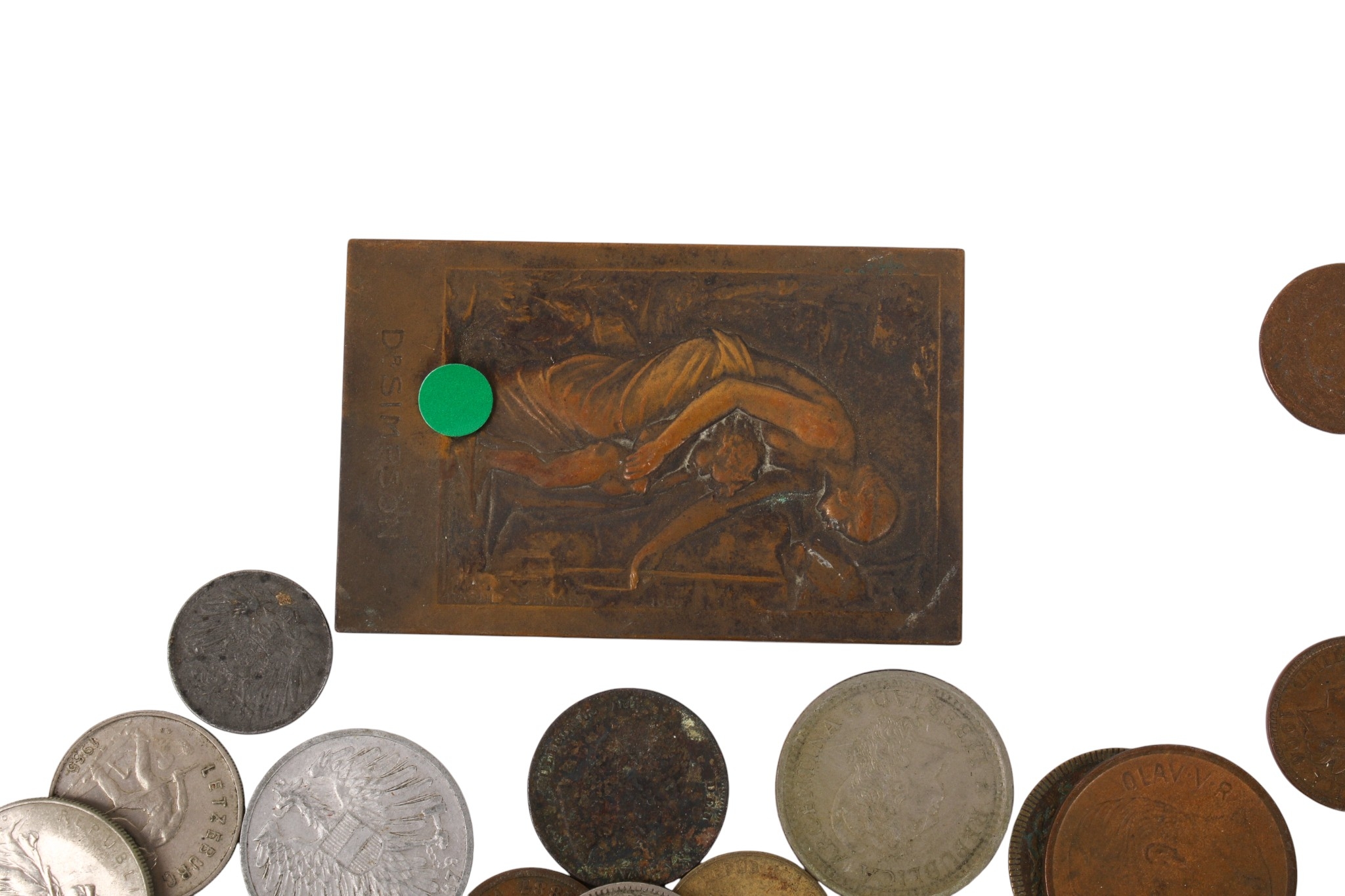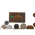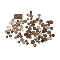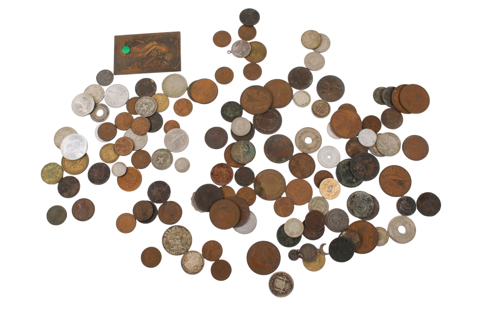 A box of assorted world coins. Some older farthings, also USA coins 20th cnetury German square medallion