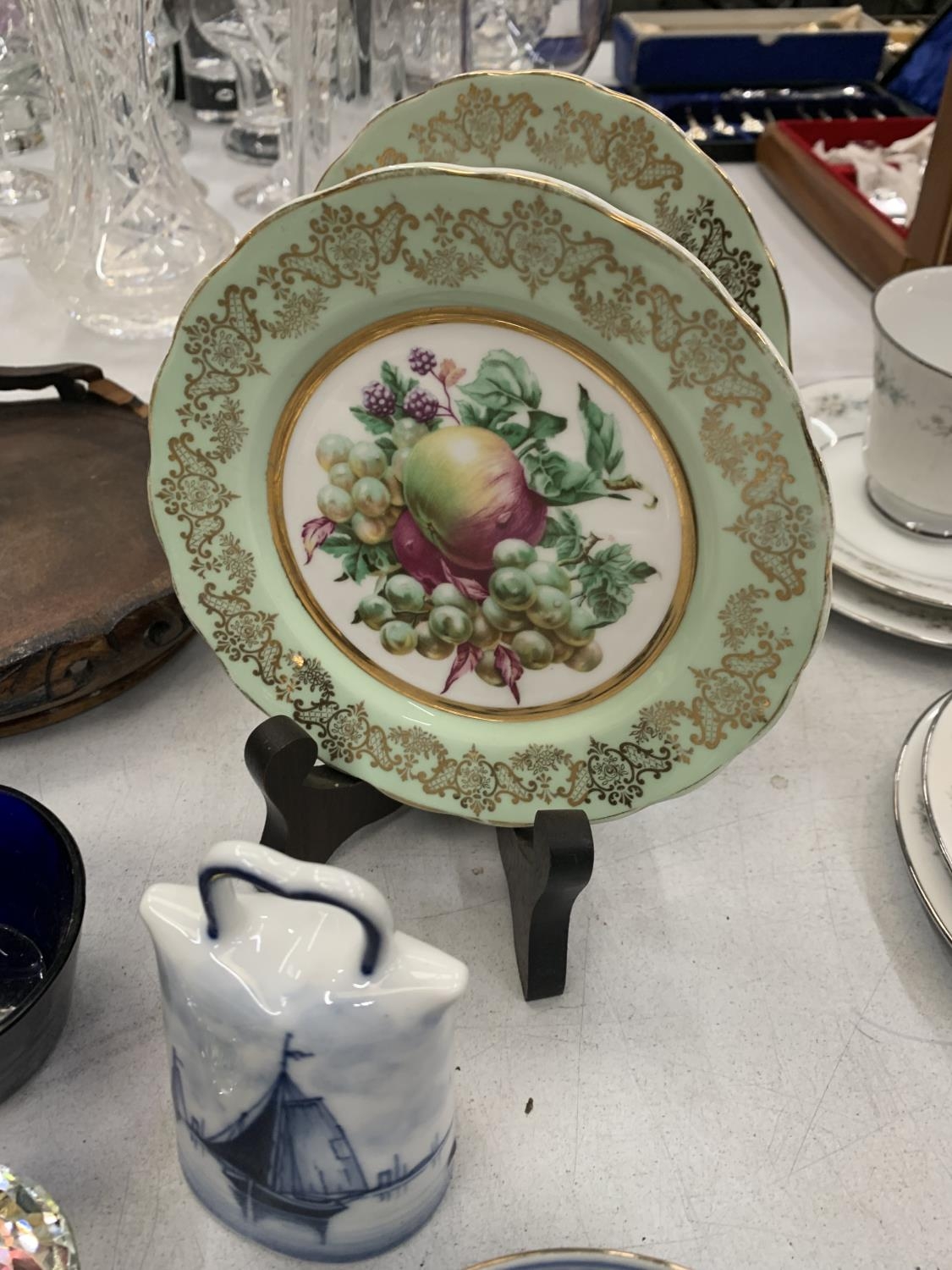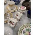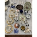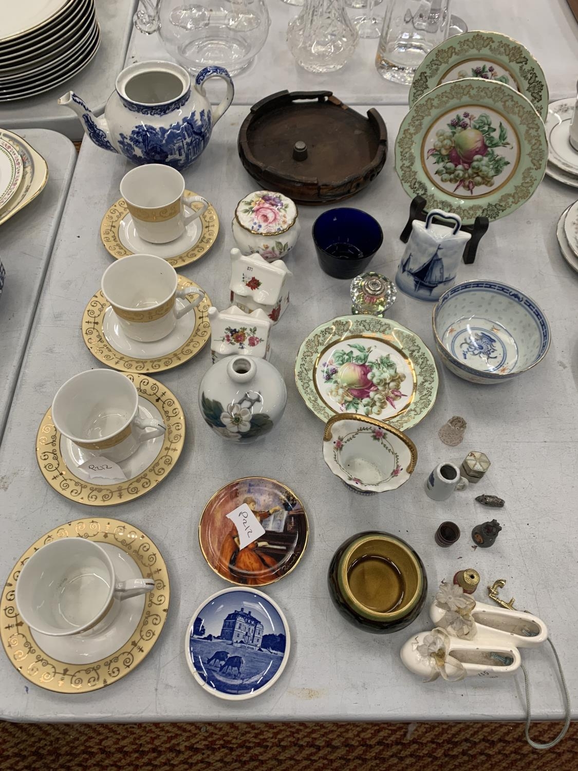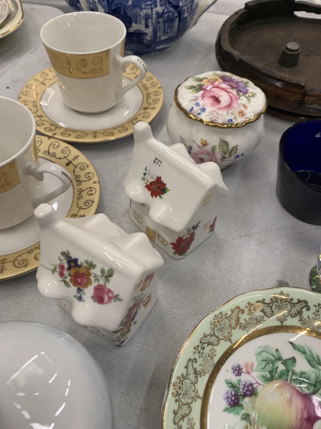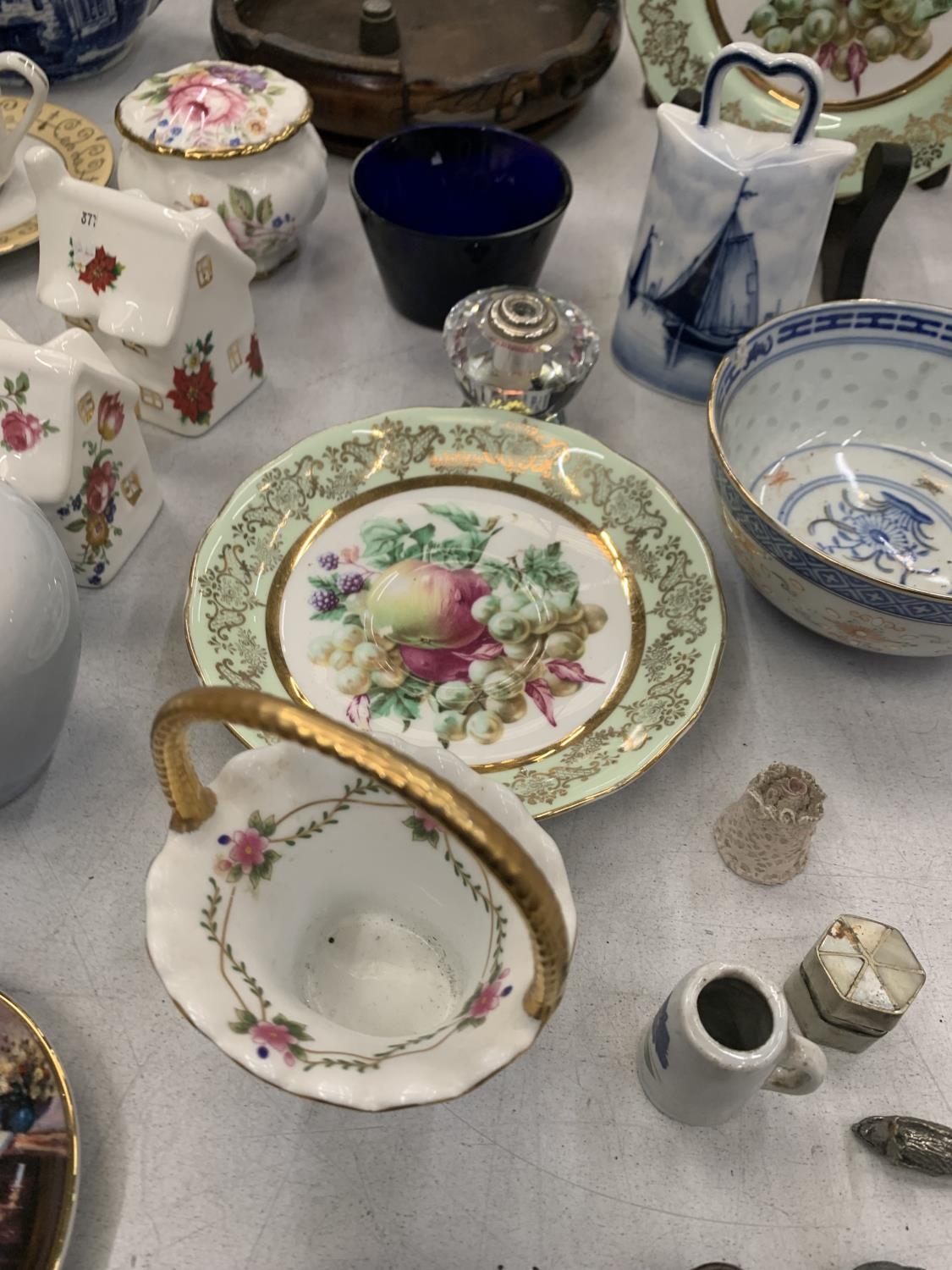 A COLLECTION OF CERAMICS AND CHINA TO INCLUDE CUPS AND SAUCERS, PLATES, COTTAGES, THIMBLES, ETC