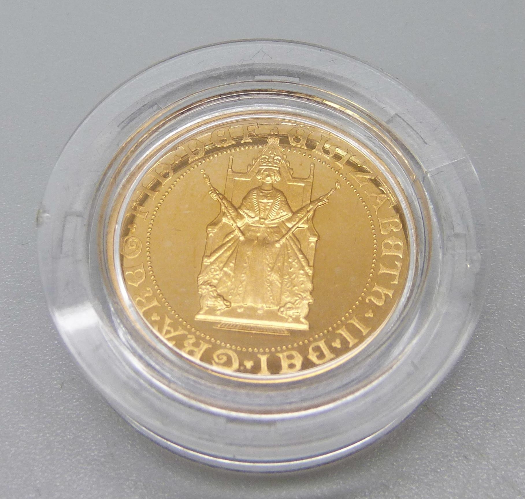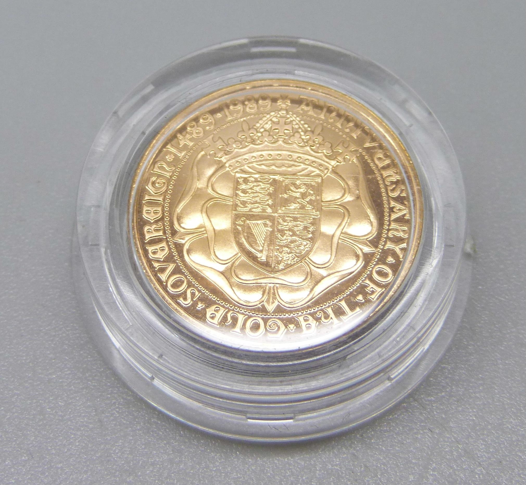 A gold commemorative sovereign, Anniversary of the Gold Sovereign, 1489-1989, 8g