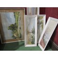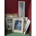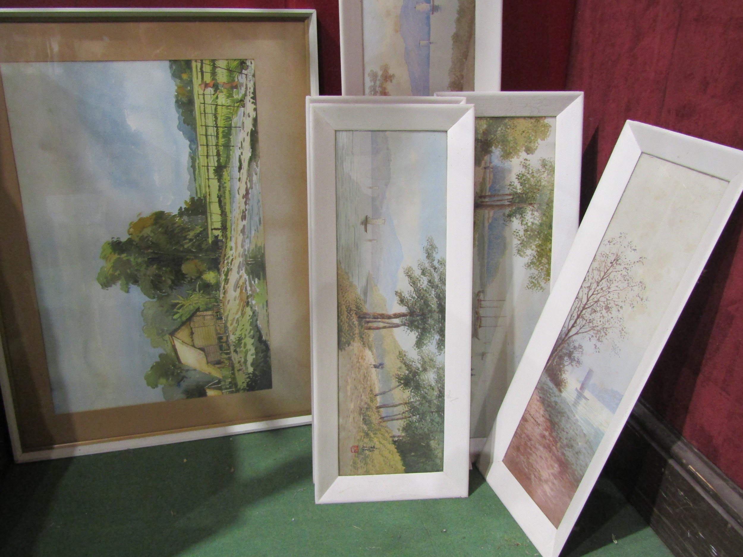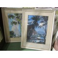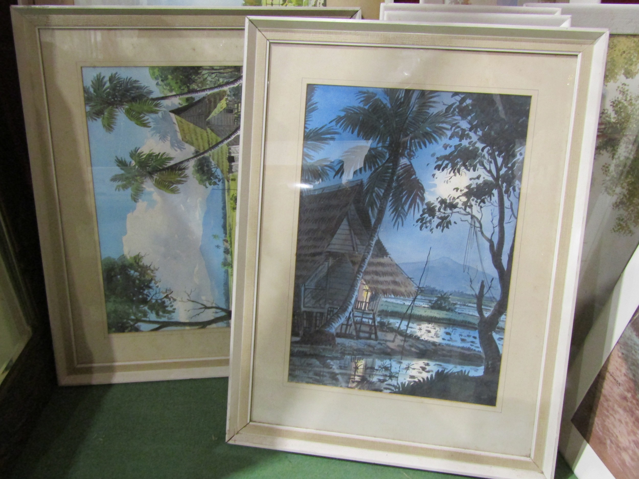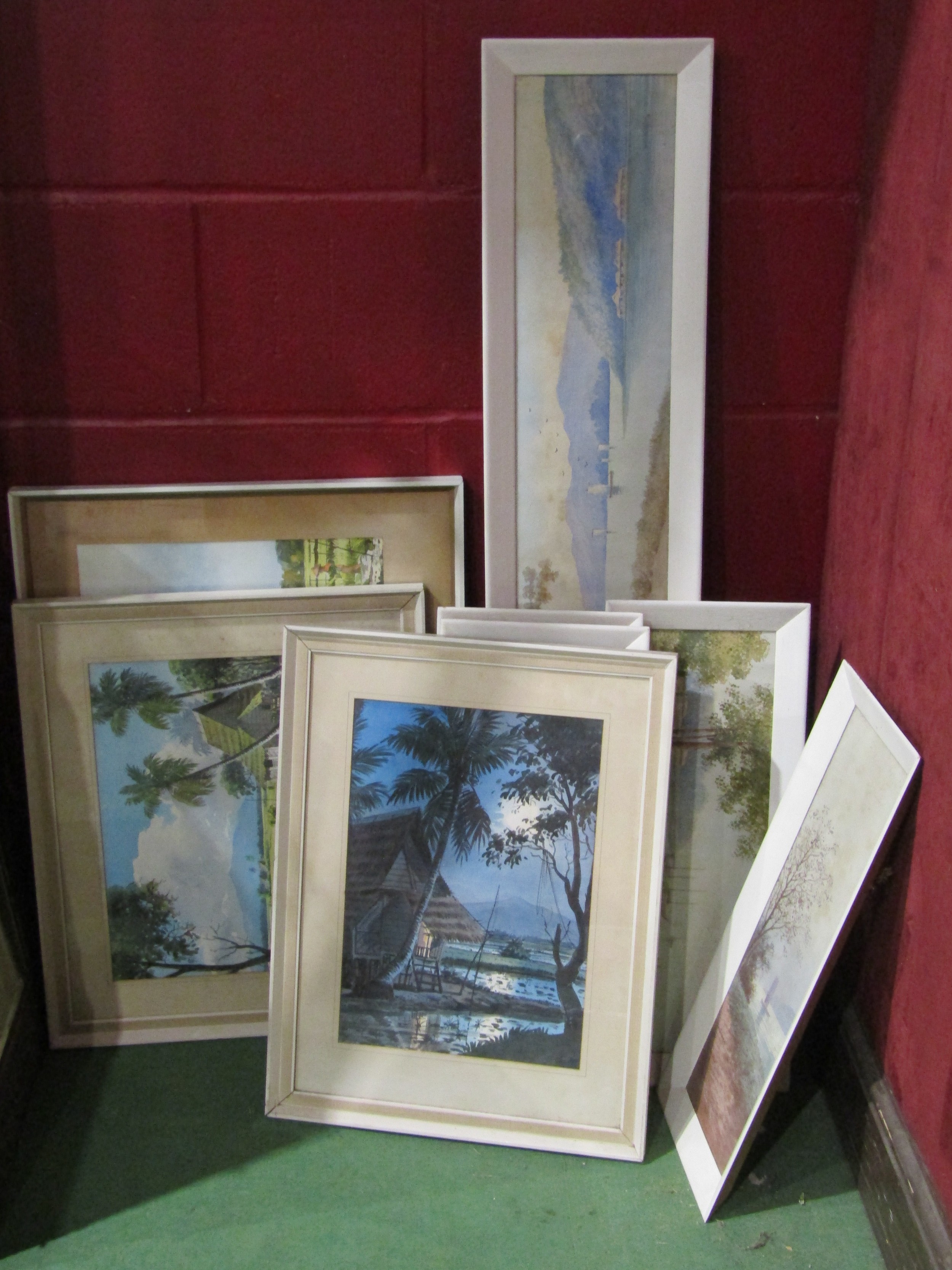 A collection of Asian watercolours, including J. Honaga and A.B. Ibrahim, all framed and glazed, plus a mirror