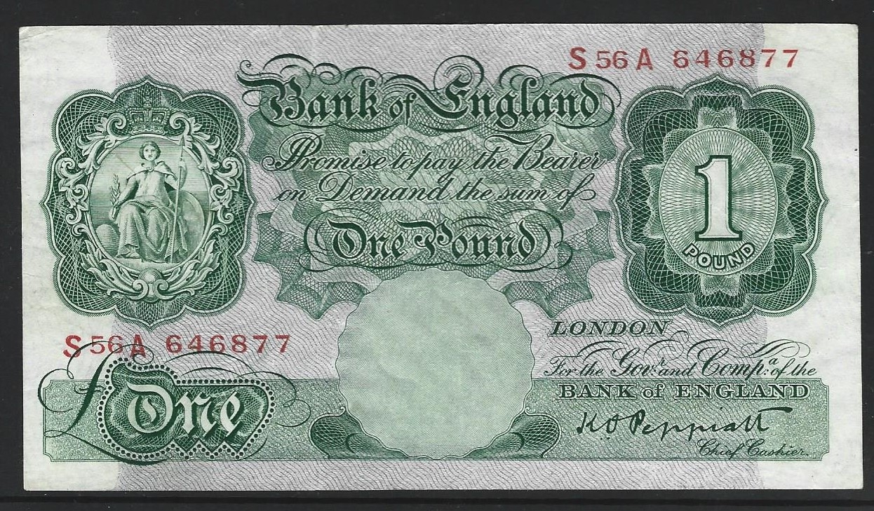 BANKNOTE. United Kingdom, Bank of England, 1 Pound, ND(1948), sign. K.O. PEPPIATT, Duggleby-B260 (BE52a), first series, serial number S56A 646877, VF