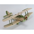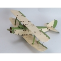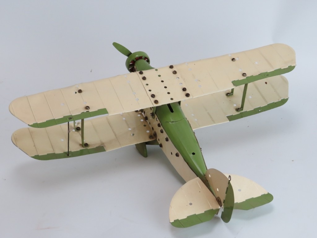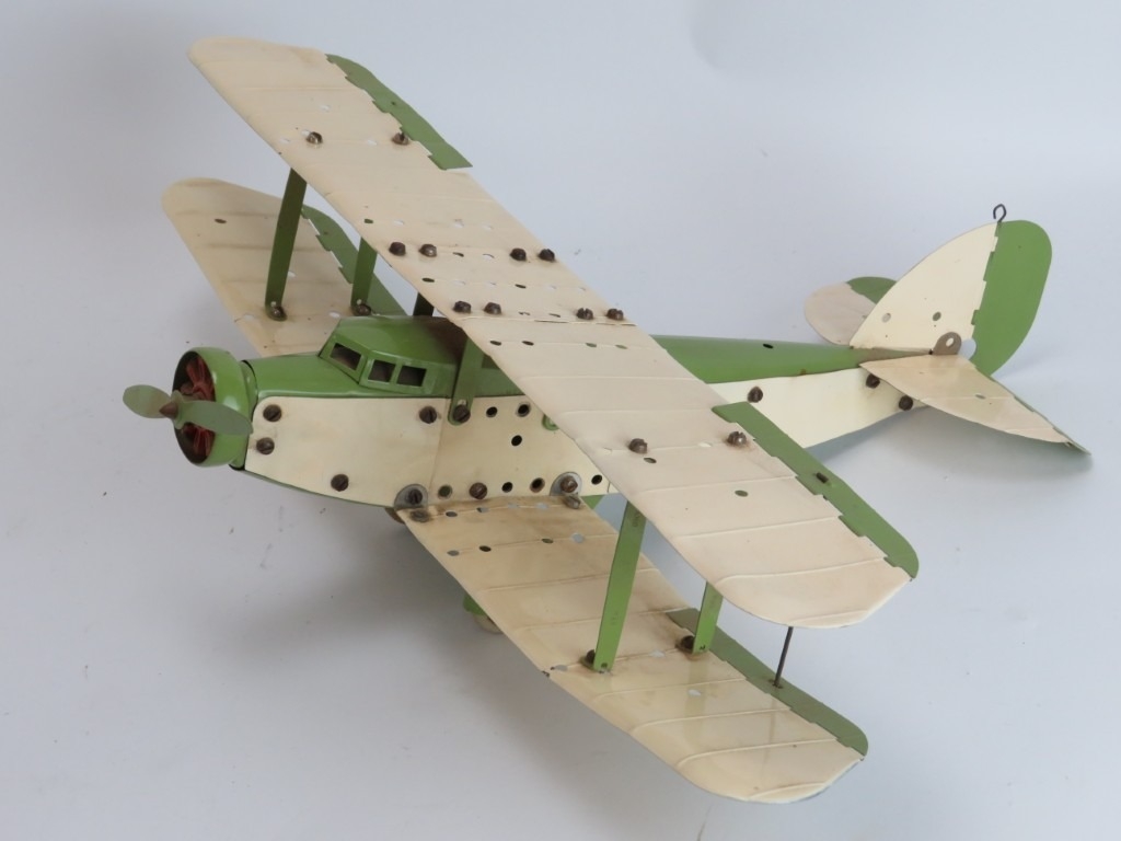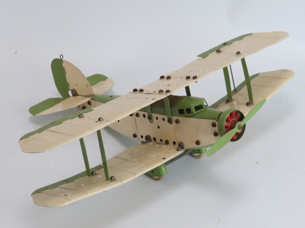 A Meccano constructed cream and olive green biplane aircraft, circa 1930s. Wingspan: 46.7 cm width.