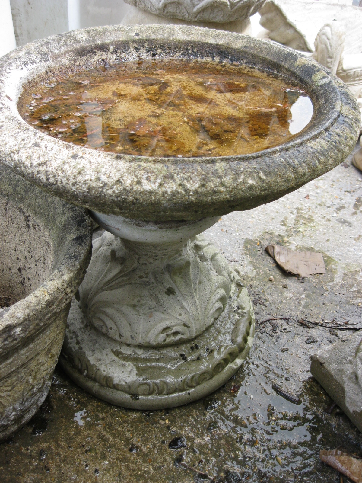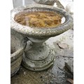A small stonecrete garden bird bath on pedestal, in good order, weathered