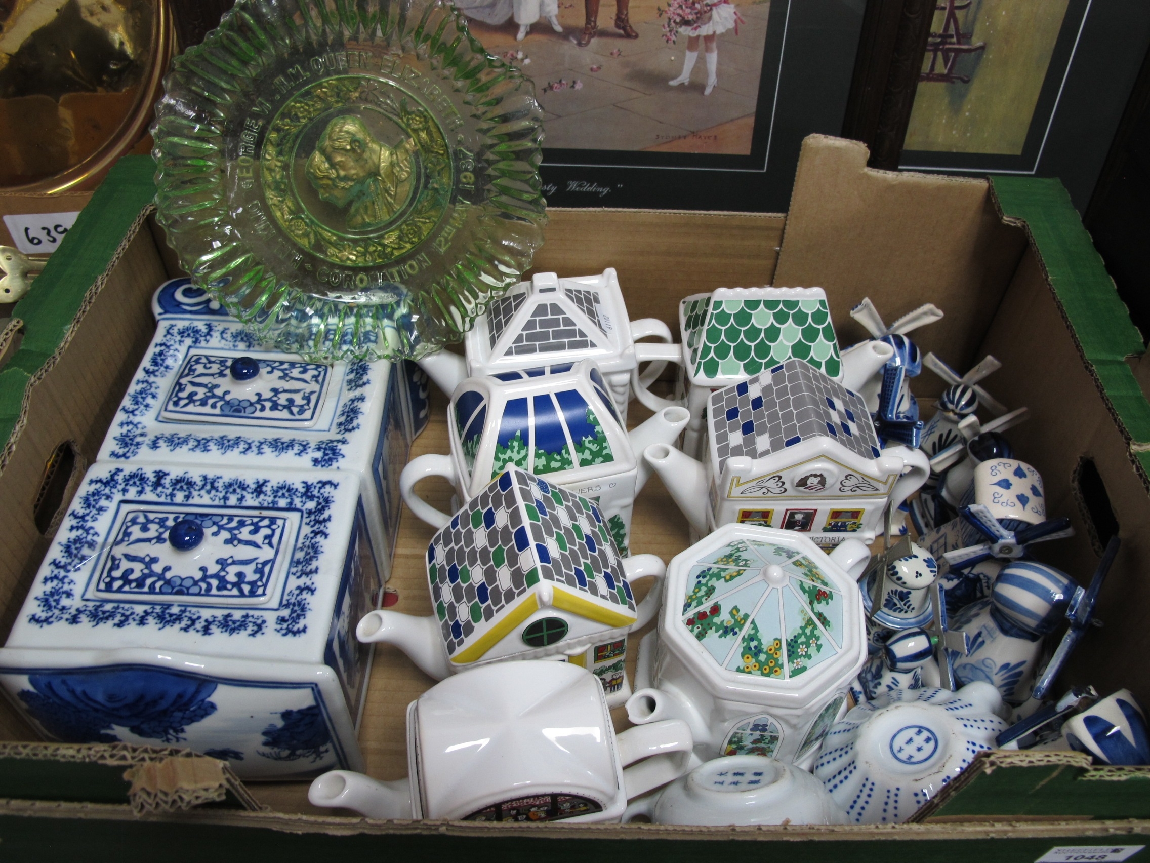 A Blue and White Miniature Ceramic Set of Drawers, marked 'Regency Ironstone' to base, eight Wade 'English Life Teapots' nine Dutch ceramic windmills and a green glass Coronation 1937 plate:- One Box