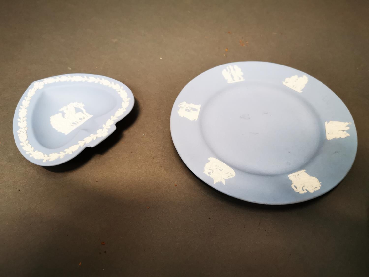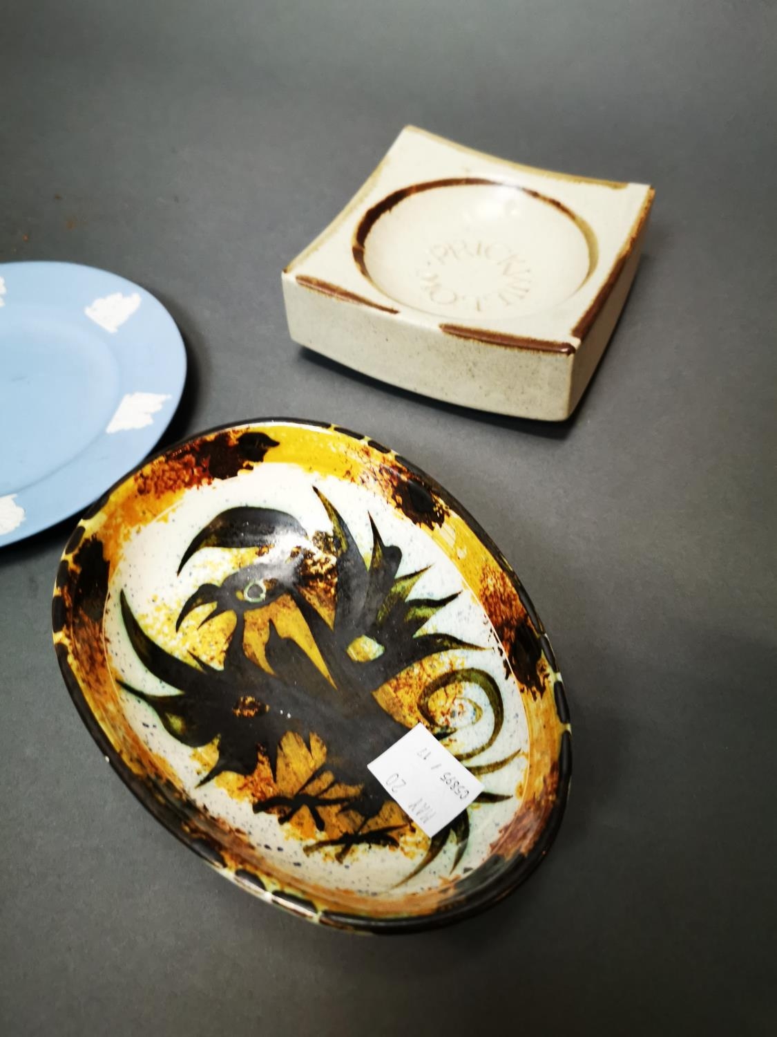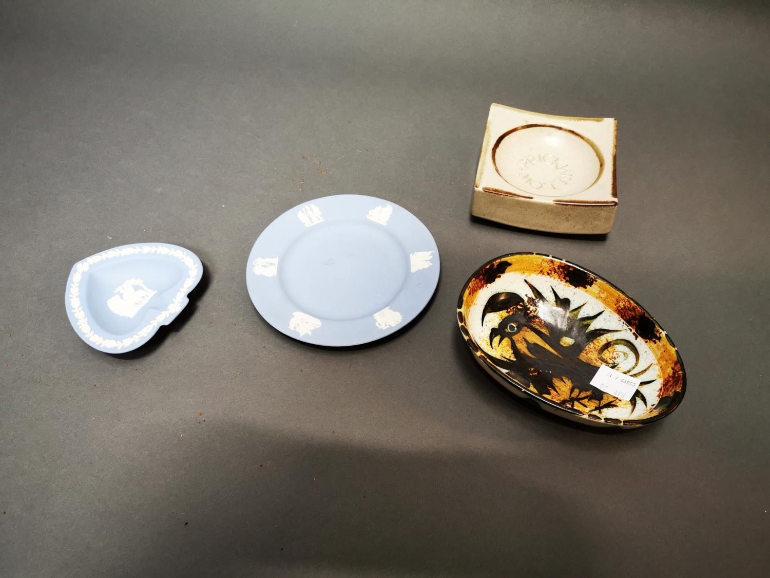 Prickwillow pottery ashtray, ceramic dish and two pieces of Wedgewood.
