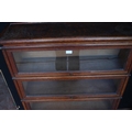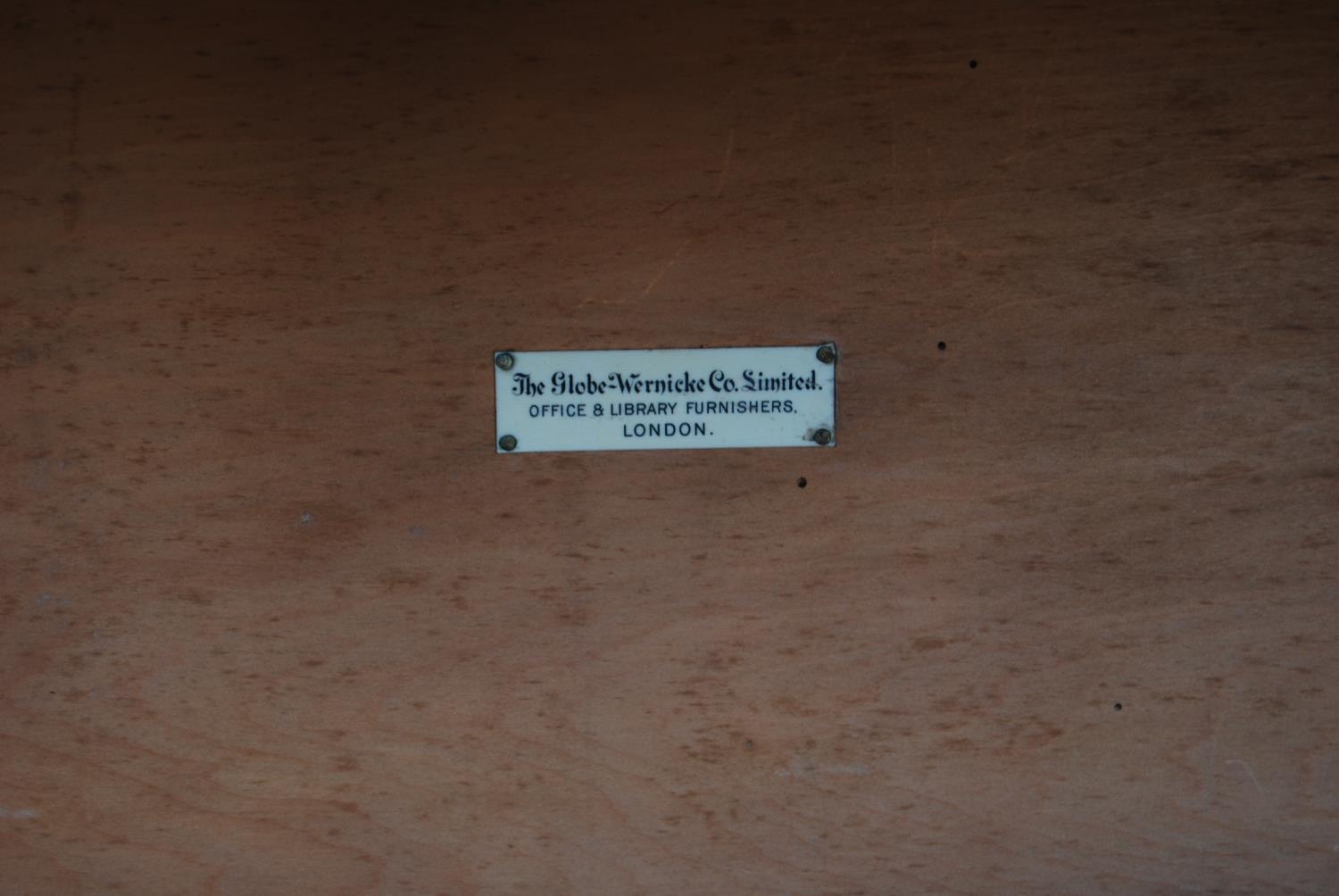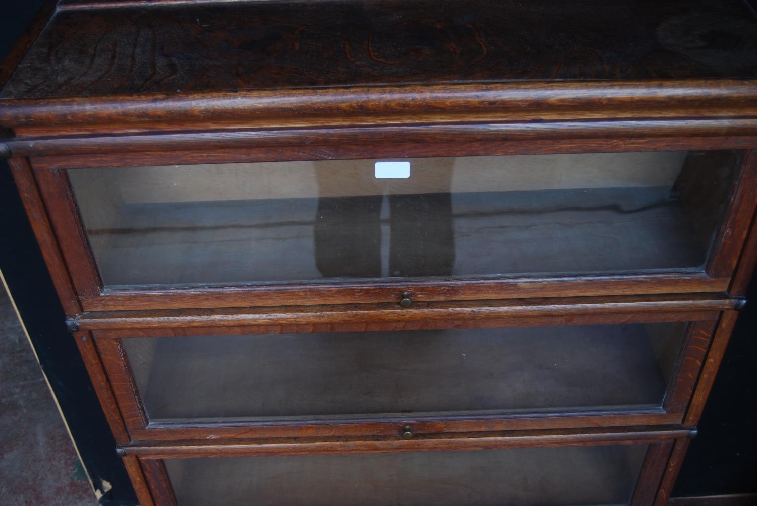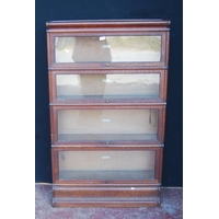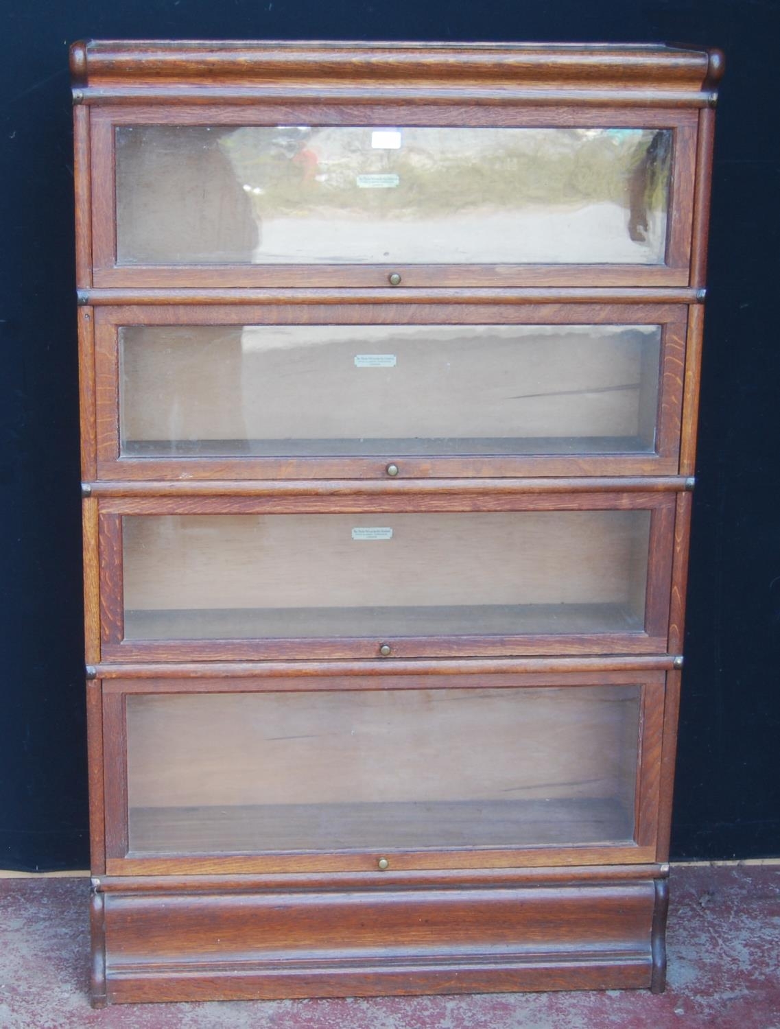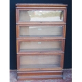 Globe Wernicke oak stacking bookcase, with four glazed sections, on base, with label to each section 'The Globe Wernicke Co Ltd, Office & Library Furnishers, London', 140cm high, 88cm wide and 27cm deep.