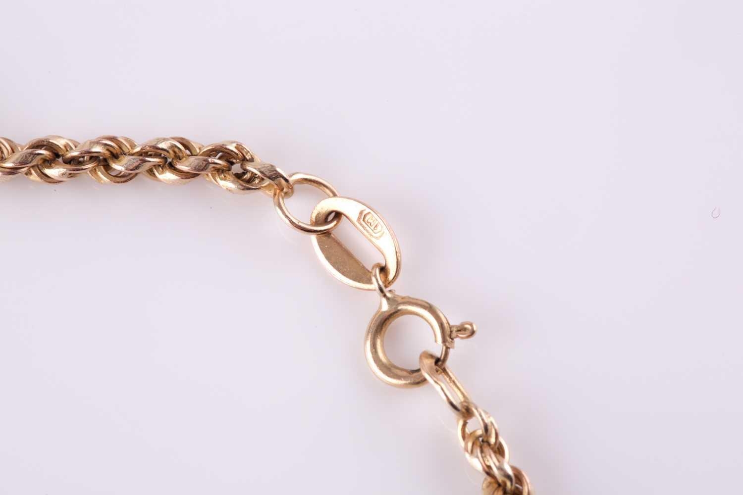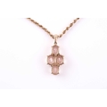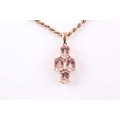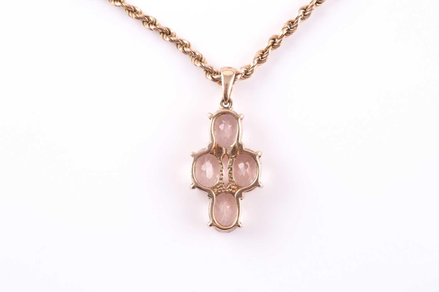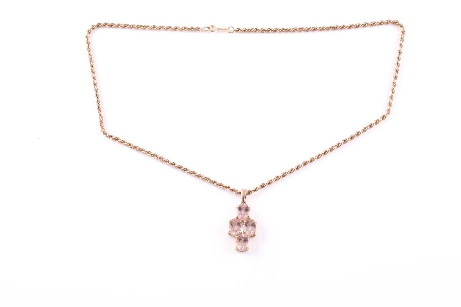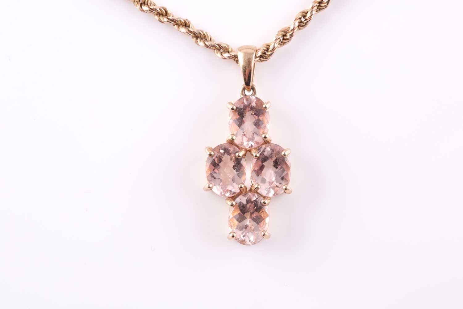 A 9ct yellow gold and morganite pendant, set with four mixed oval-cut morganites with chequerboard faceting, pendant approximately 3.3 cm long, including suspension loop, suspended on a 9ct yellow gold rope-twist chain, 9 grams.