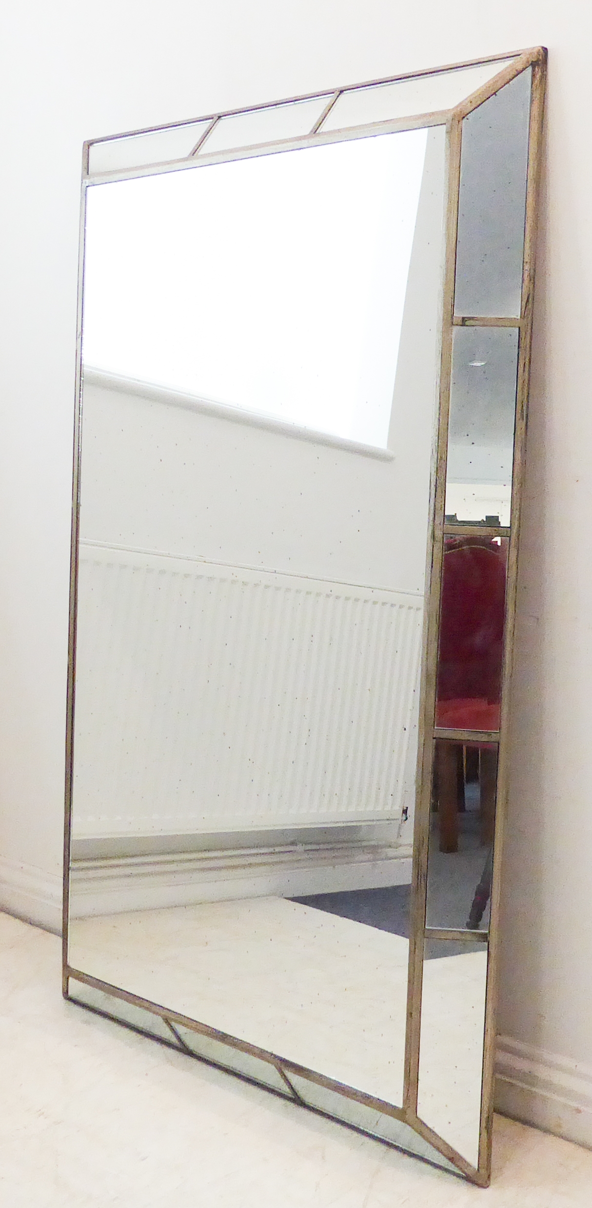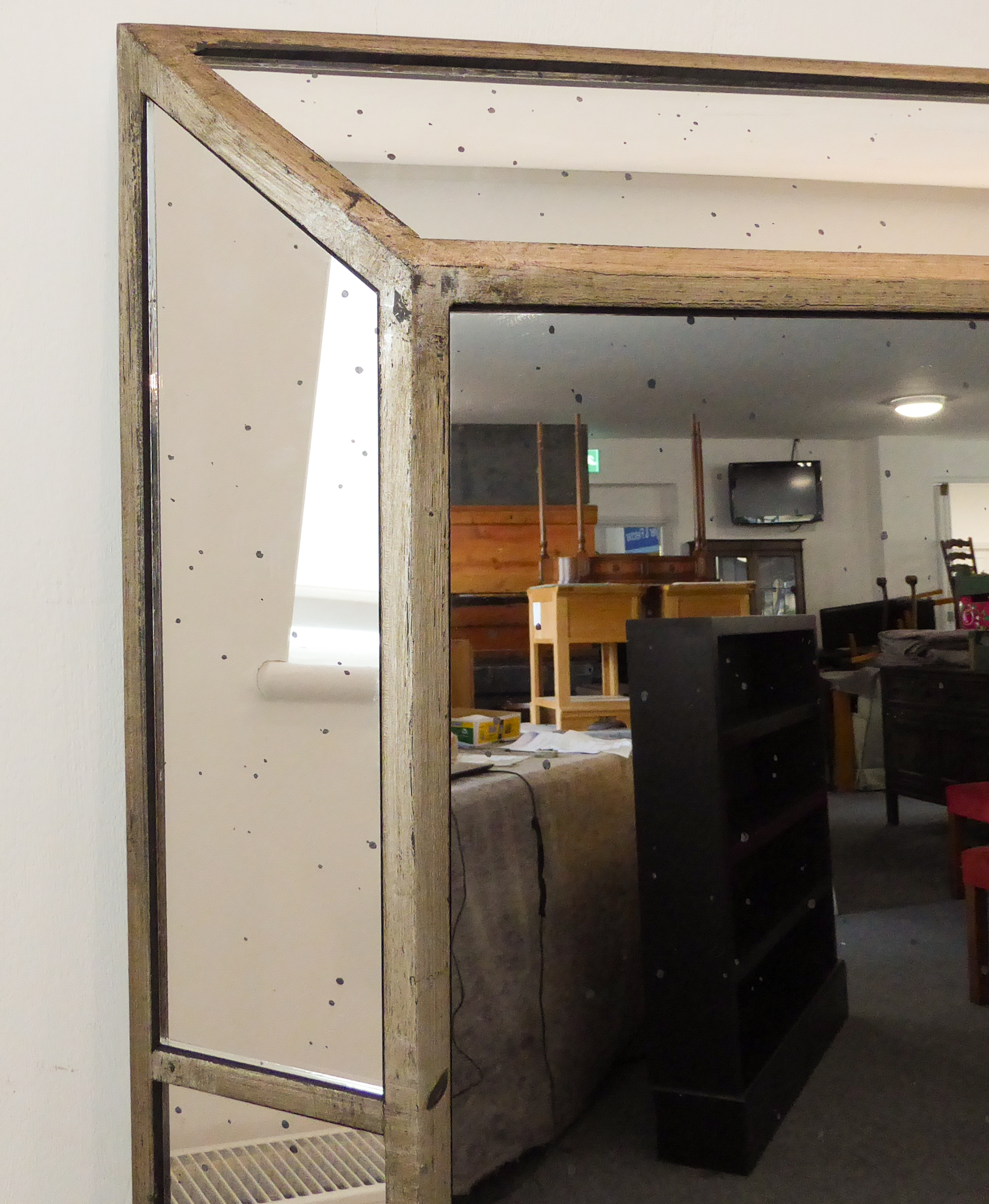 A large modern wall-hanging looking glass from OKA: angular segmented frame and artificial distressing (frame size 140cm x 89cm wide)