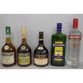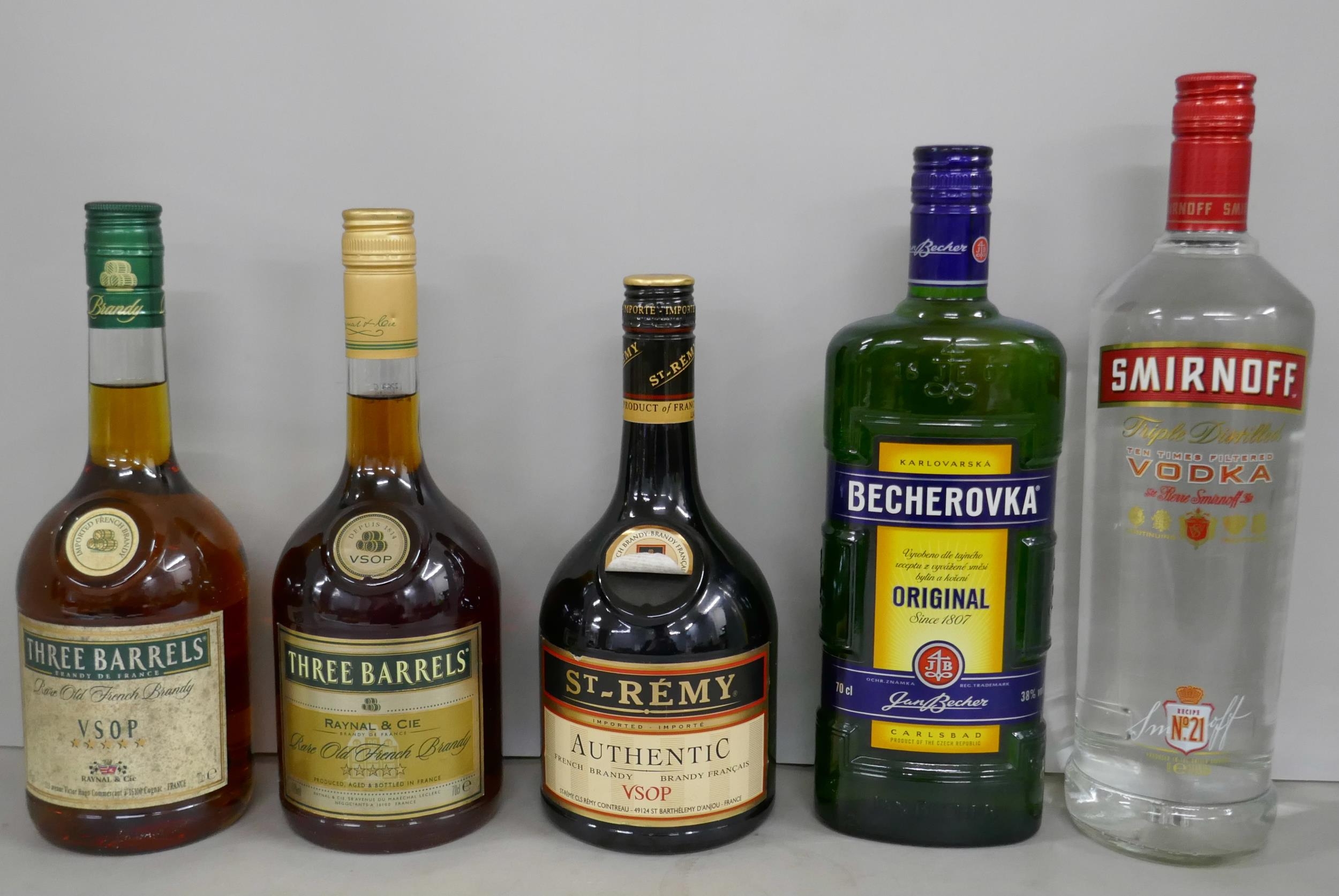 Collection of alcohol to include three bottles of brandy, two bottles Three Barrels, St-Remy together with Smirnoff vodka and Becherovka - Czech liqueur