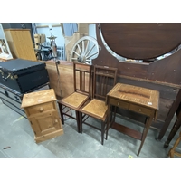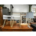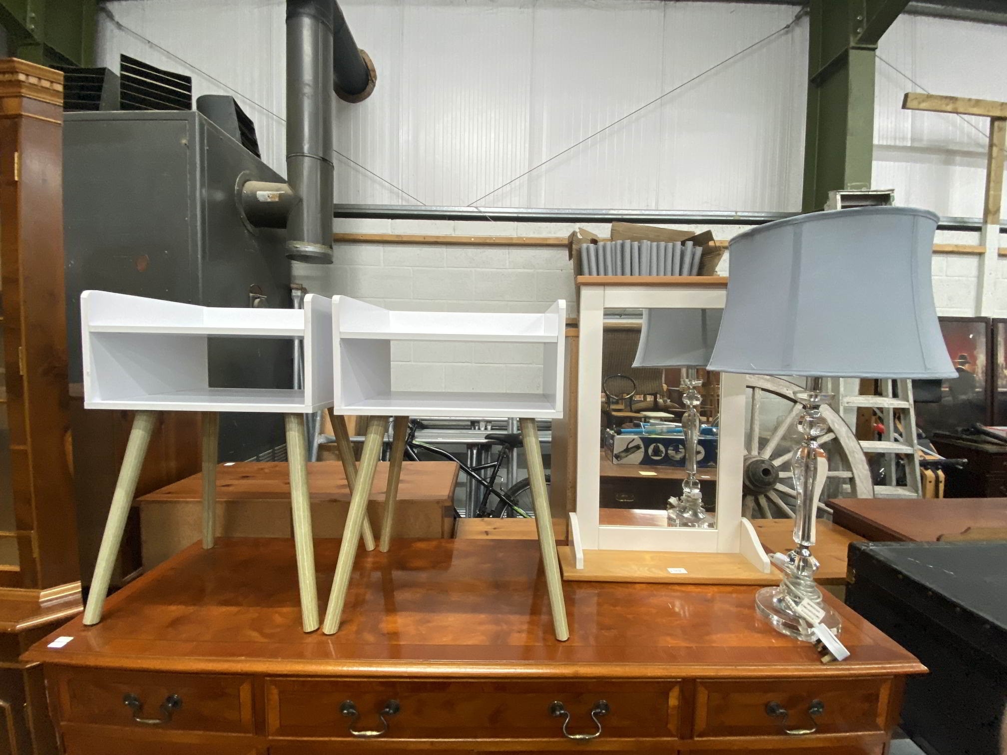 Pair of contemporary white bedside tables 60H 40W 30D, table lamp and a pine dressing table mirror 70H 50W