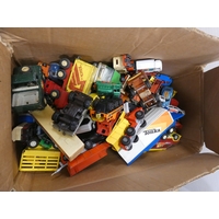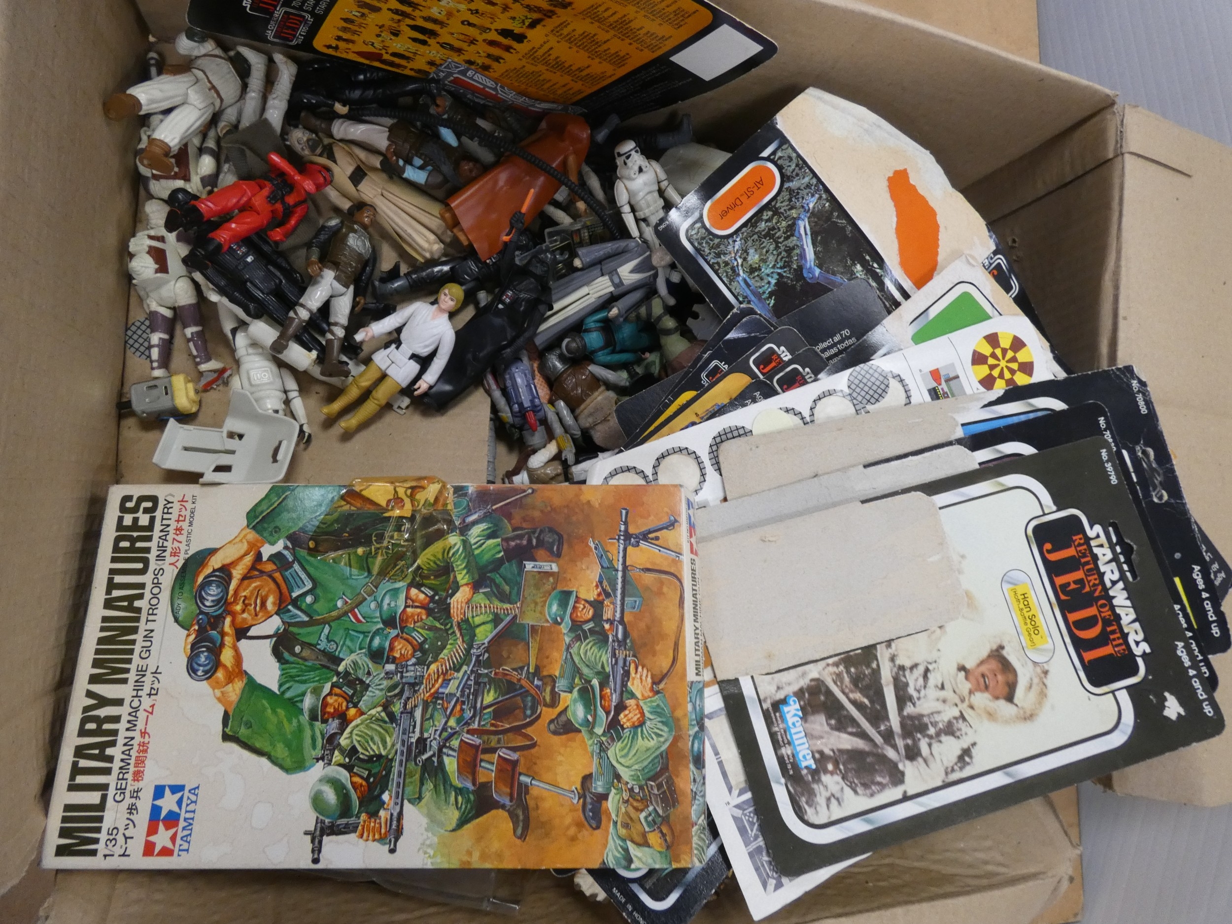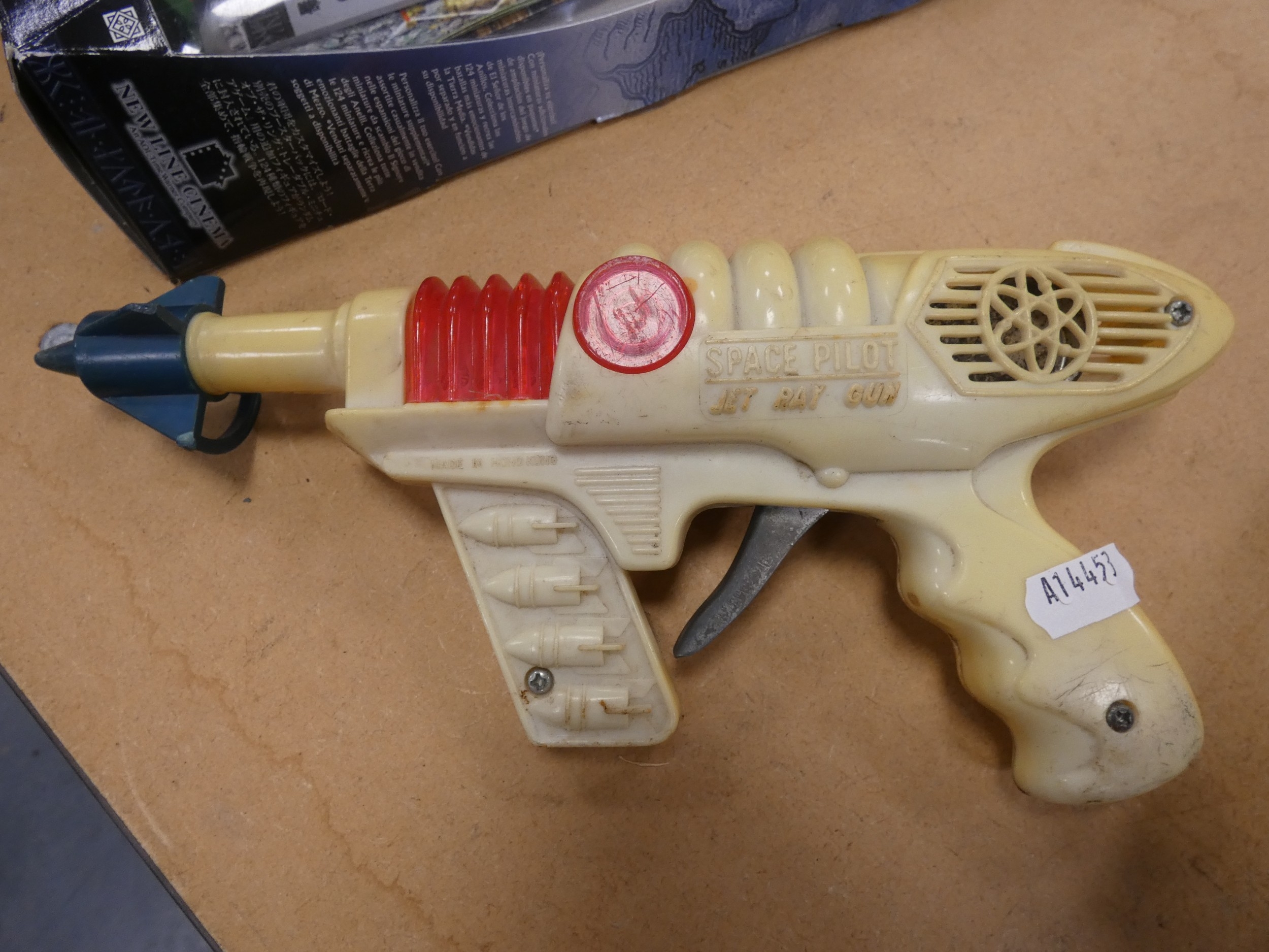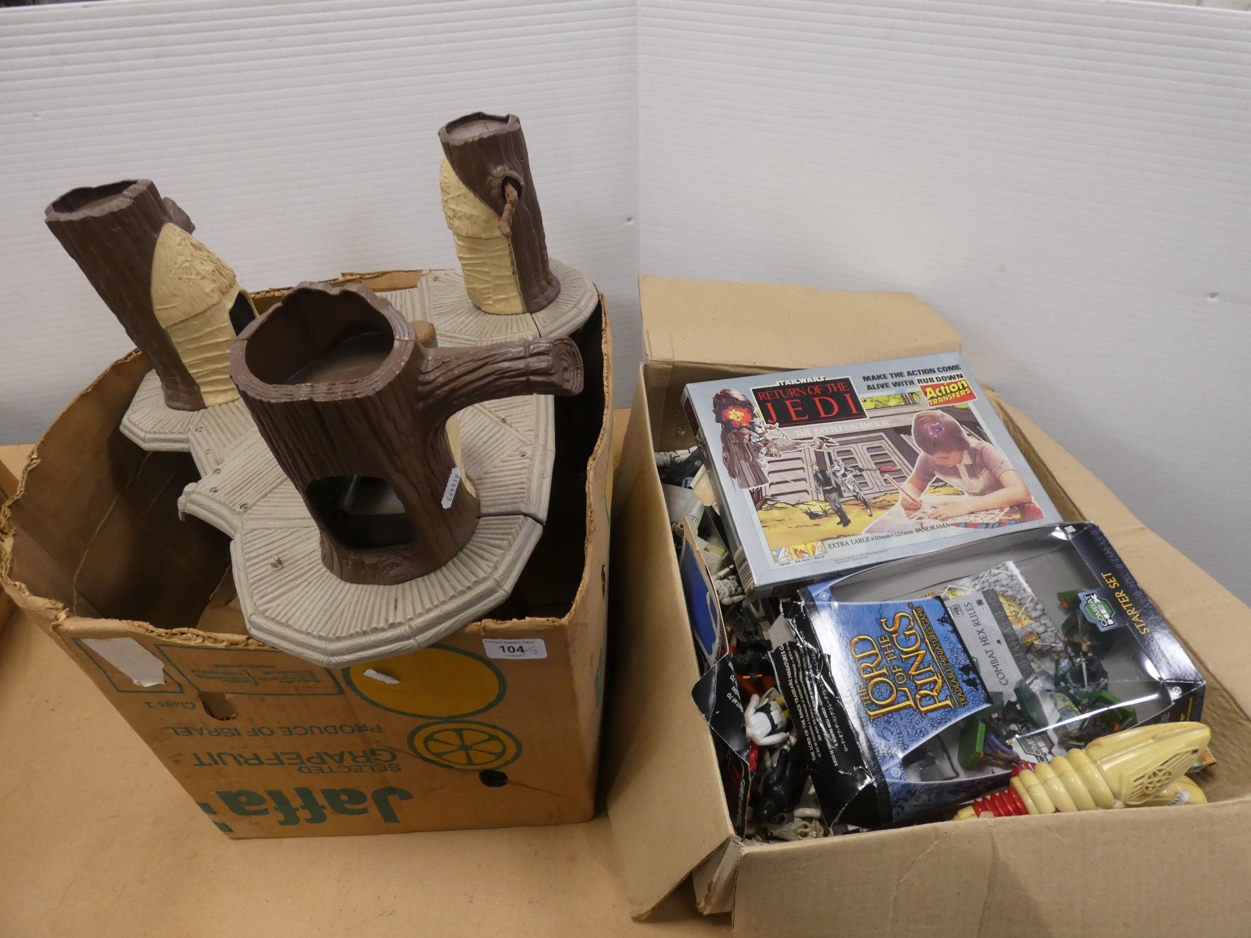 Two boxes of childrens toys to include Space Pilot "Jet Ray" gun, Lord of The Rings, games, Star Wars figures etc.
