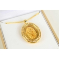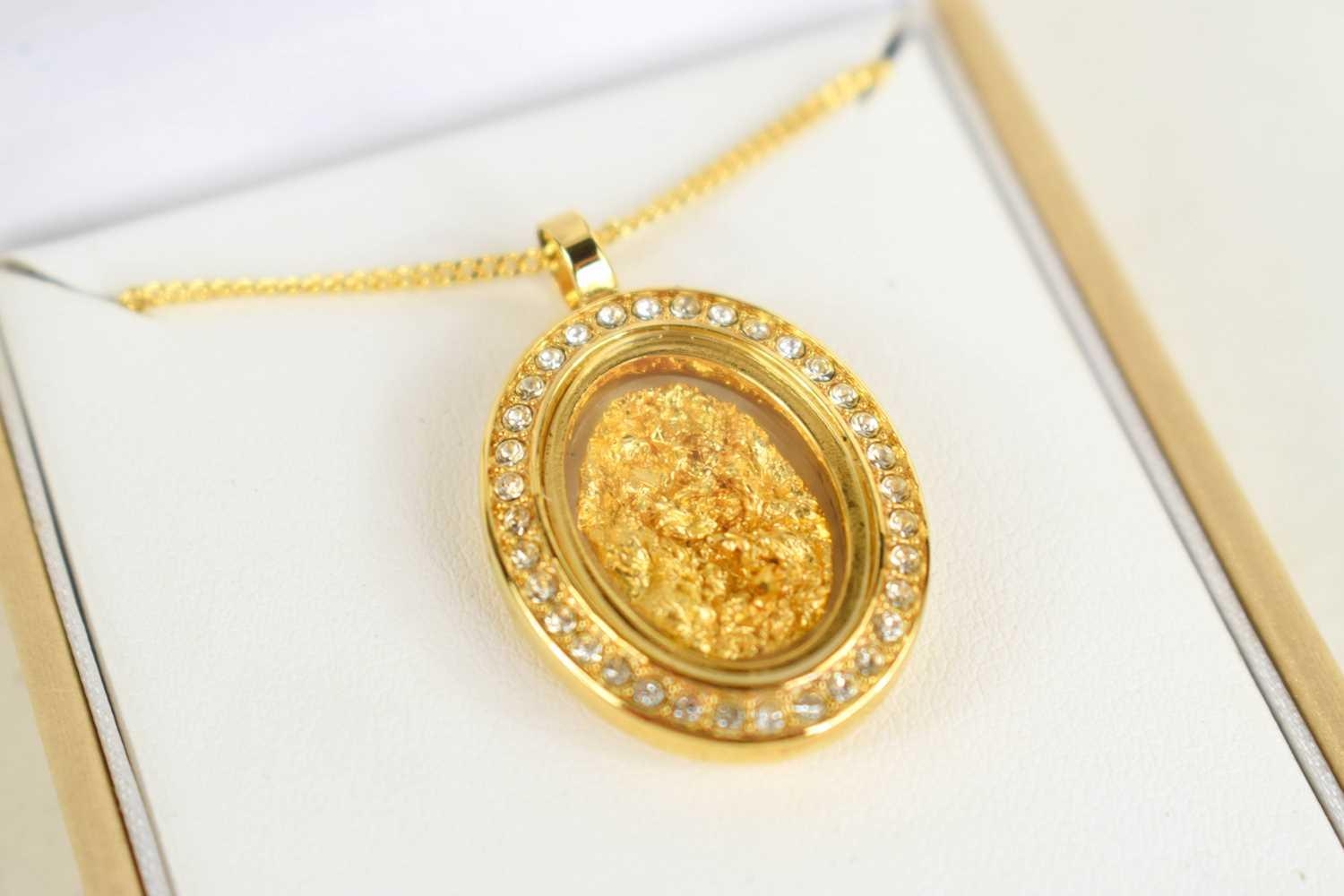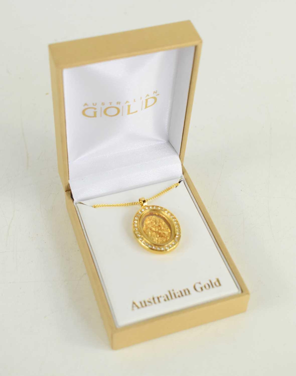 An Australian gold nugget pendant, encapsulated within a decorative oval locket with plated mounts and chain.