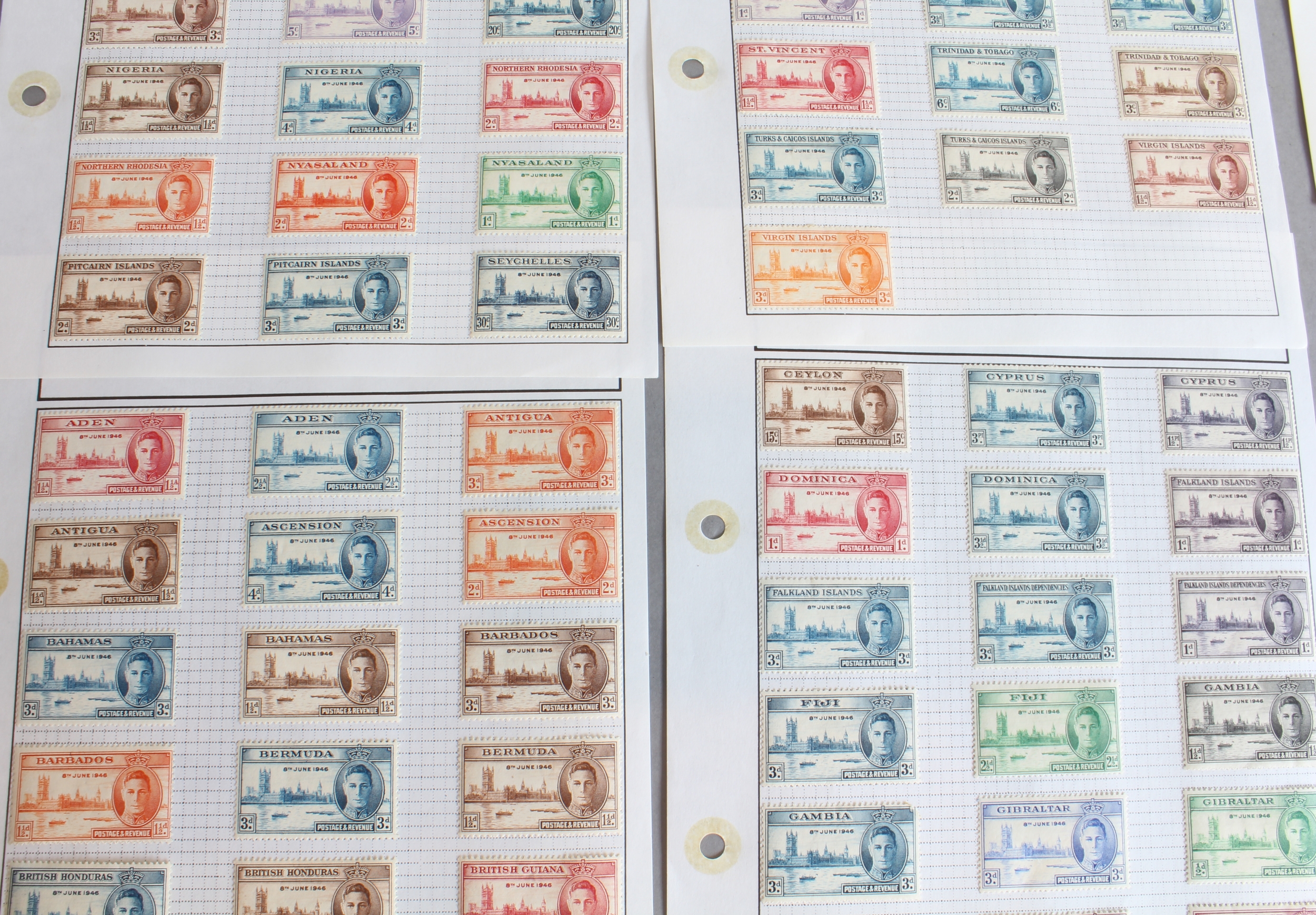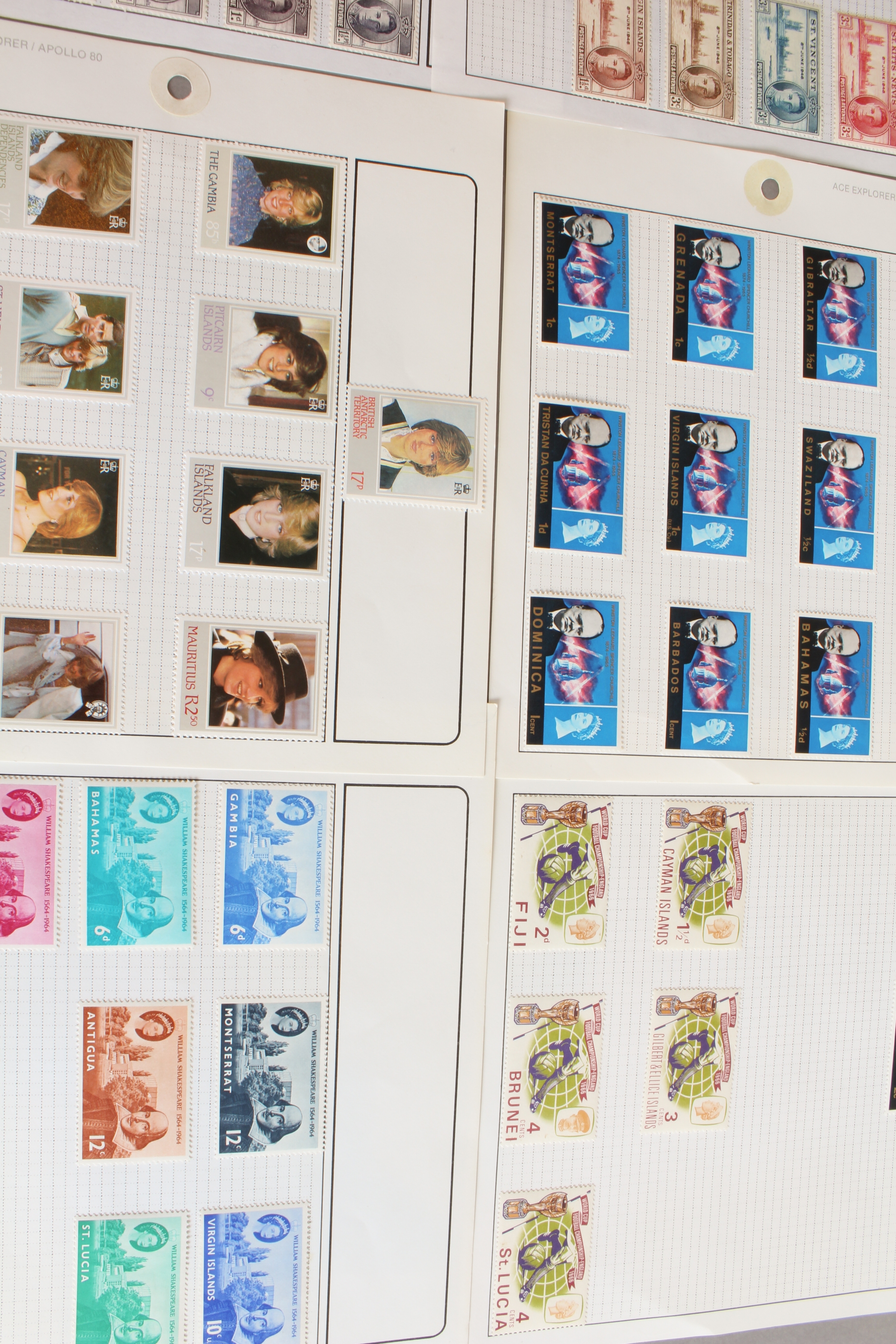 3. 136 mint British Colonial and Dominion stamps mounted on 8 sheets and comprising 63 x 1946 Victory stamps, 12 x 1964 William Shakespeare, 20 x 1965 Winston Churchill, 5 x 1966 World Cup and 17 x 1982 Princess Diana. (Aden, Antiqua, British Honduras, Cyprus, Ceylon, Fuji, Gambia, Jamaica, Sierra Leone, St Lucia, St Vincent, Seychelles etc.)