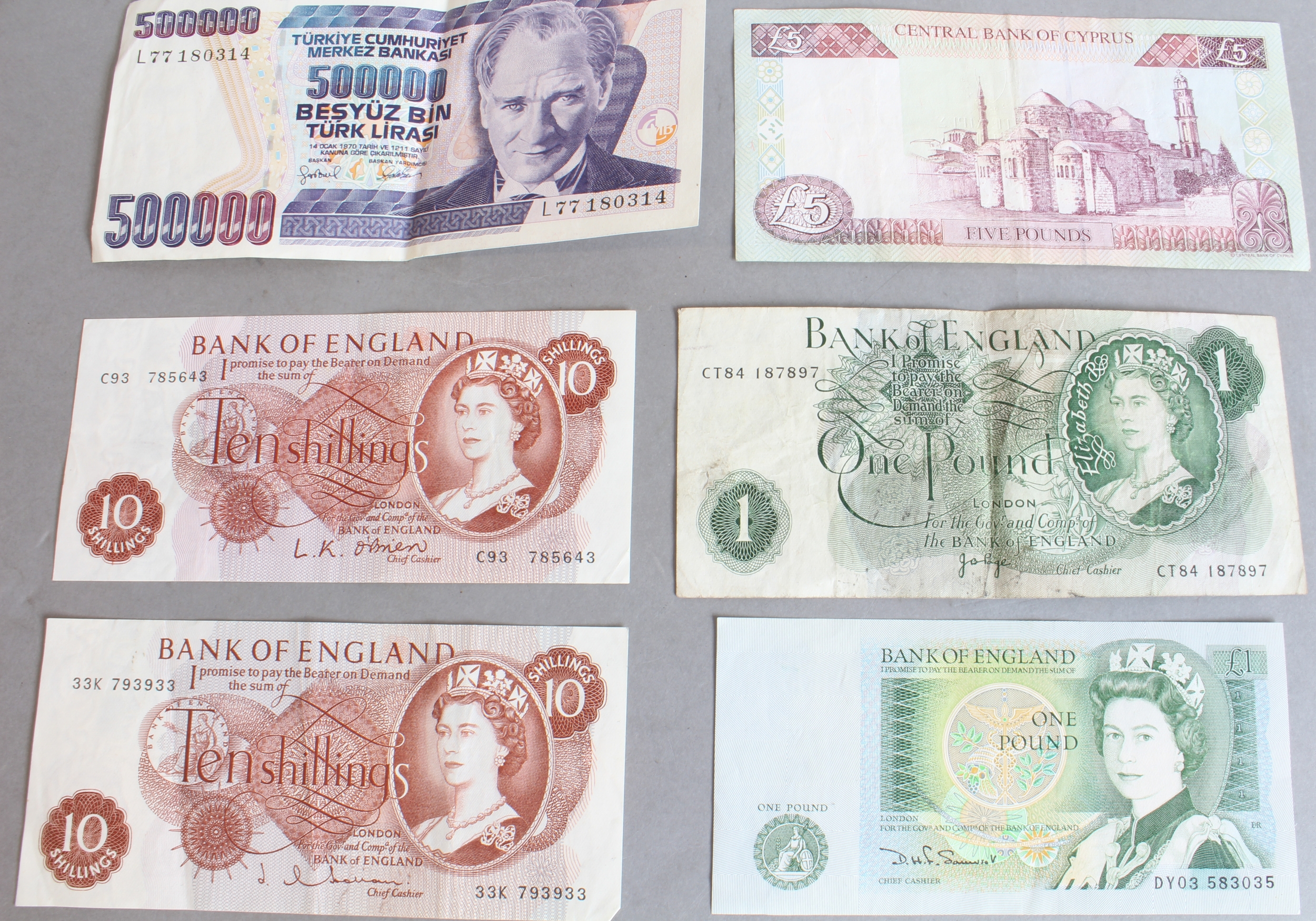 4. a 1970s and a 1980s £1 note; a 1950s and a 1960s (33K 793933) 10 shilling note; Central Bank of Cyprus - 2 x £1, 1 x £5 and 1 x £10); Turkey - 2 x 500,000 lira and 2 x YTL.