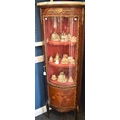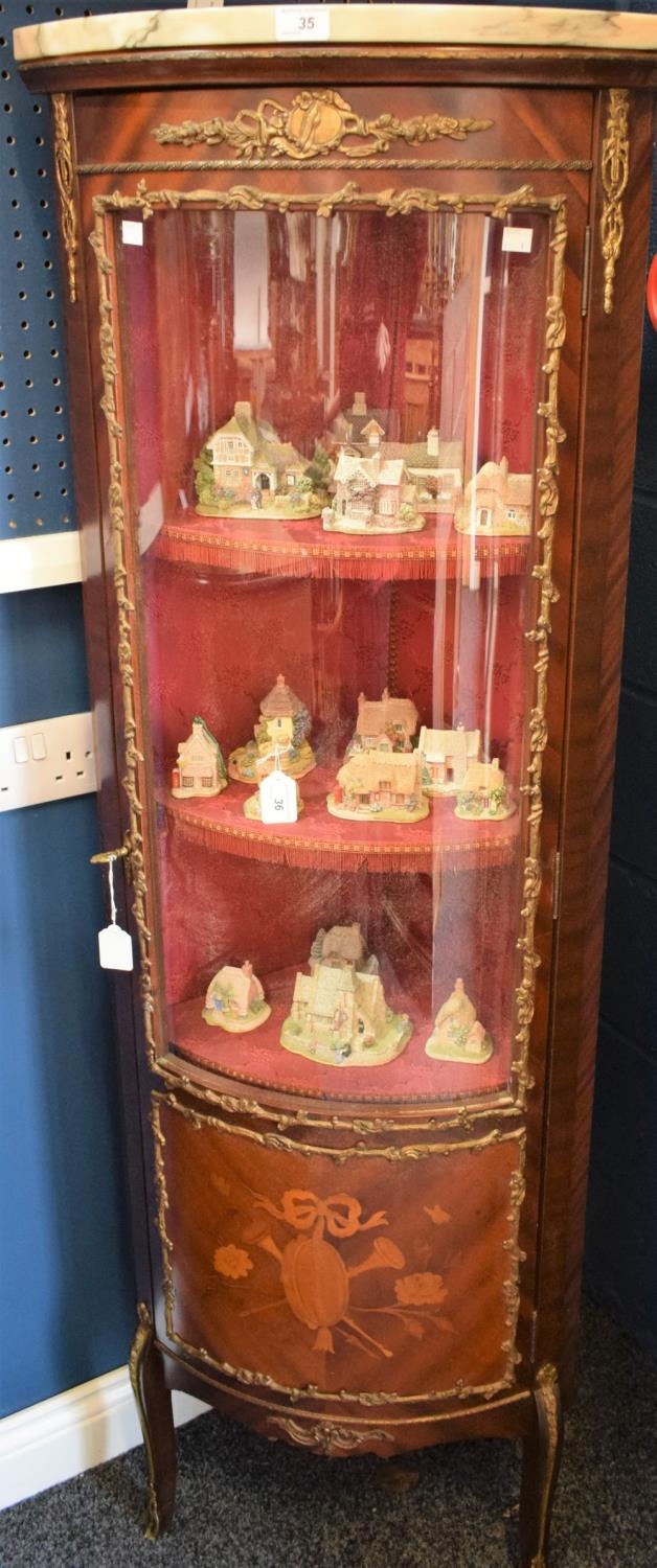 A Louis XVI Revival 'gilt' metal mounted corner vitrine/display cabinet, marble top above a three-quarter glazed door enclosing three shelves, the lower panel inlaid with a musical trophy, straightened serpentine forelegs, 159.5cm high