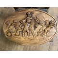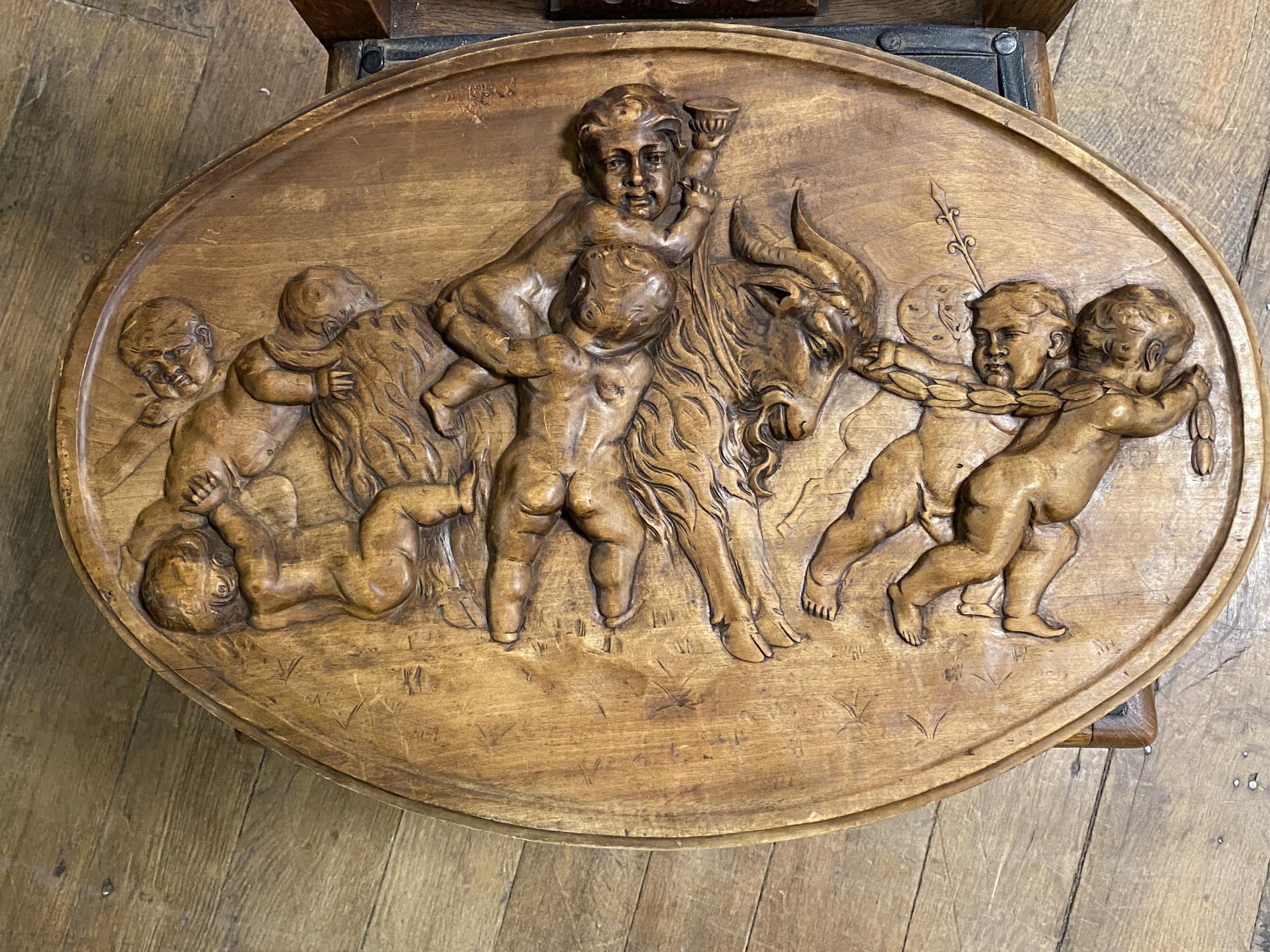 A Continental carved wood oval panel, decorated putti riding a goat, 44 x 63 cm